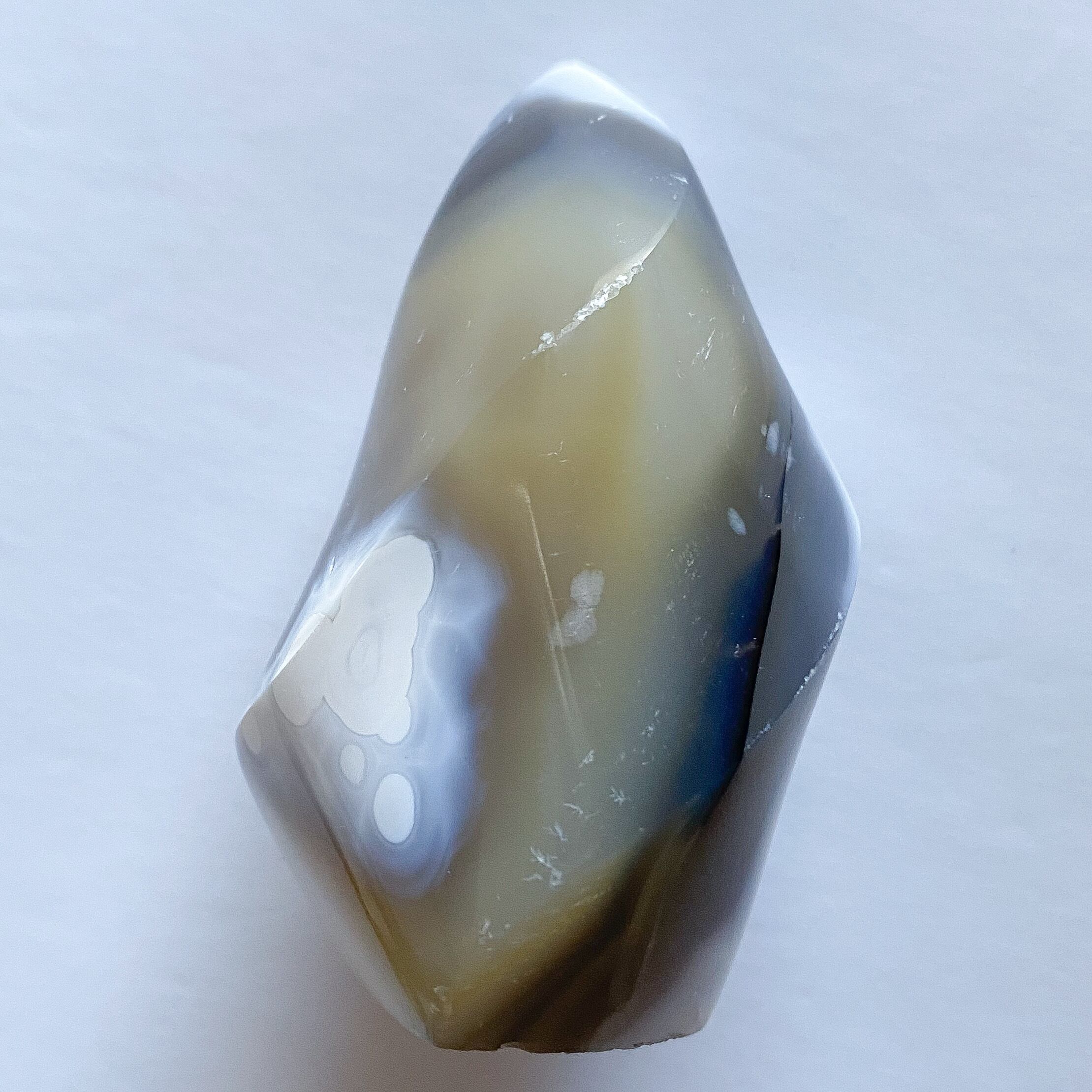 名前の通り、瑪瑙の様々な地色の上にオルカのような真っ白な模様が入ります。近くで見てみると模様の境目はスプレーを吹いたか筆で擦ったような柔らかさで、力強い色の中にどこかほっと癒されるような可愛らしさも感じられます。