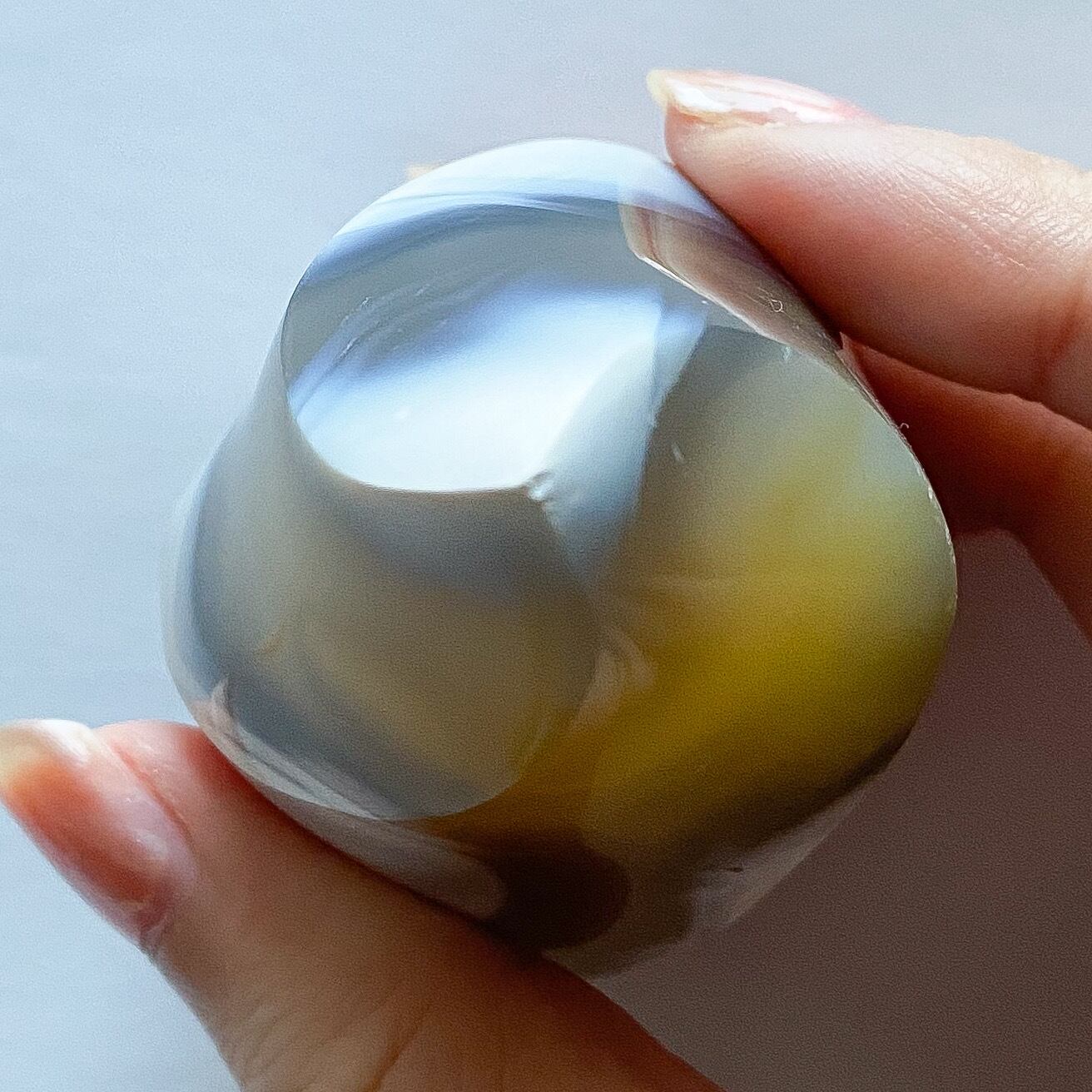 地色は淡いグレージュカラーでやや透明感のある瑪瑙にオルカのホワイト柄が入ります。
