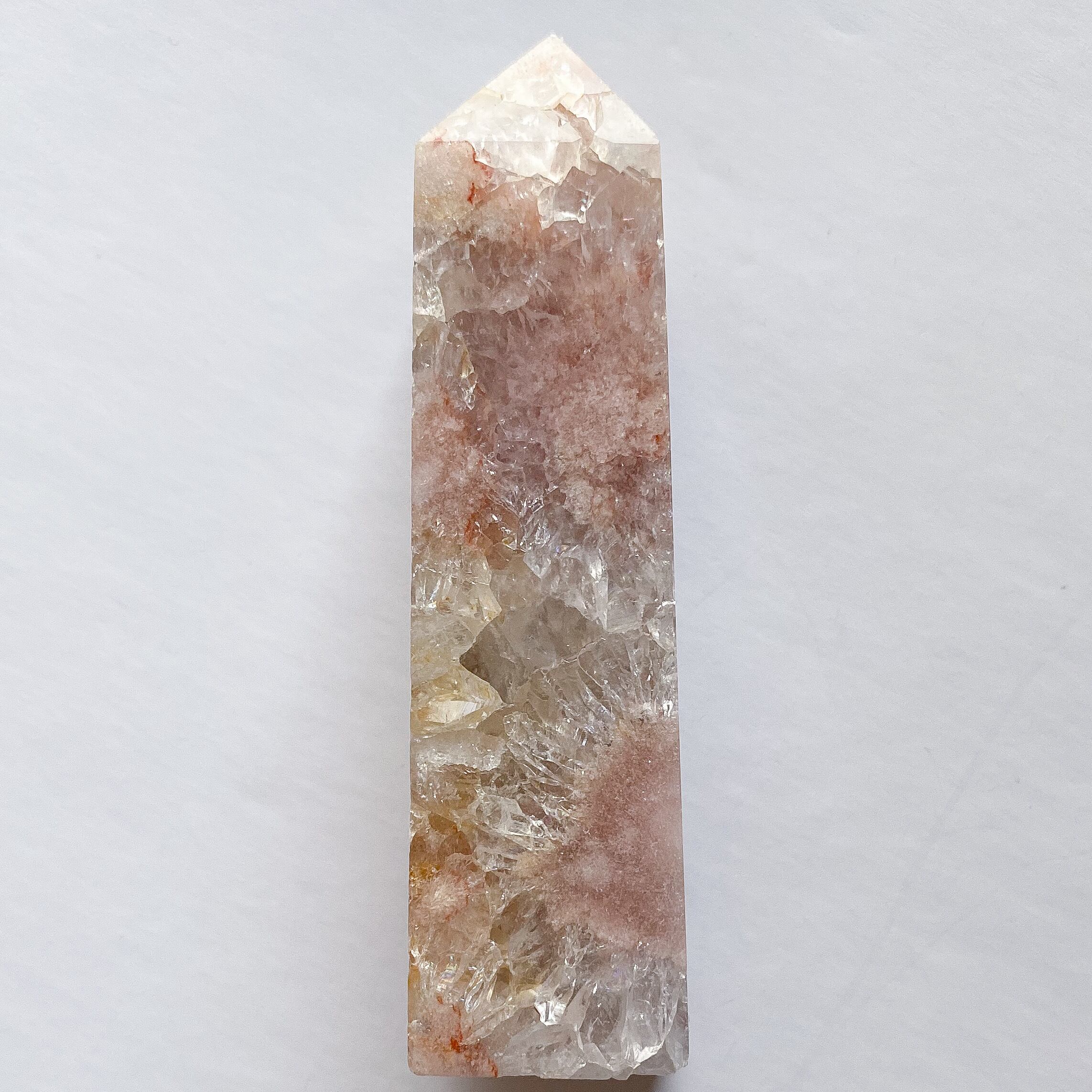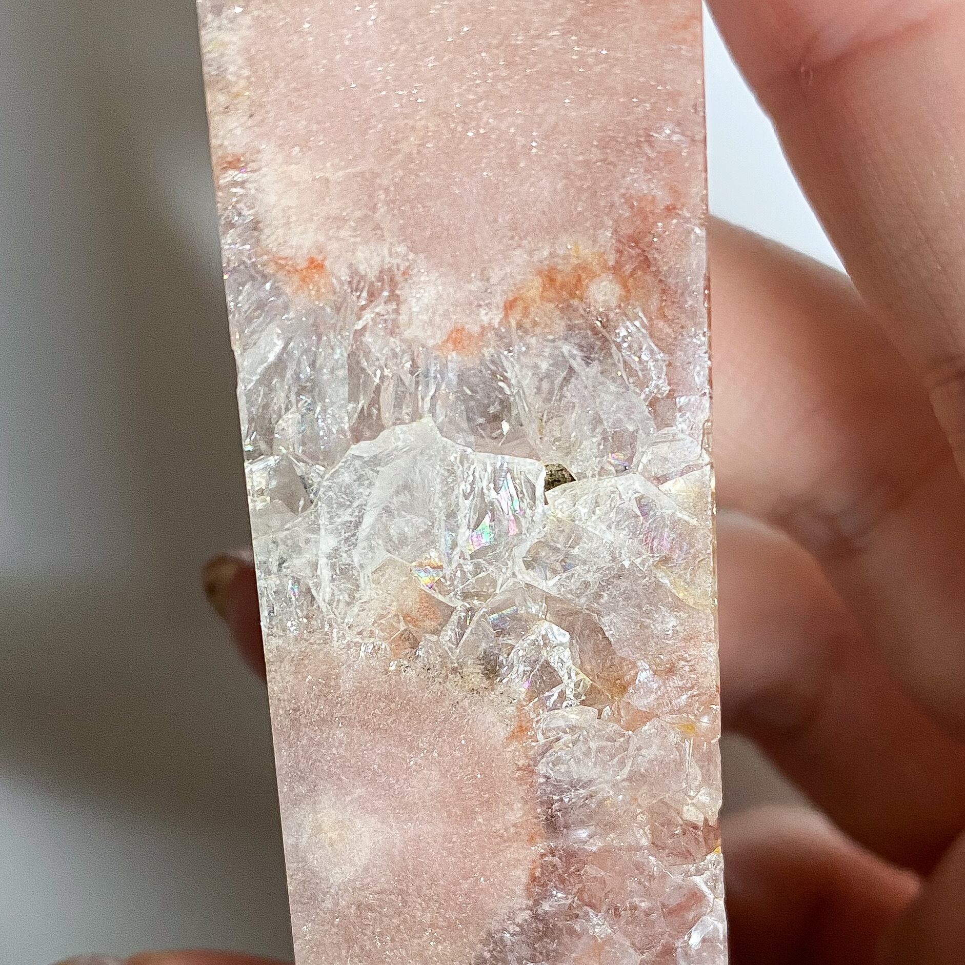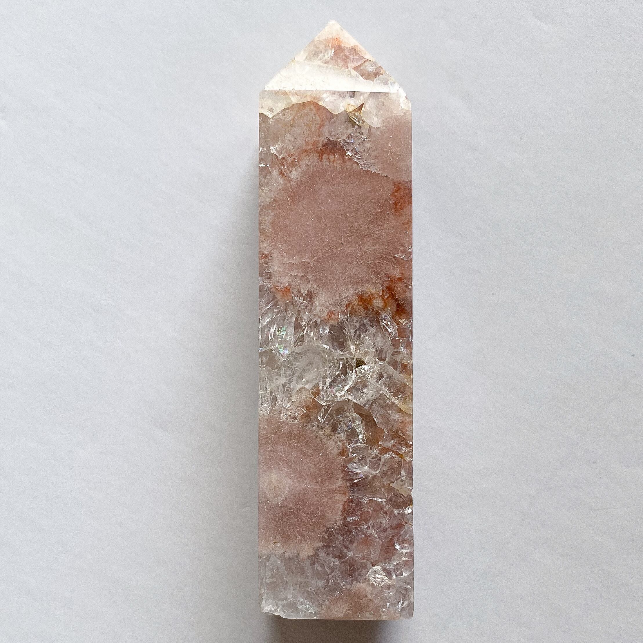 白い部分はフラワーアゲートで、3つの鉱物が共生している華やかなタワーとなります。メインカラーはピンクベージュで、他にオレンジ、イエロー、ブラウン、グレーなどのカラーが混じります。全体的には落ち着いたモーヴカラーに見えるのですが、花びら状に広がるクォーツ結晶部分に見られる沢山の細かな虹とキラキラ感がタワー全体を明るく可愛らしく見せてくれています。