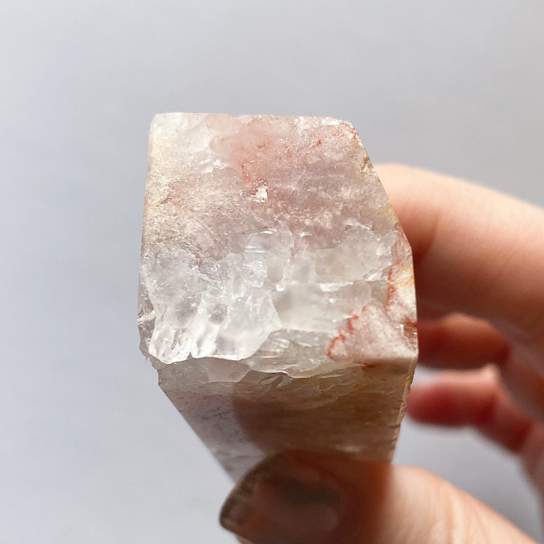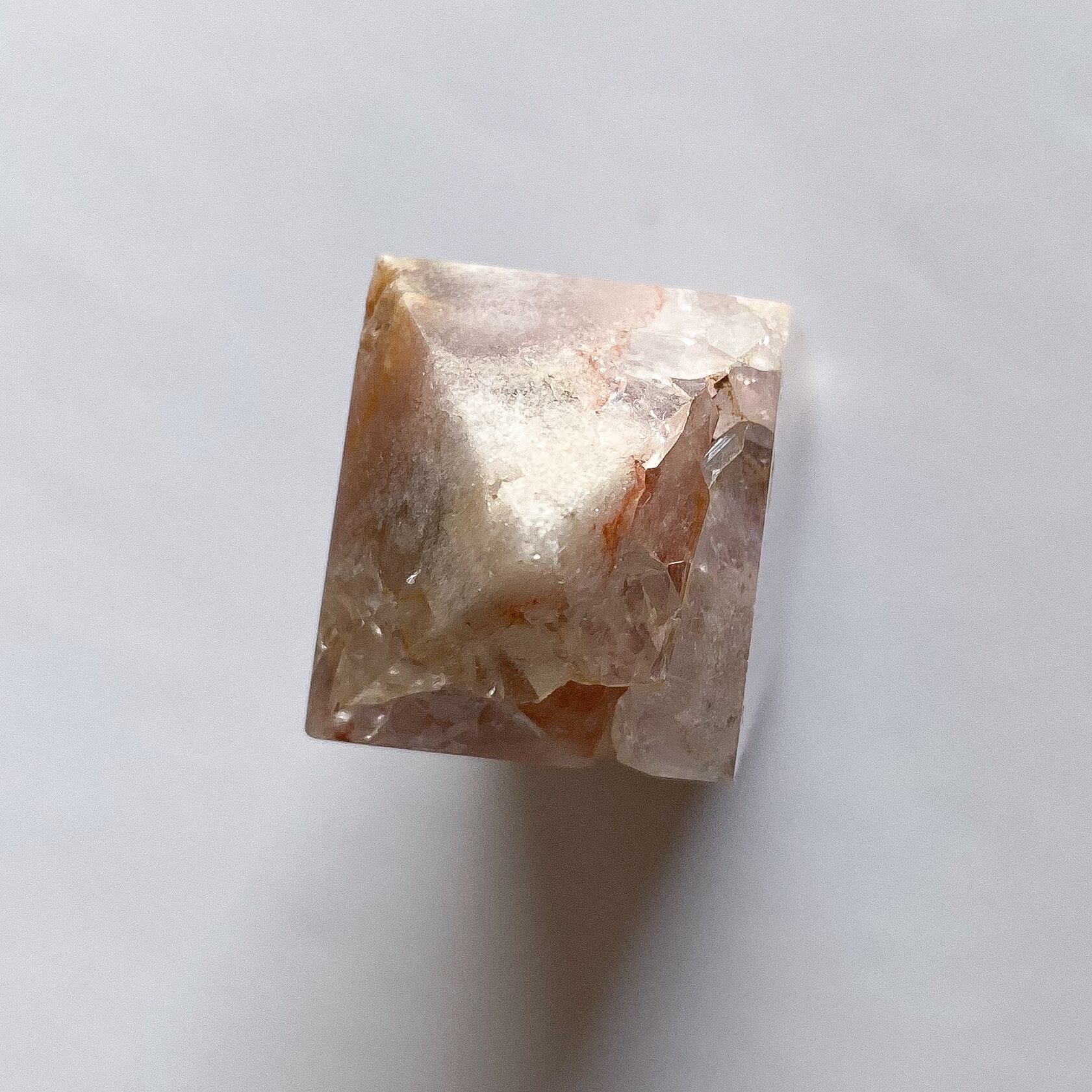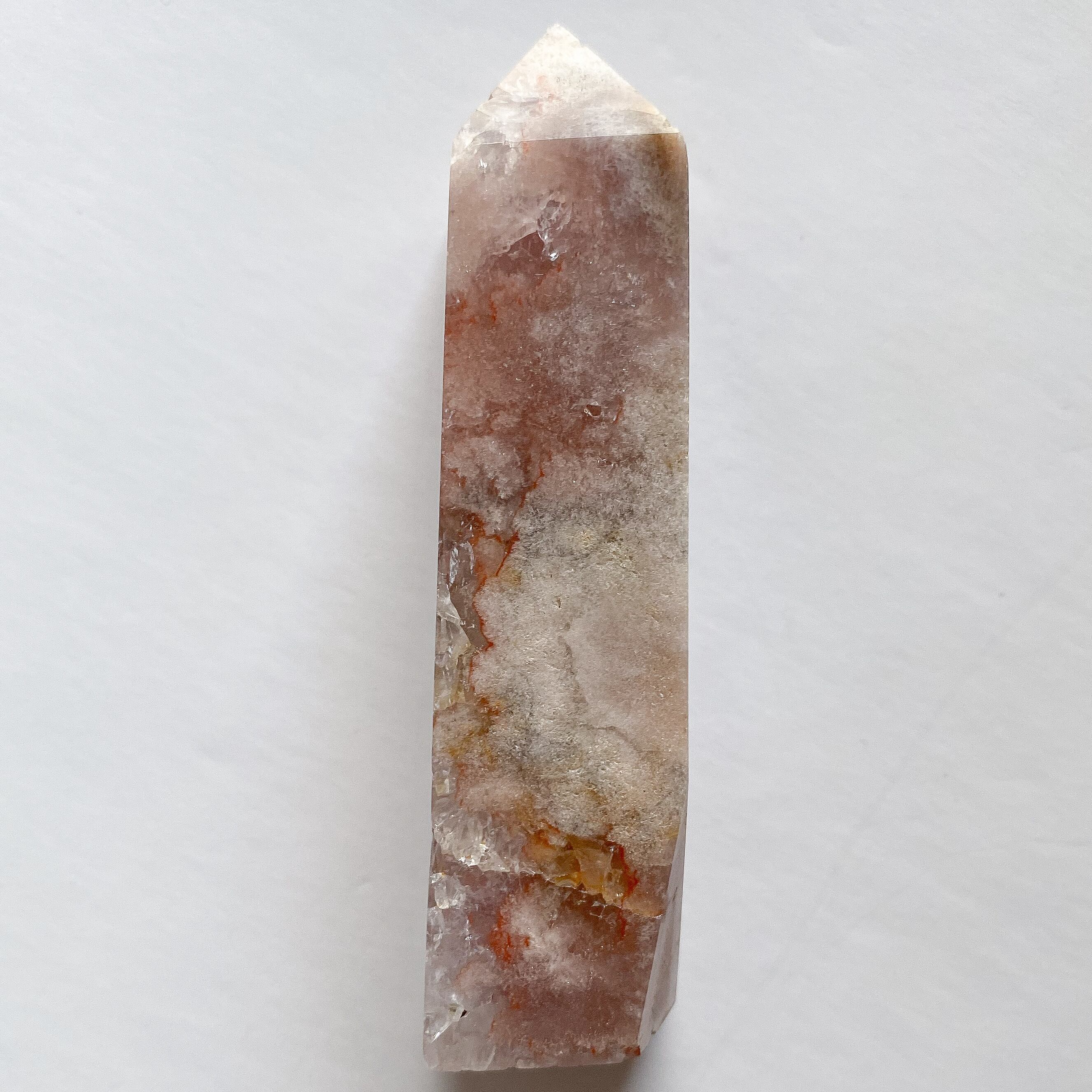 白い部分はフラワーアゲートで、3つの鉱物が共生している華やかなタワーとなります。メインカラーはピンクベージュで、他にオレンジ、イエロー、ブラウン、グレーなどのカラーが混じります。全体的には落ち着いたモーヴカラーに見えるのですが、花びら状に広がるクォーツ結晶部分に見られる沢山の細かな虹とキラキラ感がタワー全体を明るく可愛らしく見せてくれています。