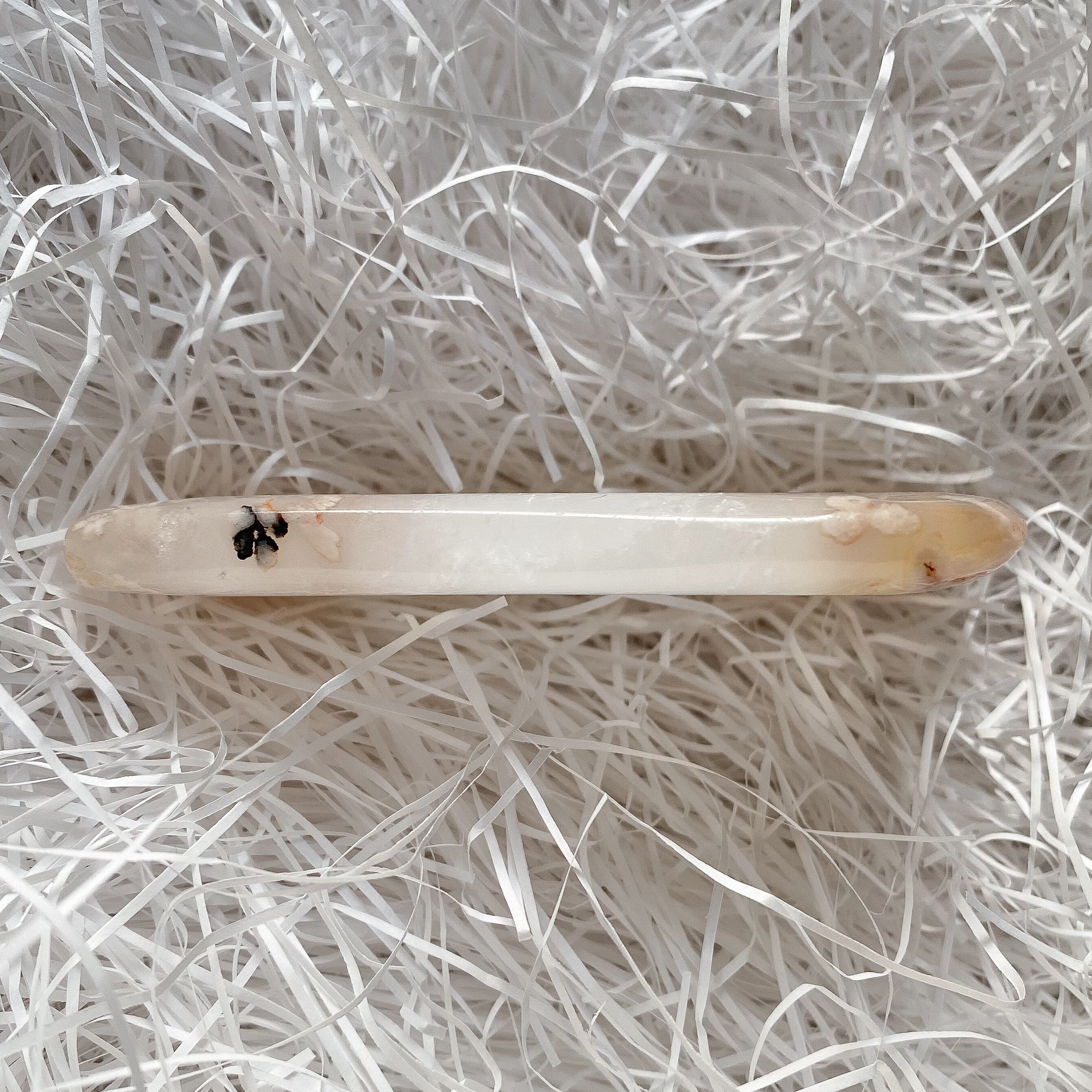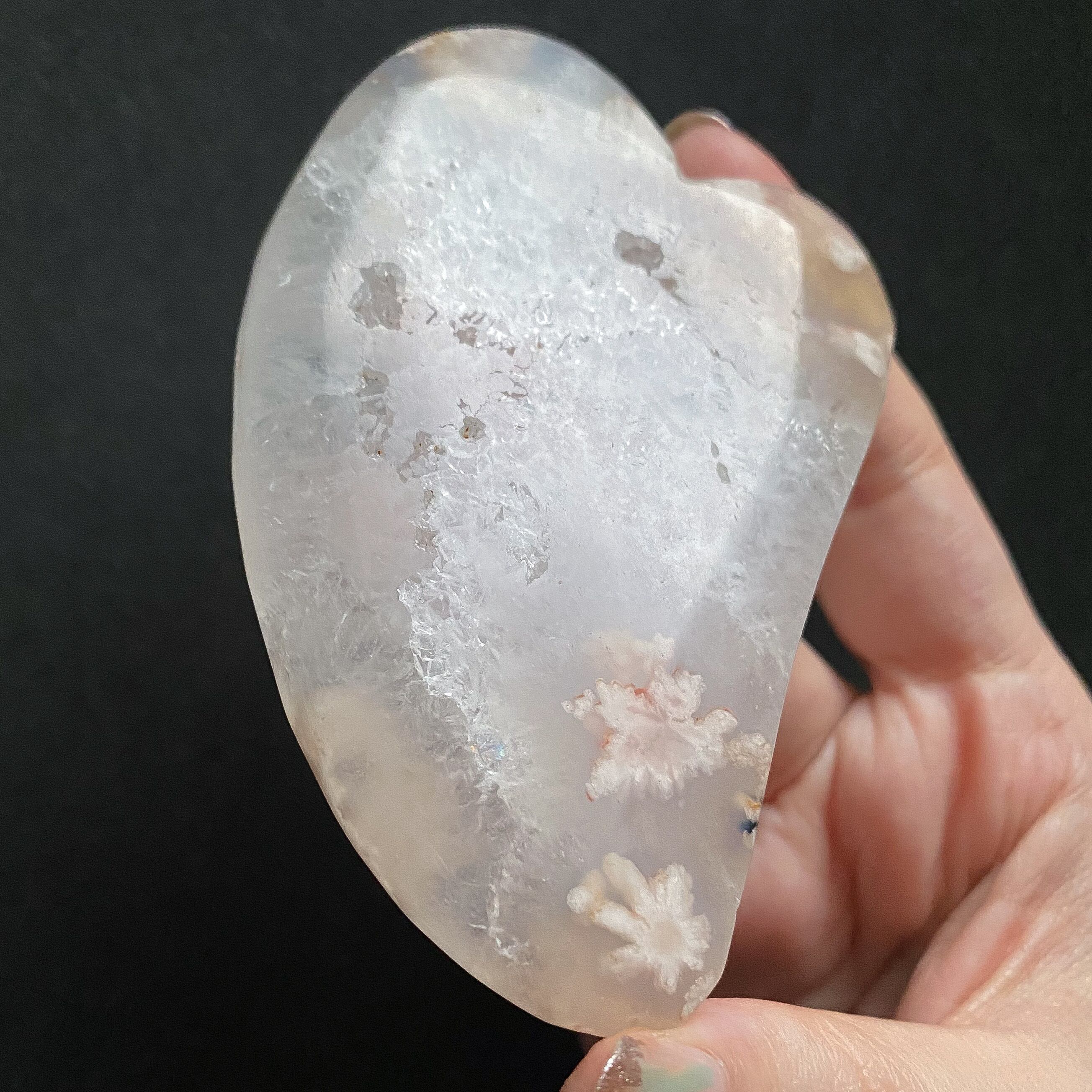 ほぼクォーツ結晶質のフラワーアゲートで、瑪瑙部分に小花が咲いています。