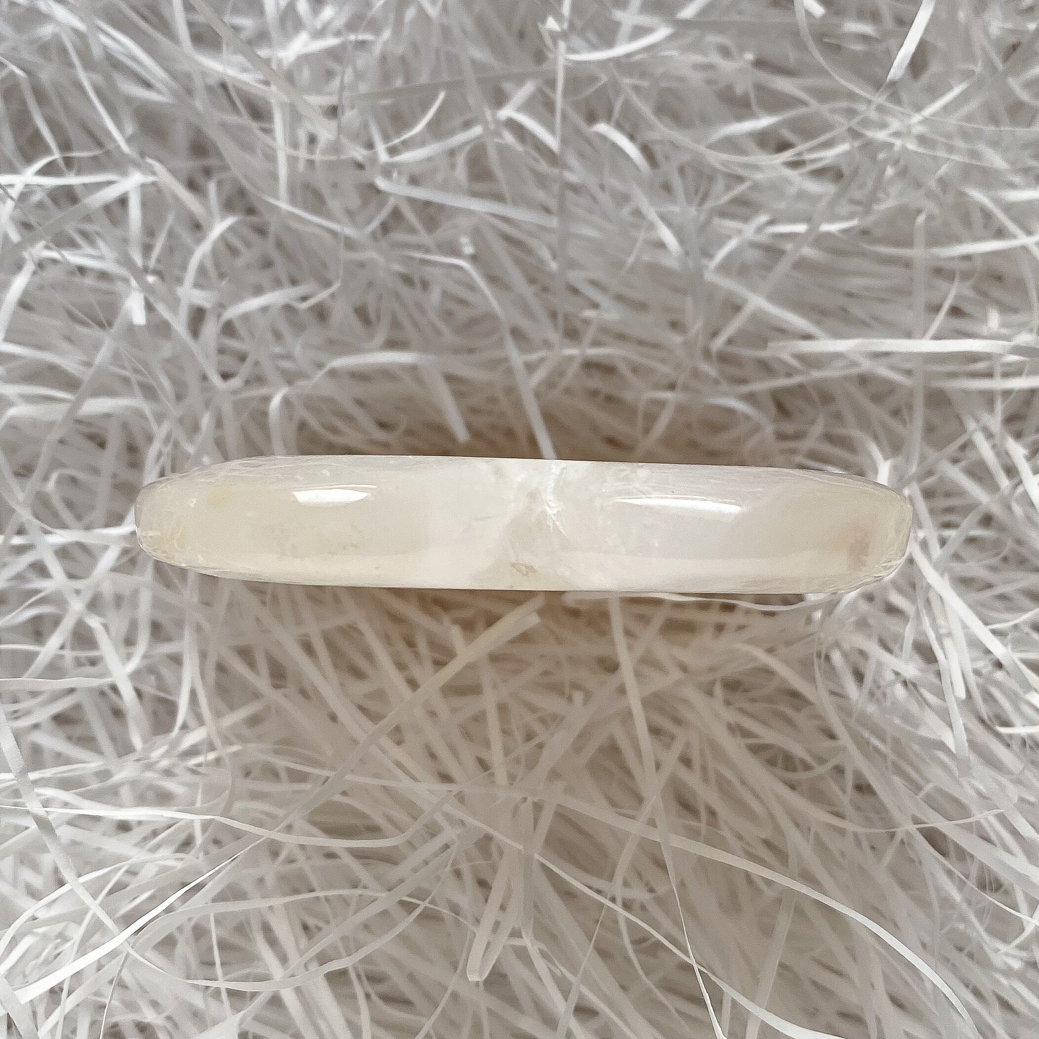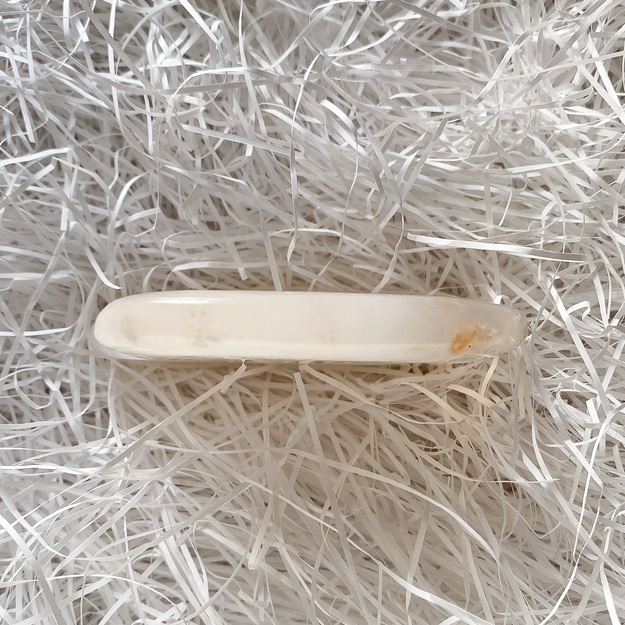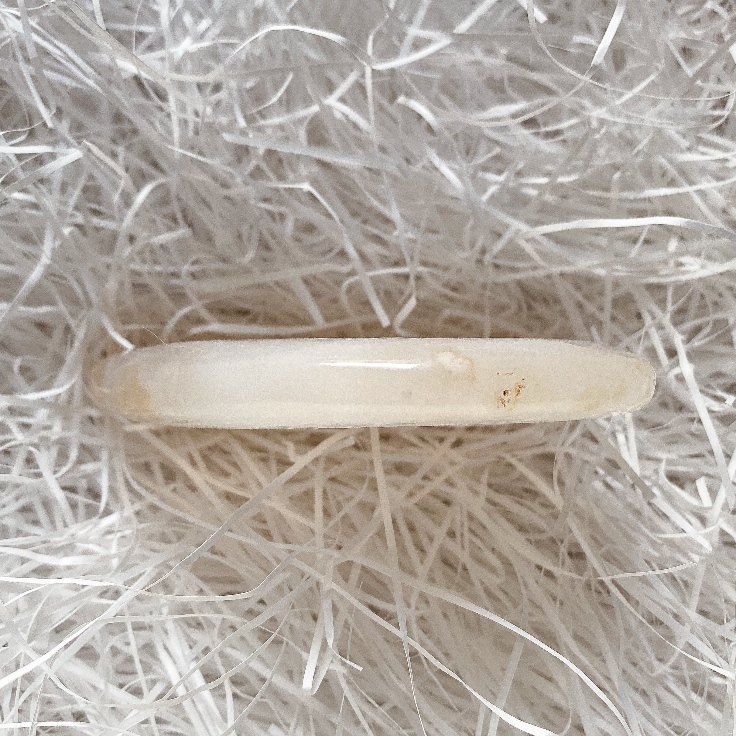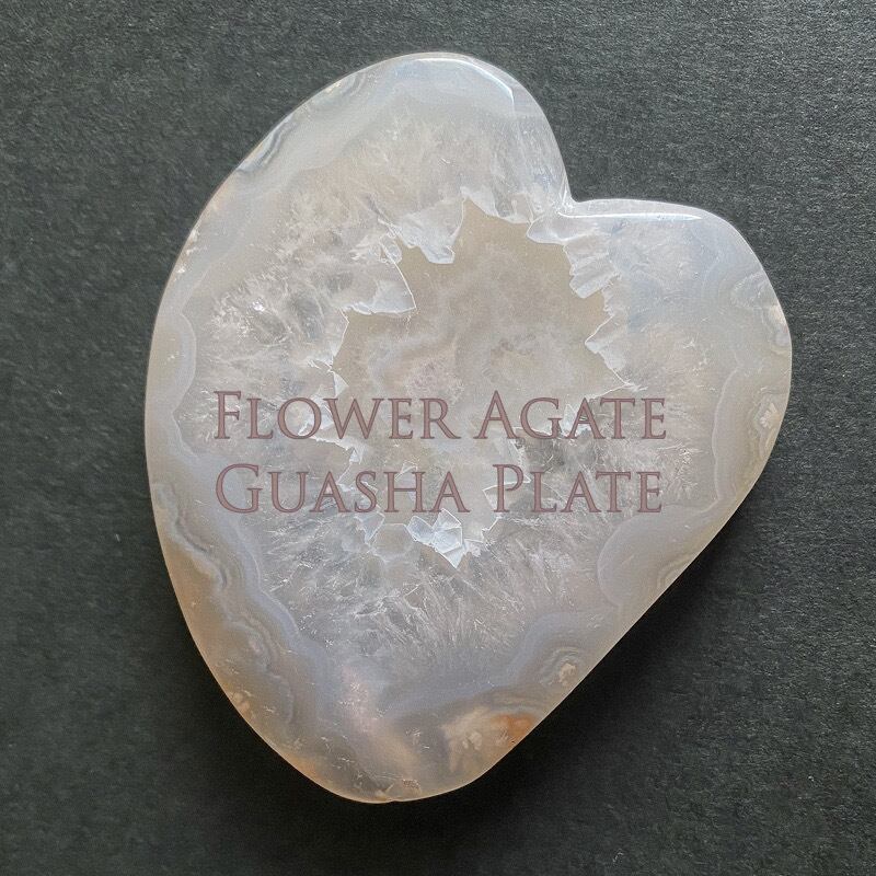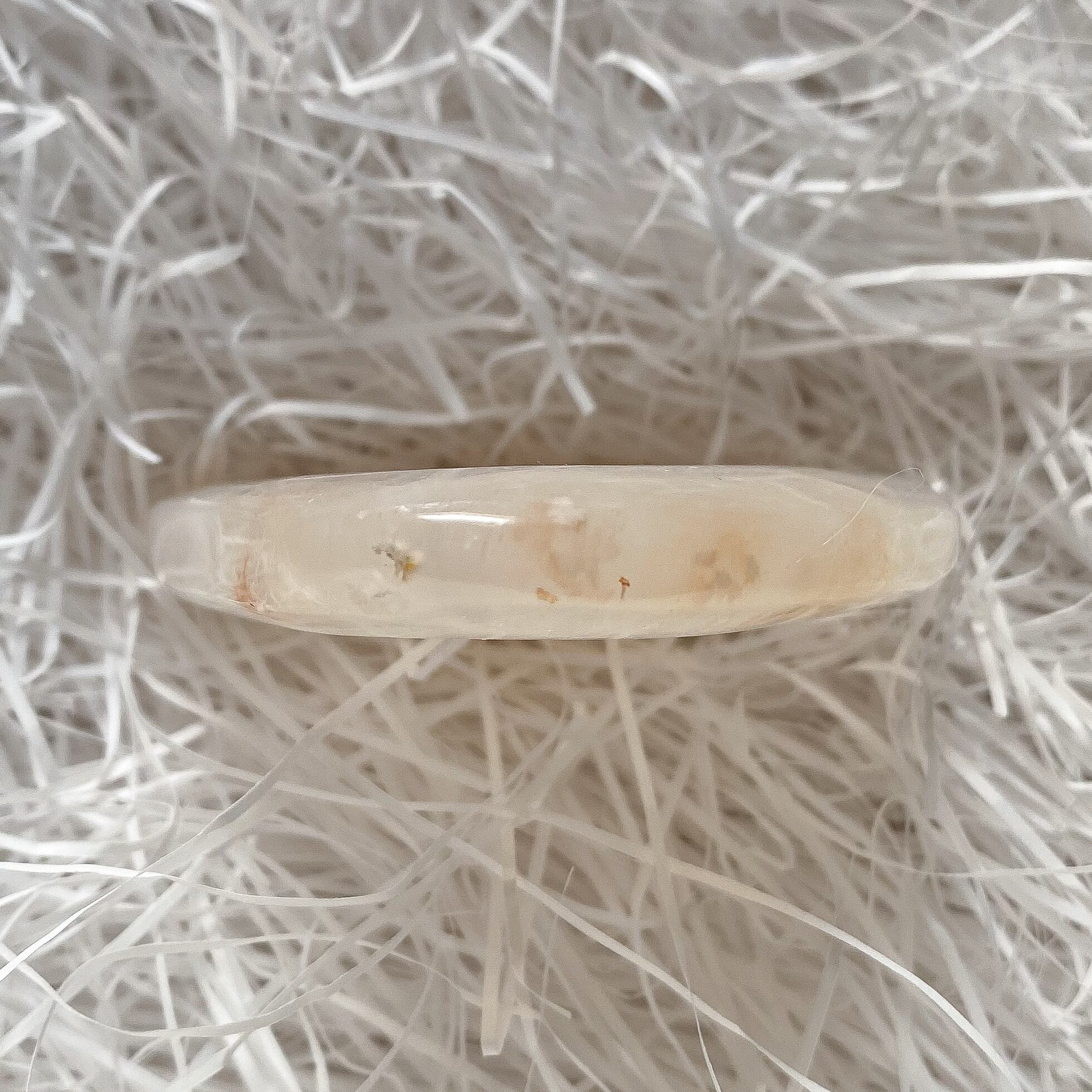 中心部分に向かって模様が広がるフラワーアゲートです。こちらもクォーツ質の部分が多く、全体が半透明のクリームカラーとなります。瑪瑙の柔らかな曲線とクォーツの直線的な結晶が織りなす特有の模様がレース柄のようで淡いカラーも相俟って儚げな印象のあるかっさプレートです。