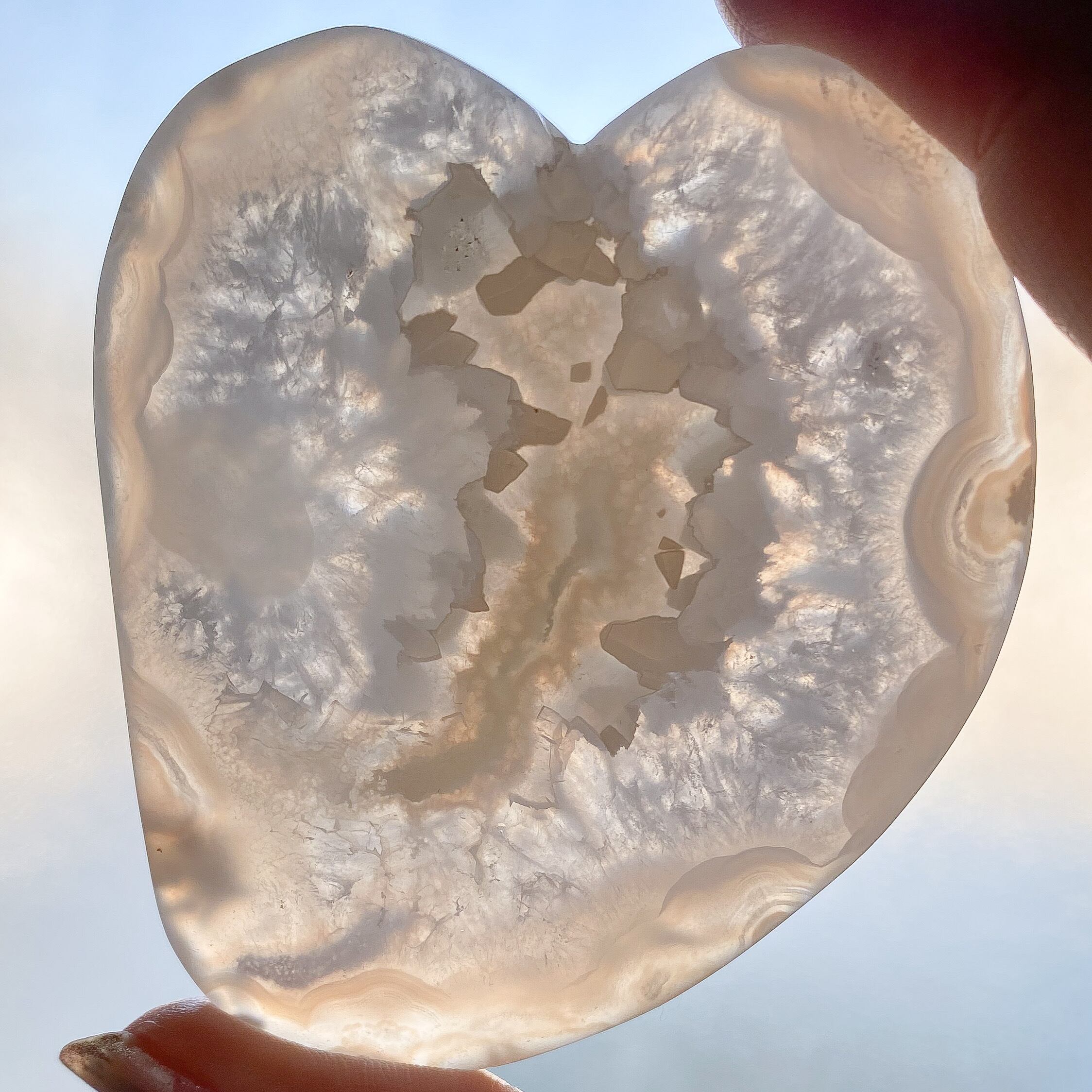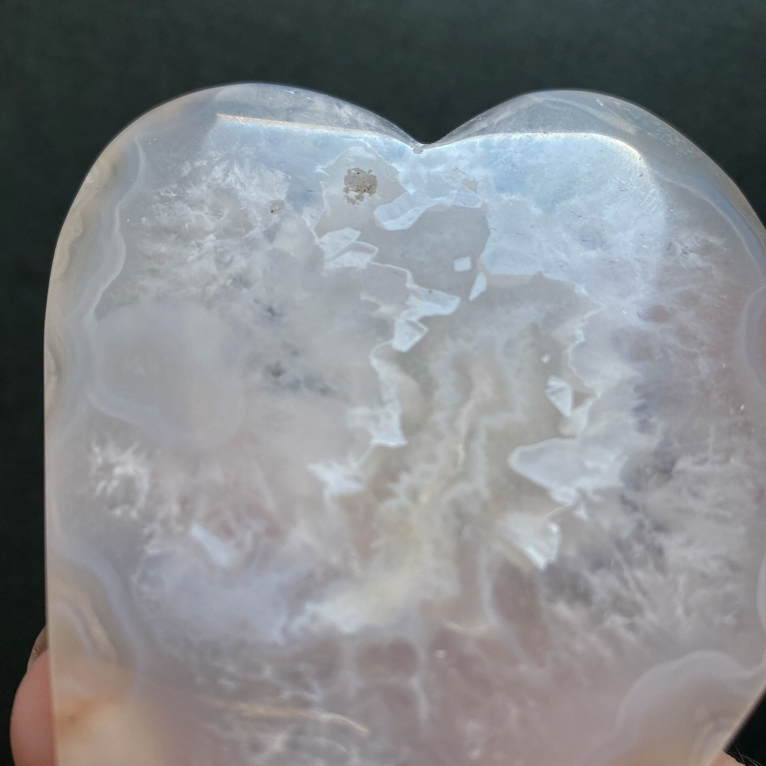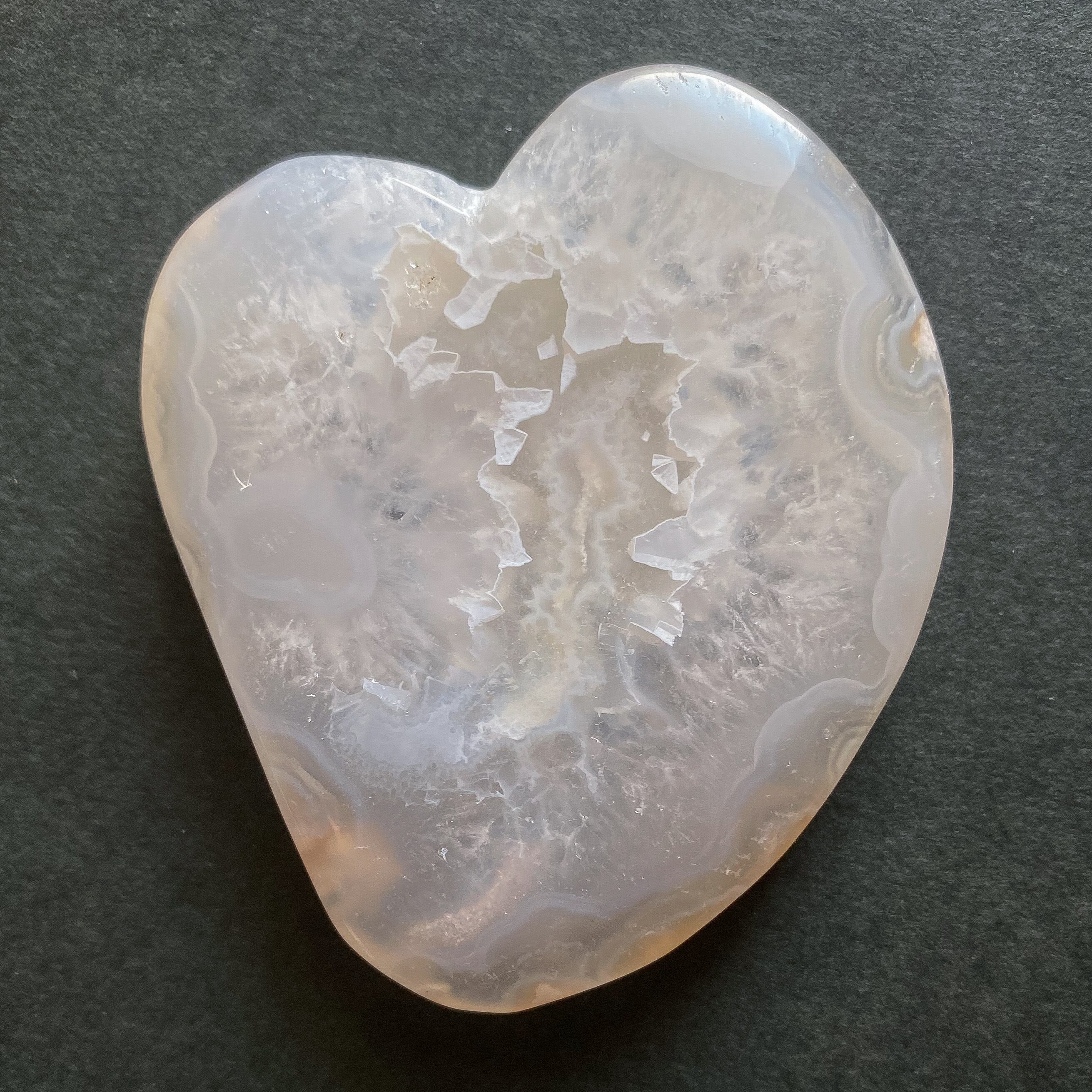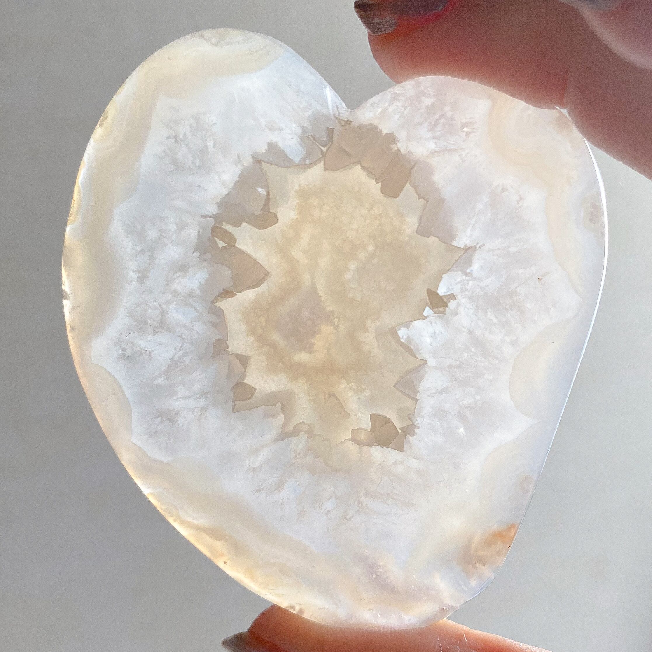 中心部分に向かって模様が広がるフラワーアゲートです。こちらもクォーツ質の部分が多く、全体が半透明のクリームカラーとなります。瑪瑙の柔らかな曲線とクォーツの直線的な結晶が織りなす特有の模様がレース柄のようで淡いカラーも相俟って儚げな印象のあるかっさプレートです。