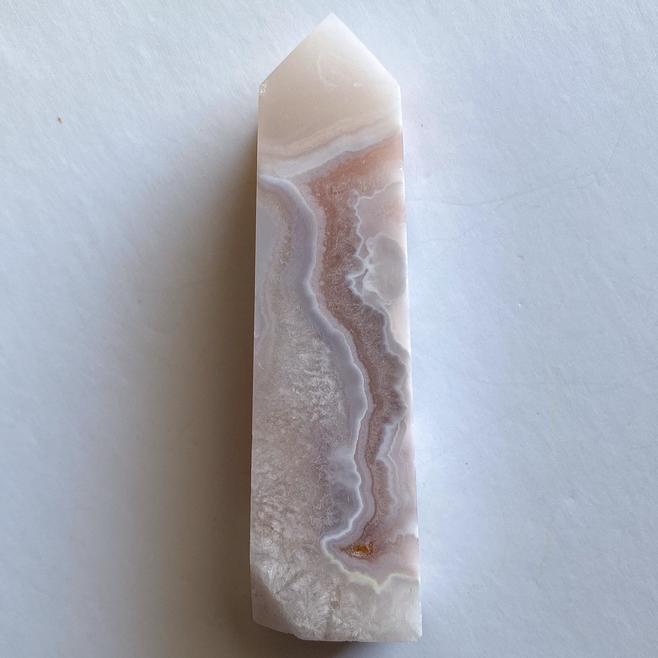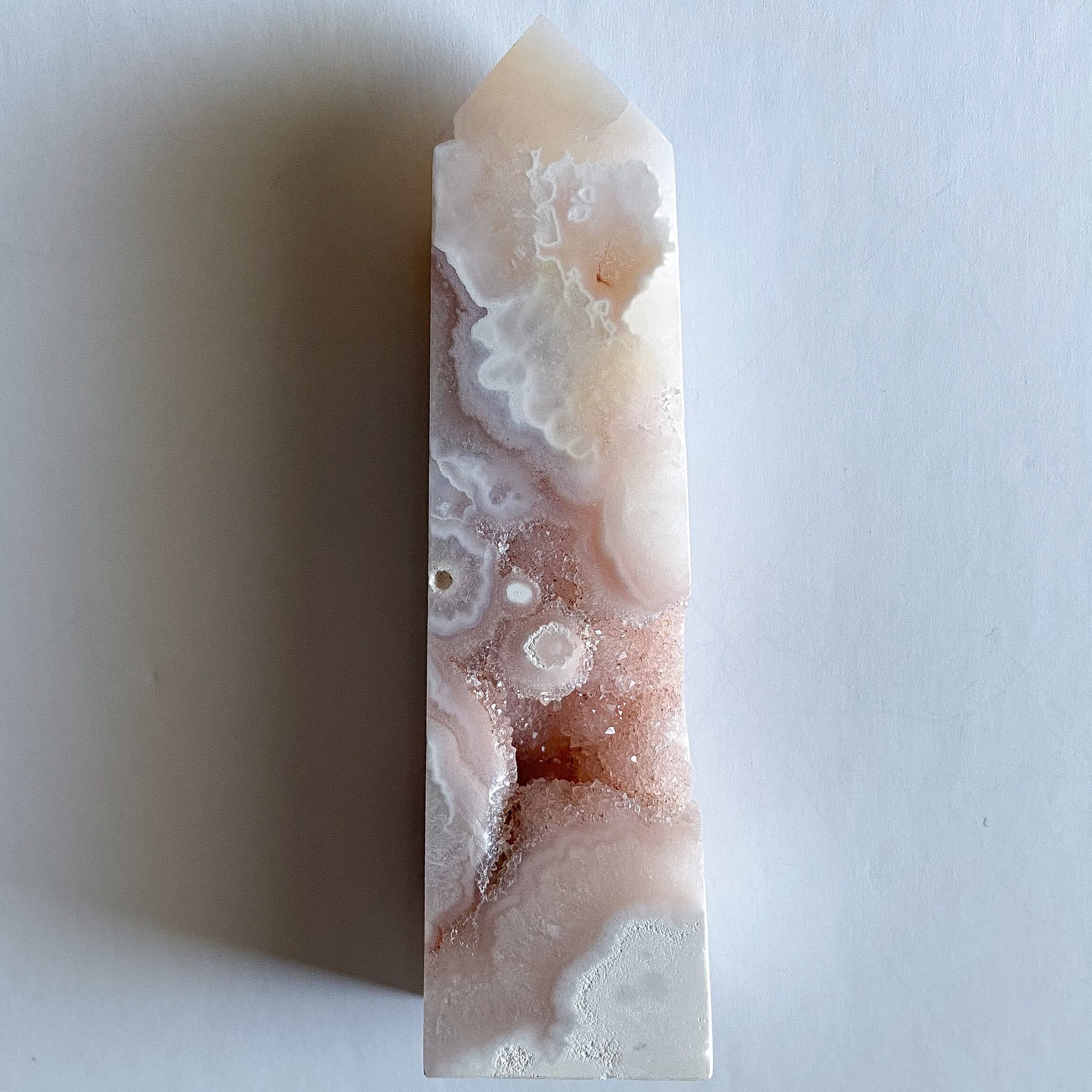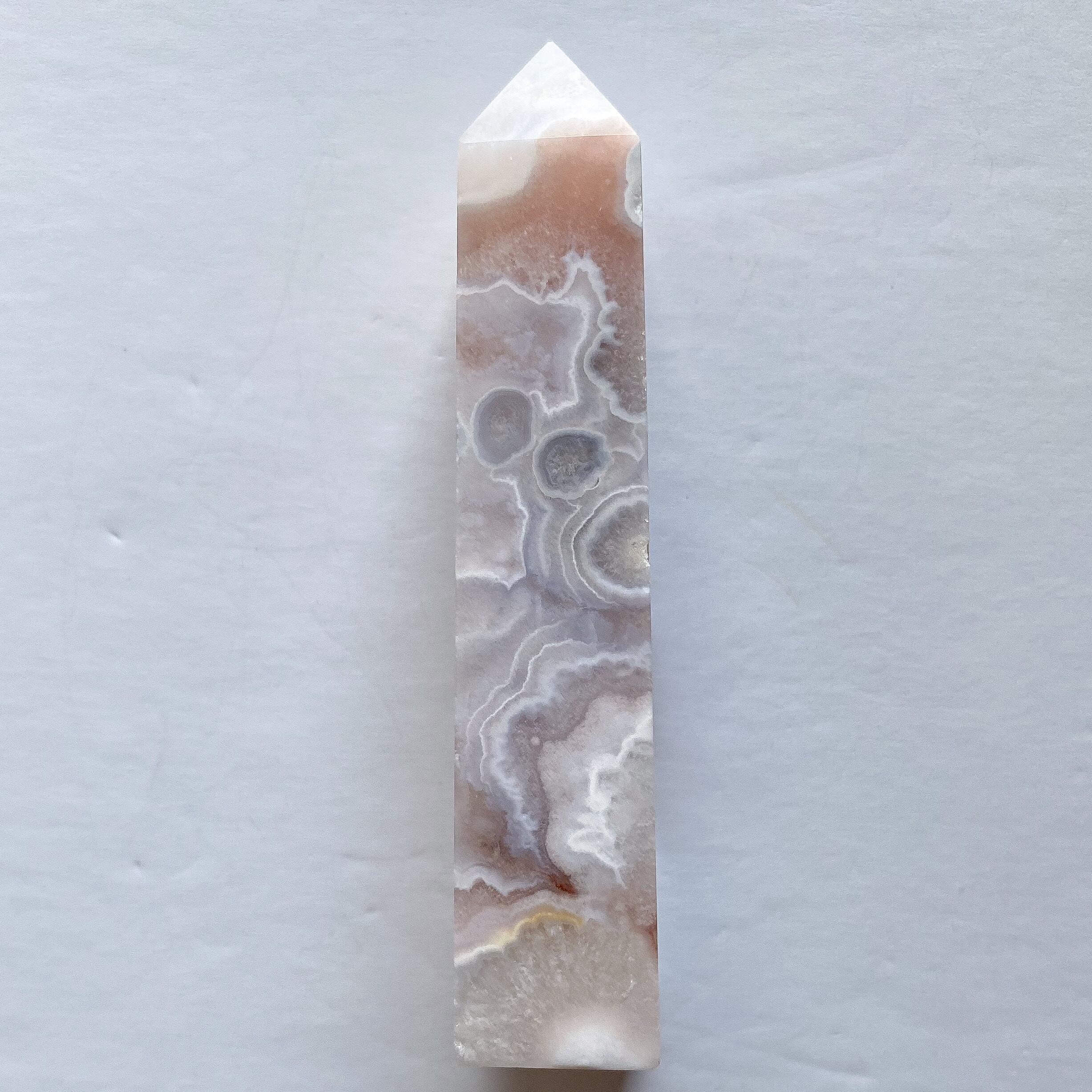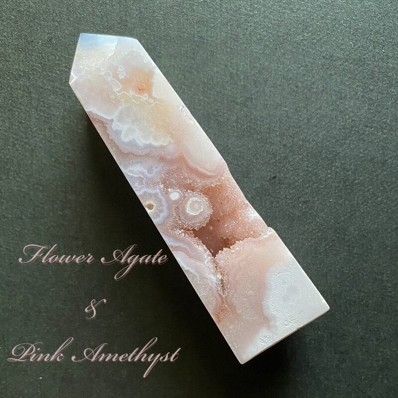 ピンクアメジストの可愛らしいカラーと瑪瑙の作り出す個性的な模様が共存しているタワーです。