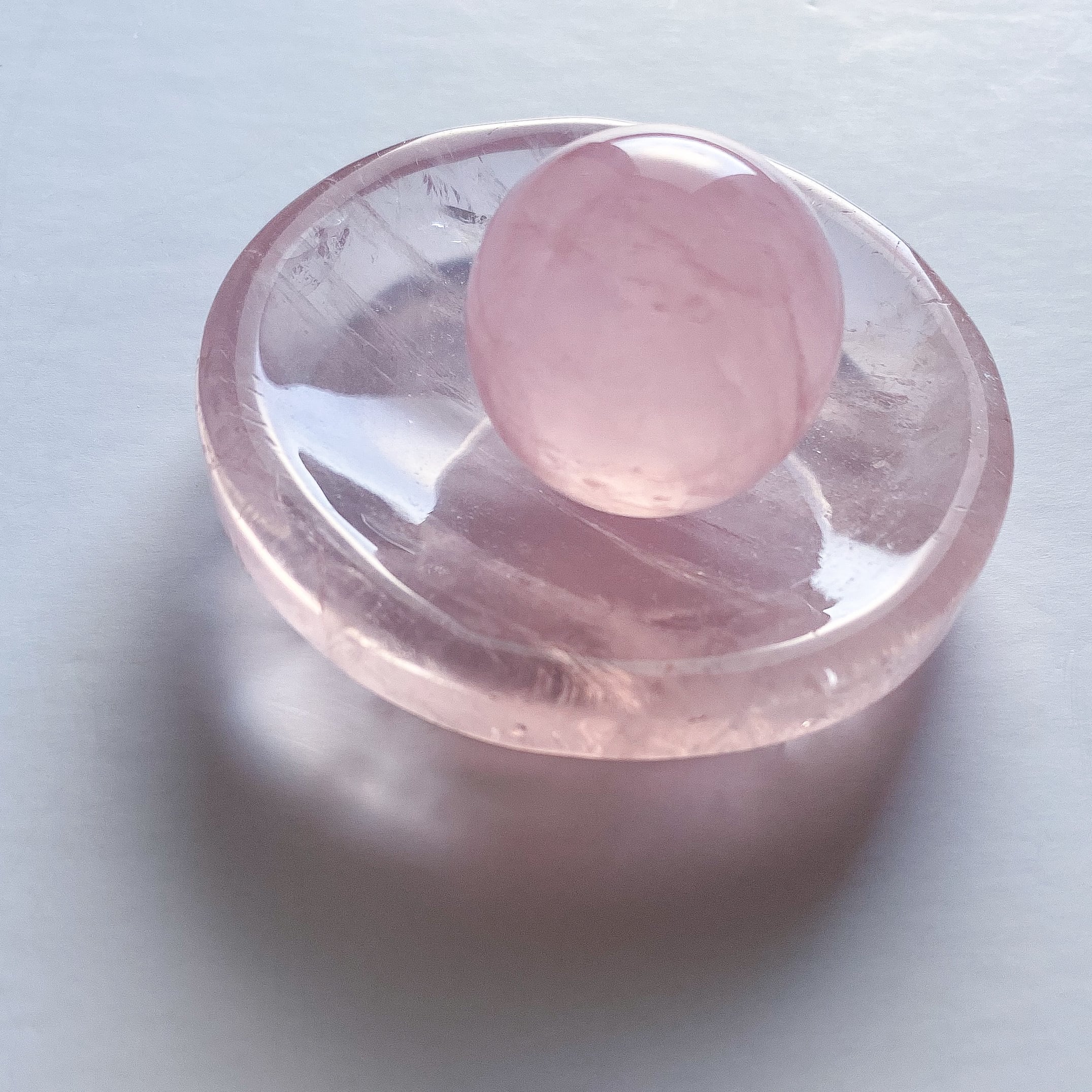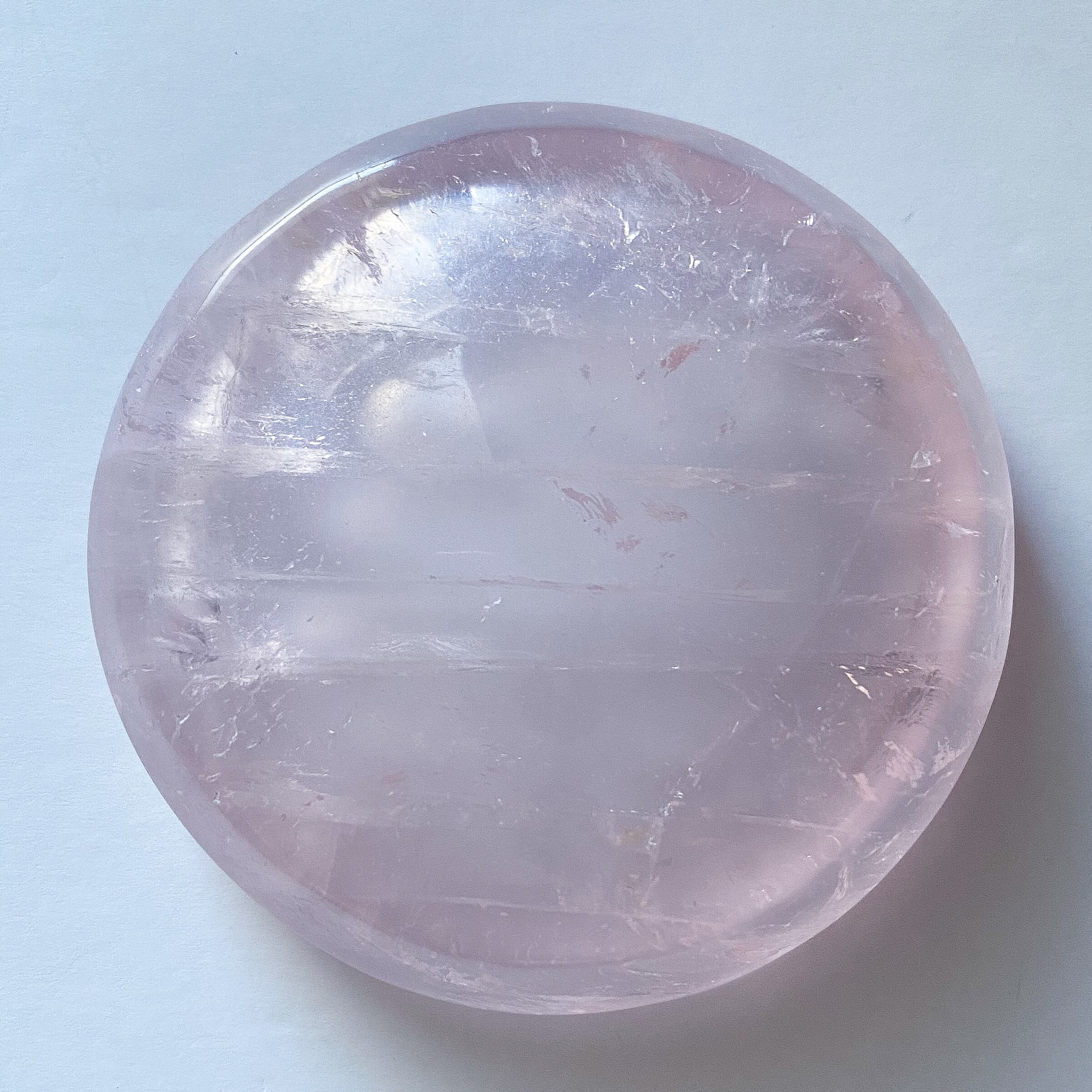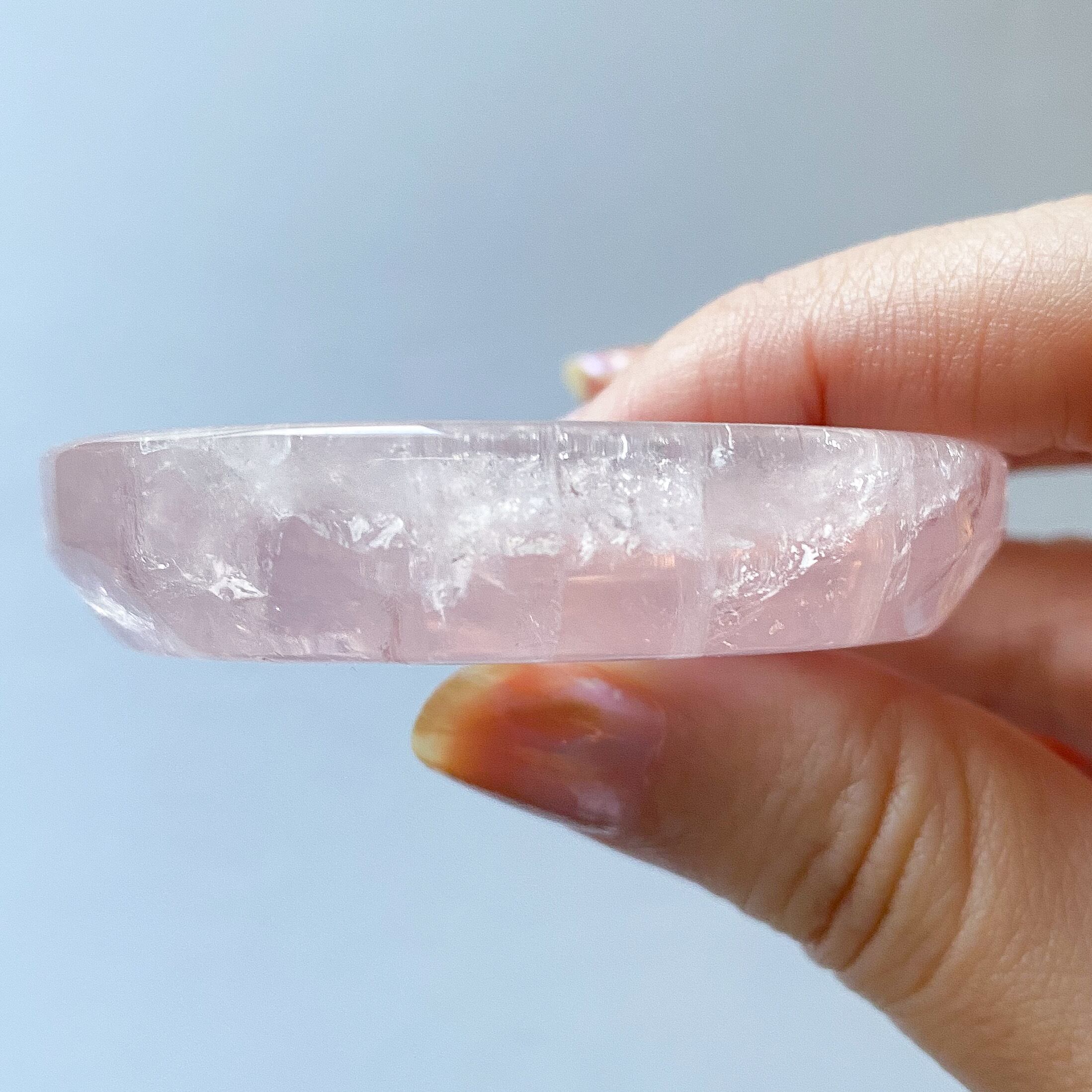 小振りなサイズ感ですが質の良い水晶のような透明感の中に色付くピンクが可愛らしく、ラウンド型ですのでスフィアの台座としてや小さなカービング、ビーズ、アクセサリーを置いて頂く等、多岐にご使用頂けるラウンドトレイだと思います。