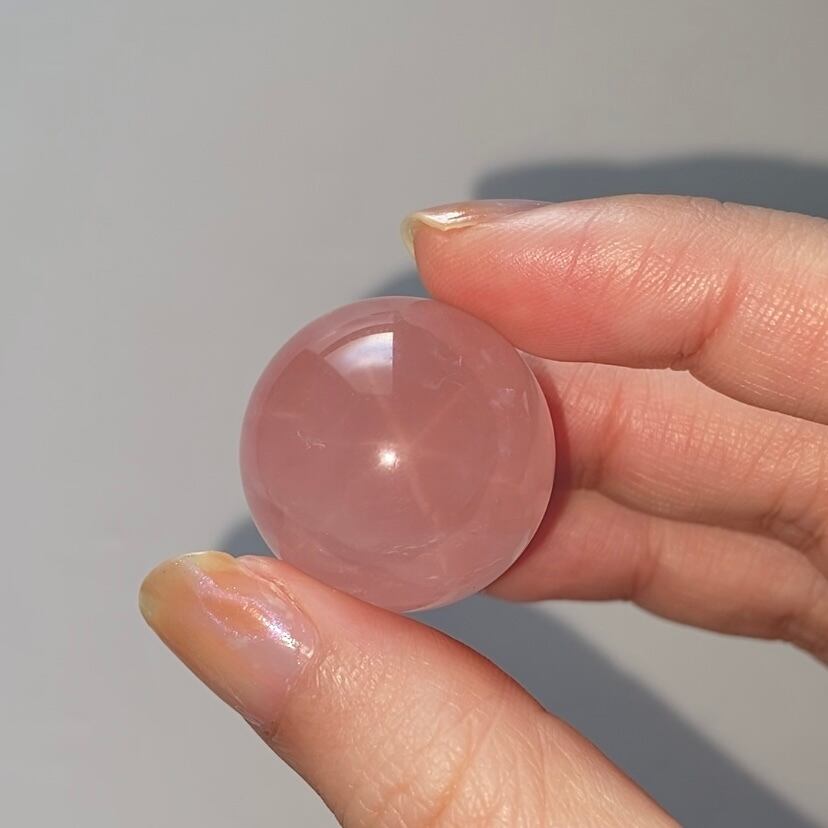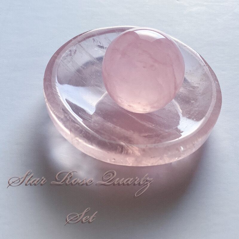 ミニサイズのスターローズクォーツスフィアとお皿のセットです。