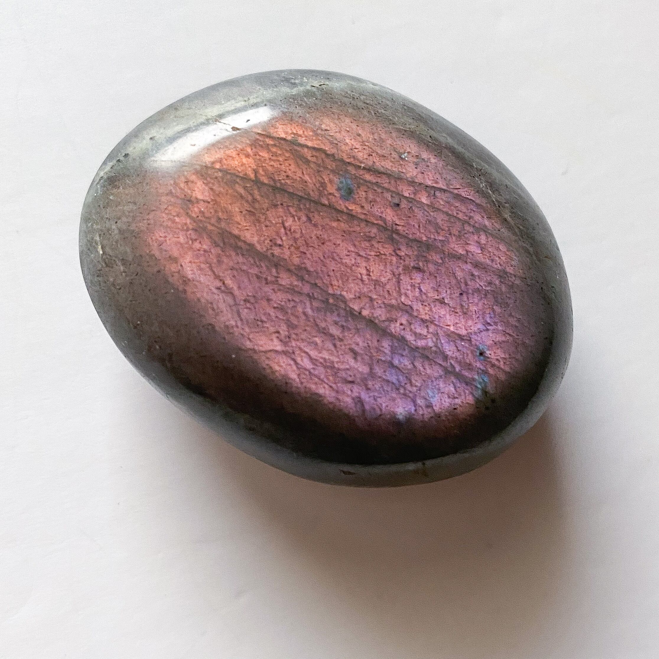 珍しいピンクカラーのシラーが両面に出るラブラドライトです。表面はコーラルピンク〜パープルピンクカラーのラブラドレッセンスです。少しシルバーが入ったようなメタリックで優しいカラーです。