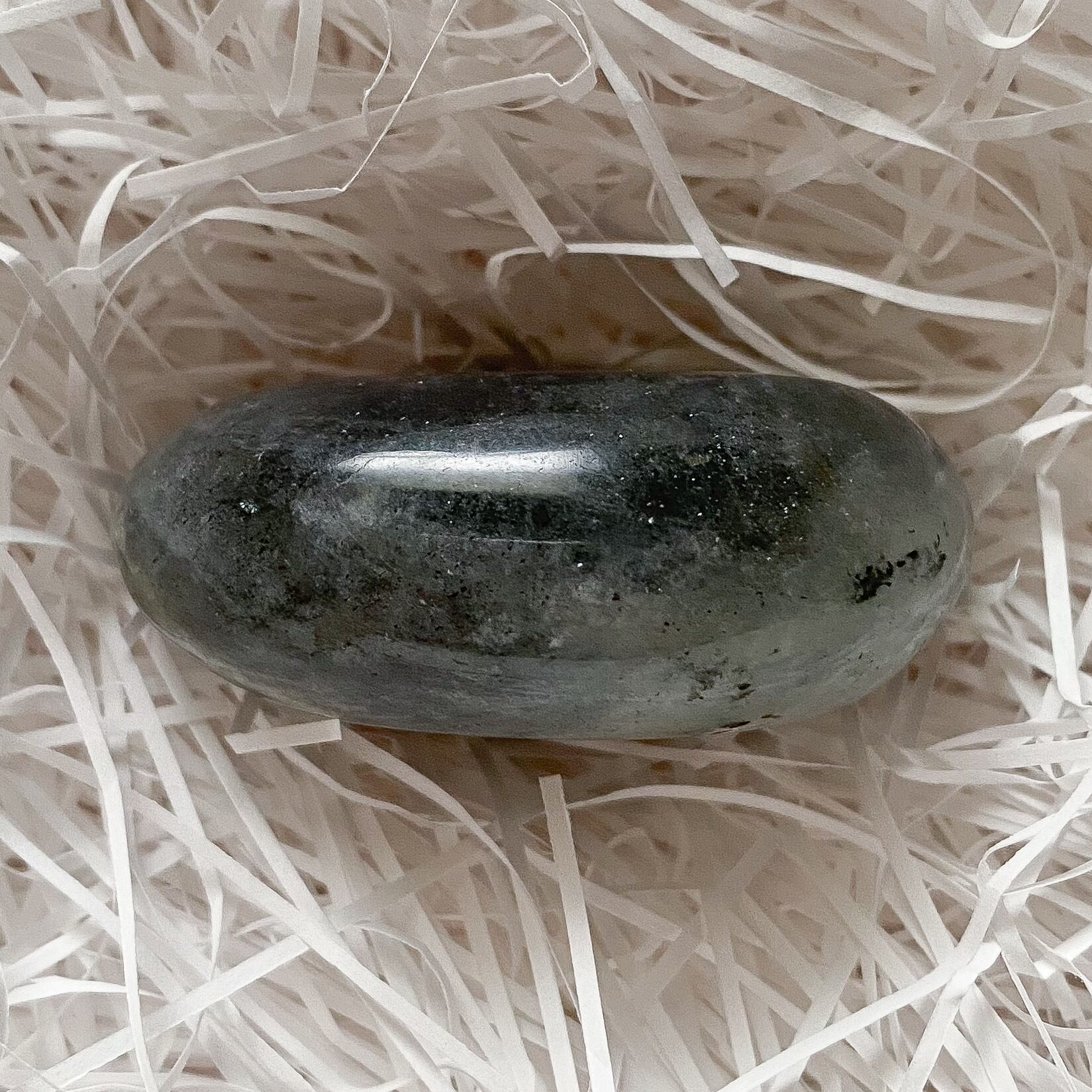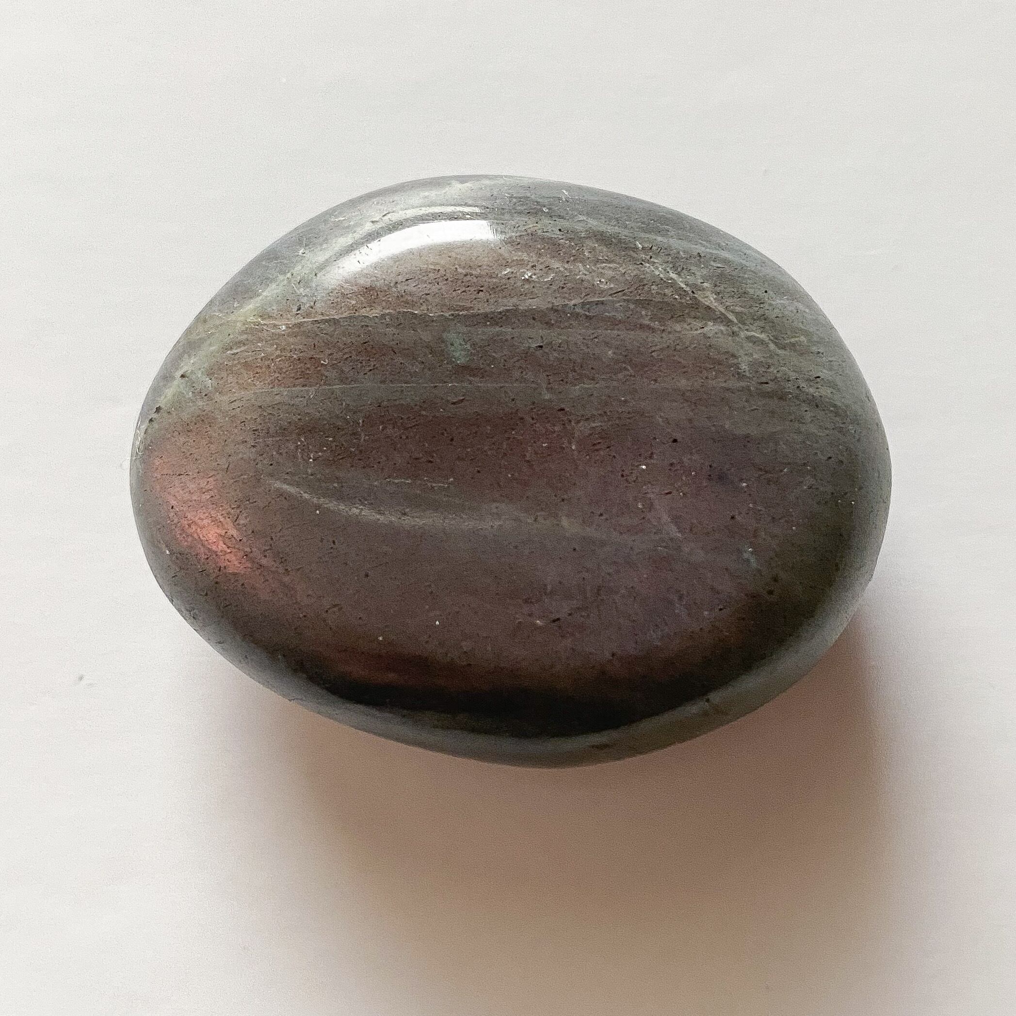 ダークグレーの地色から角度を変えると一転して明るく華やかなシルバーピンクのシラーを見せてくれる、手に馴染みやすい形の整ったパームストーンです。