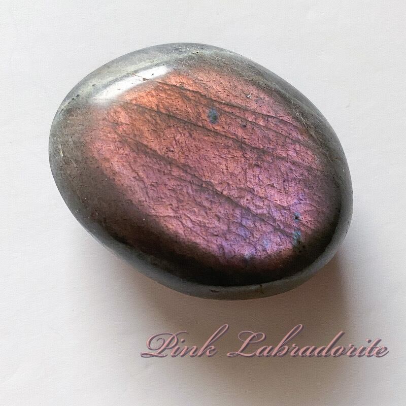 小振りなサイズ感のピンクラブラドライト、パームストーンです。
