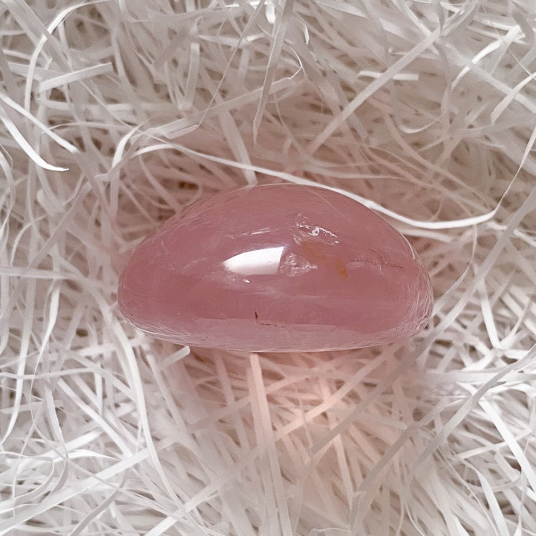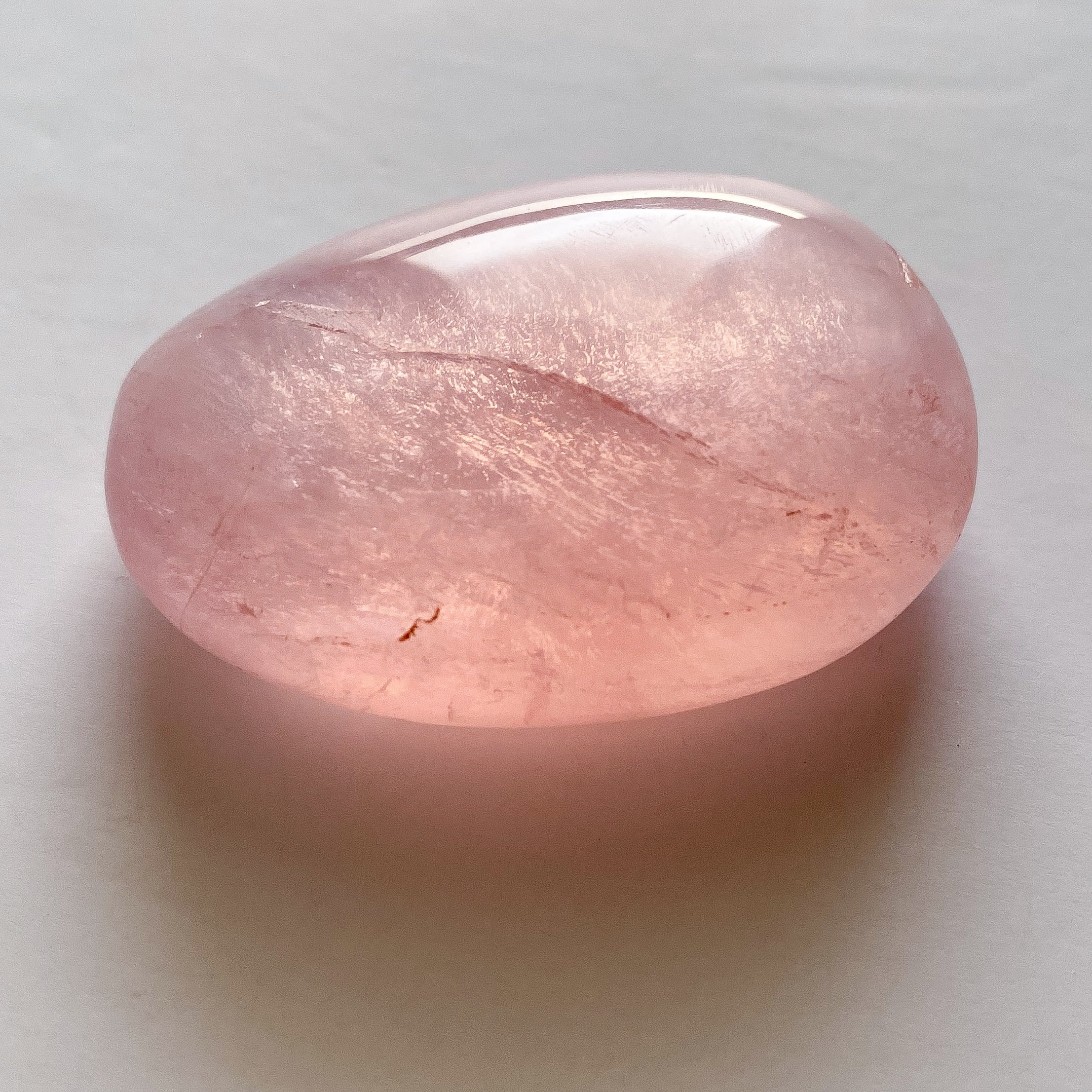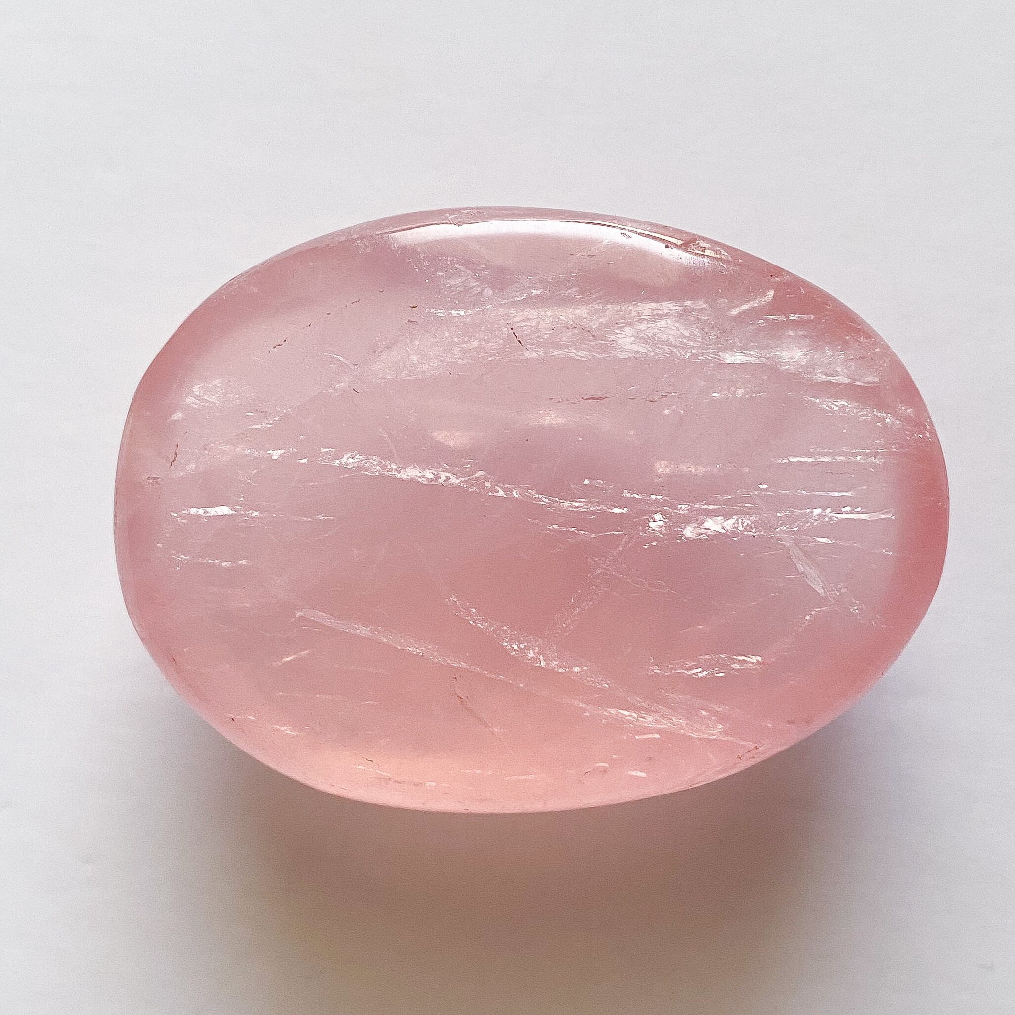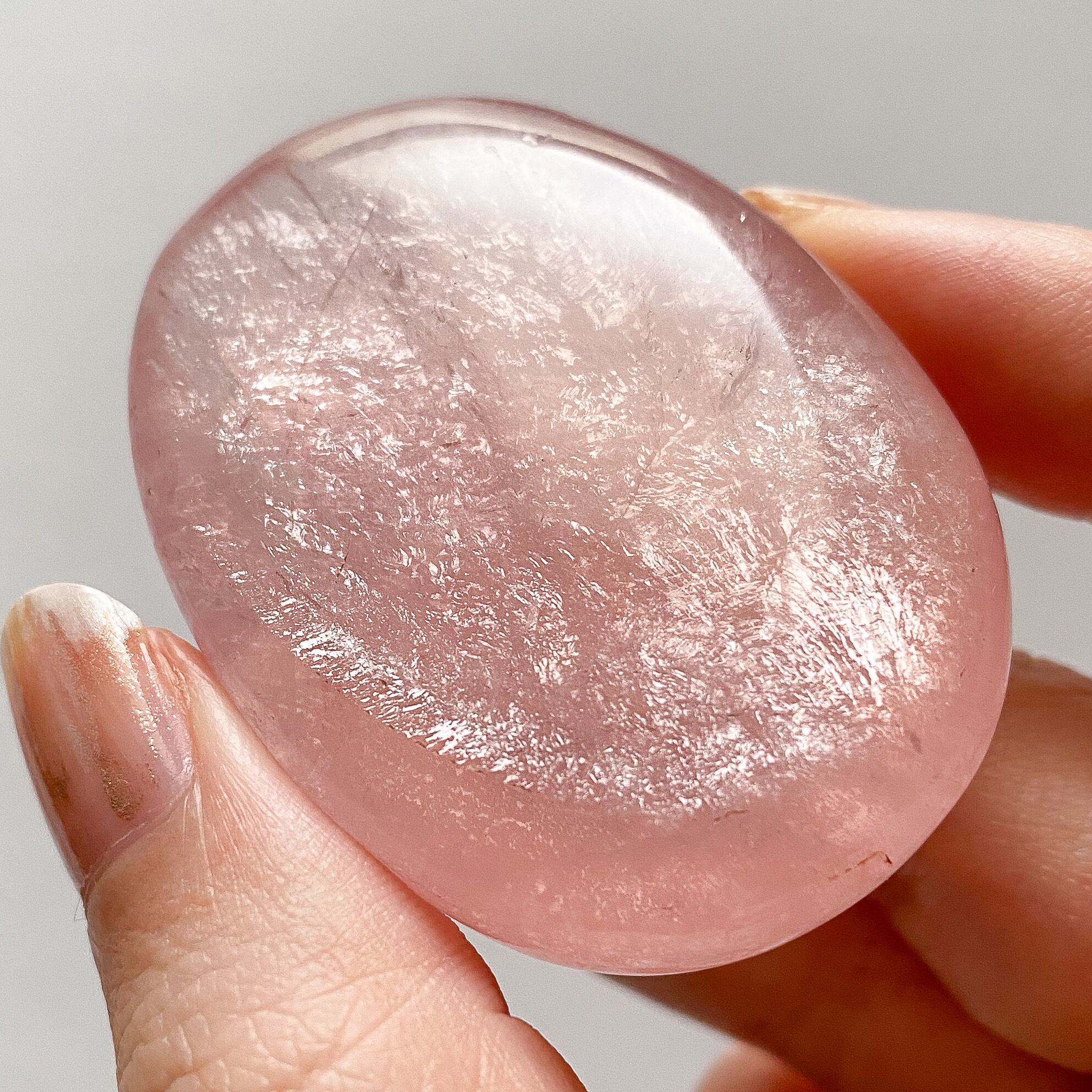 内部に薄い被膜のような層があり、その層が角度を変えるとシラーのようにキラキラと面で輝く不思議な雰囲気のローズクォーツです。