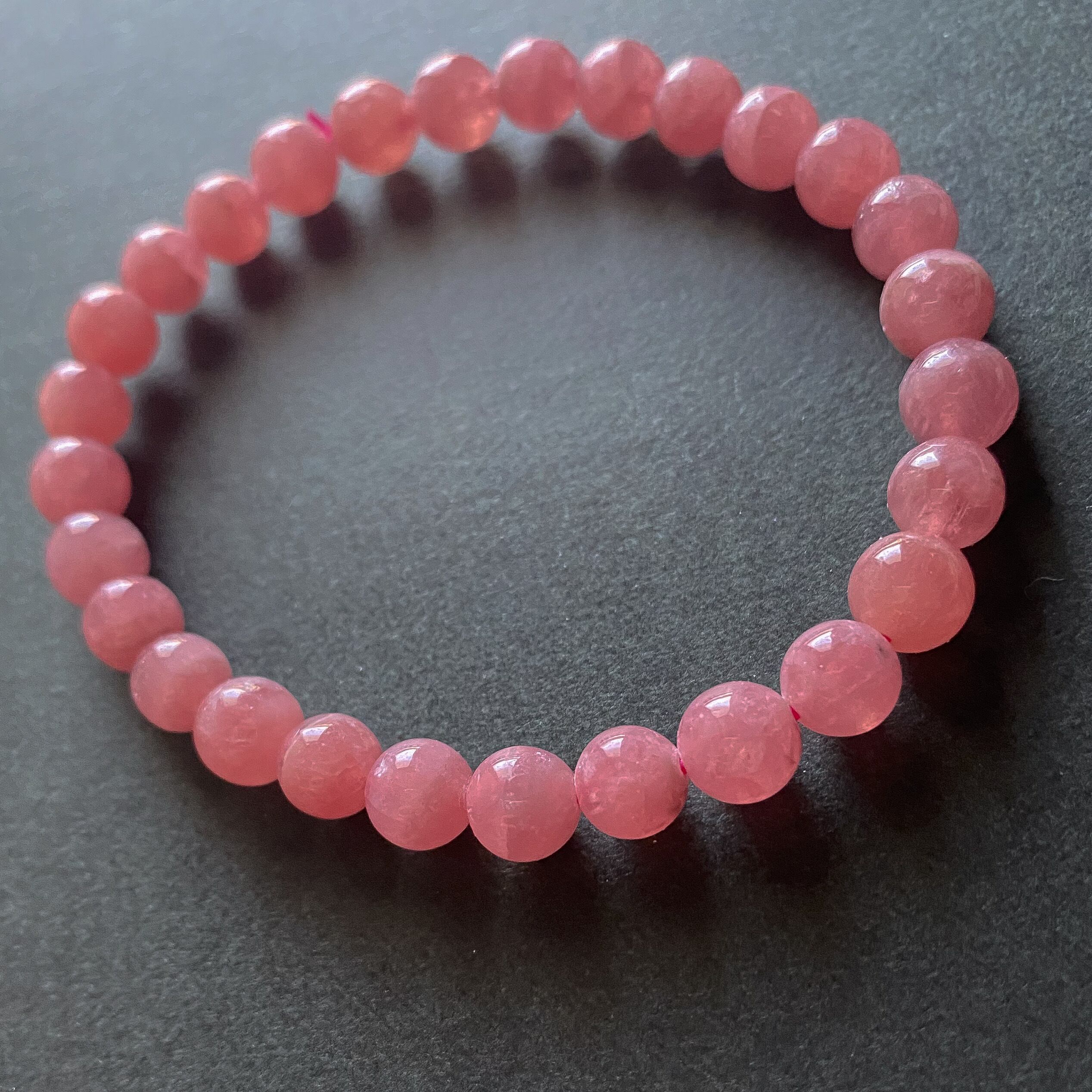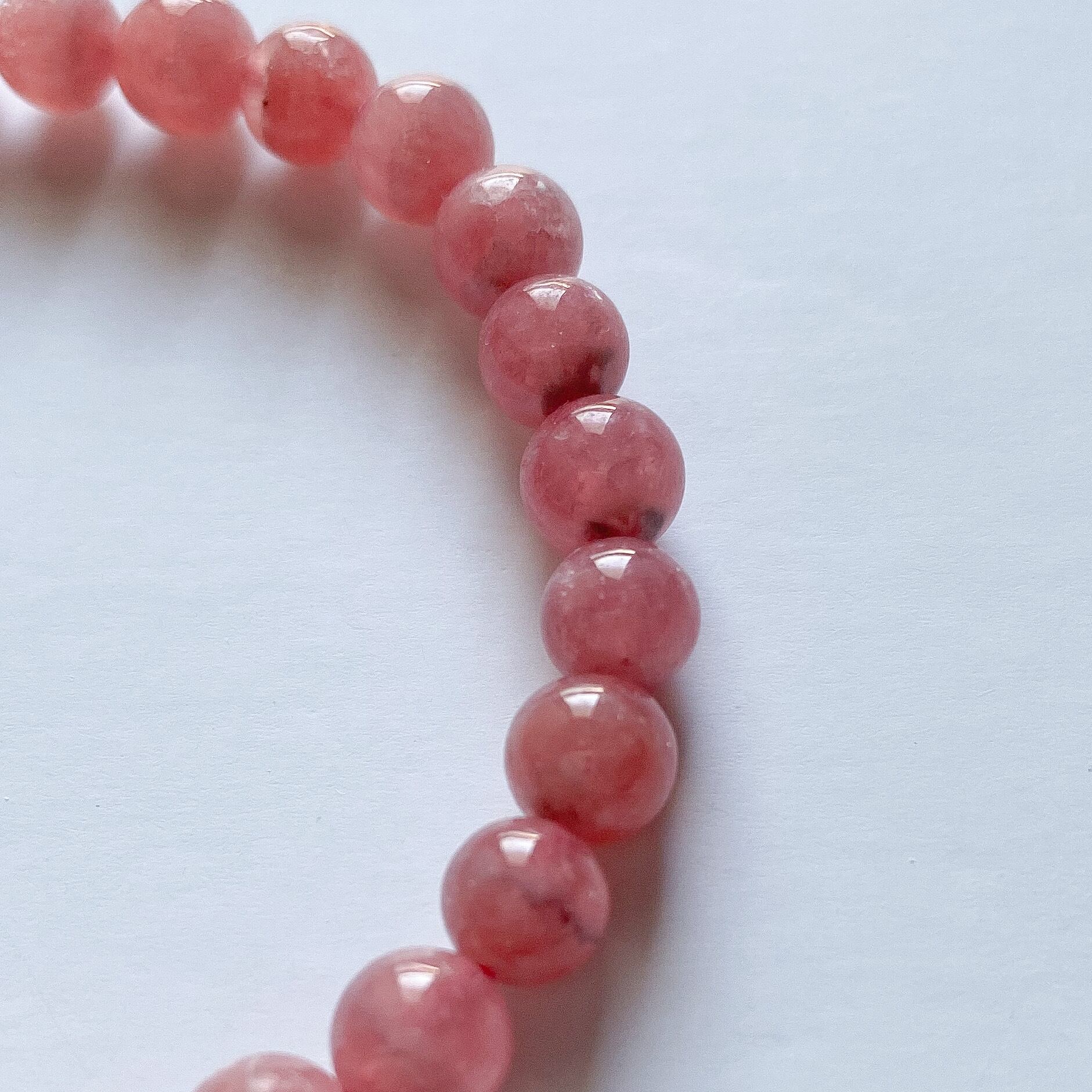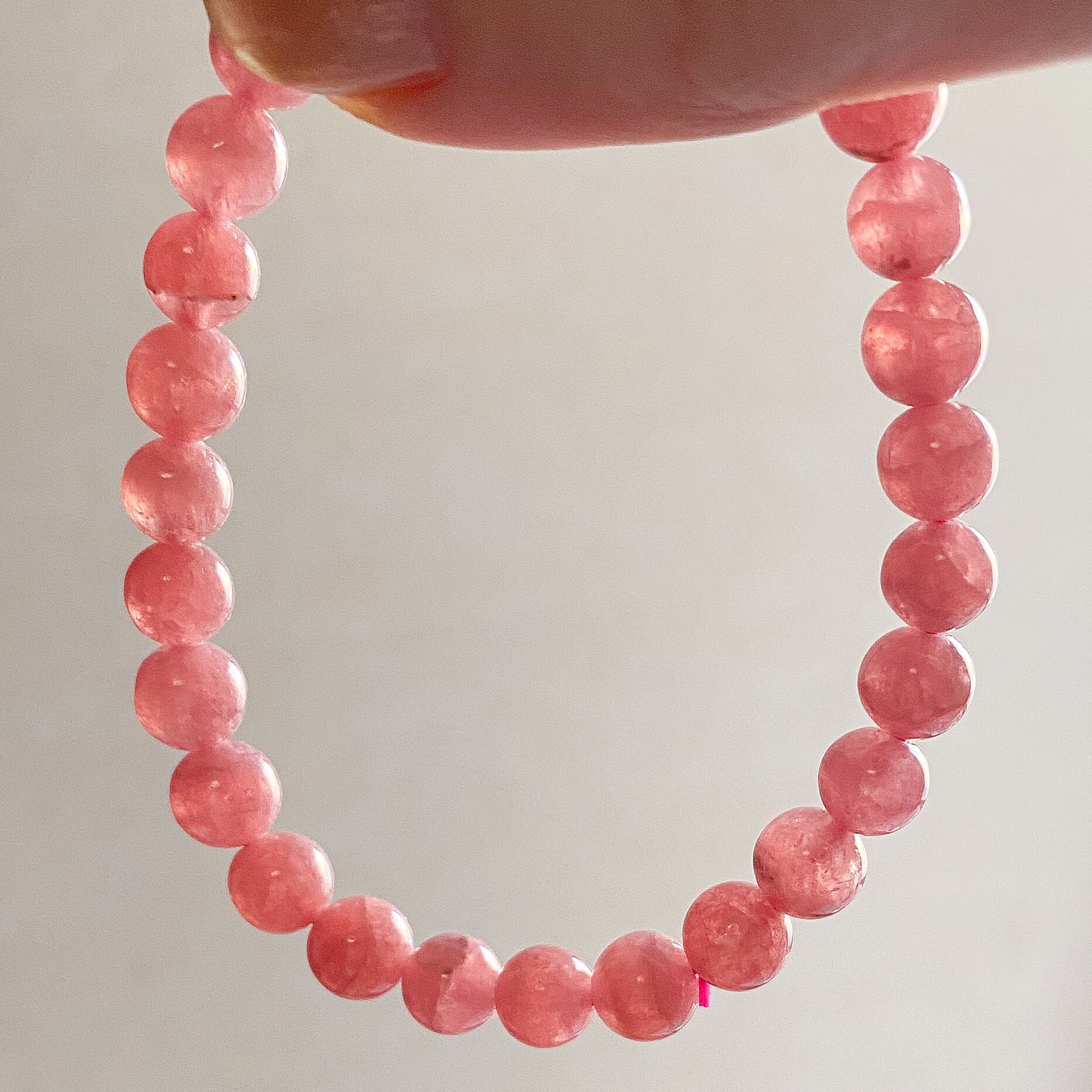 良い品質のインカローズで穴の付近に黒点が少し見える粒などもありますが、濃いローズカラーでキラキラとシラーのようなものが見える粒もあります。ほんのり透明感も感じられ縞がほぼ入っていない一連ブレスレットです。