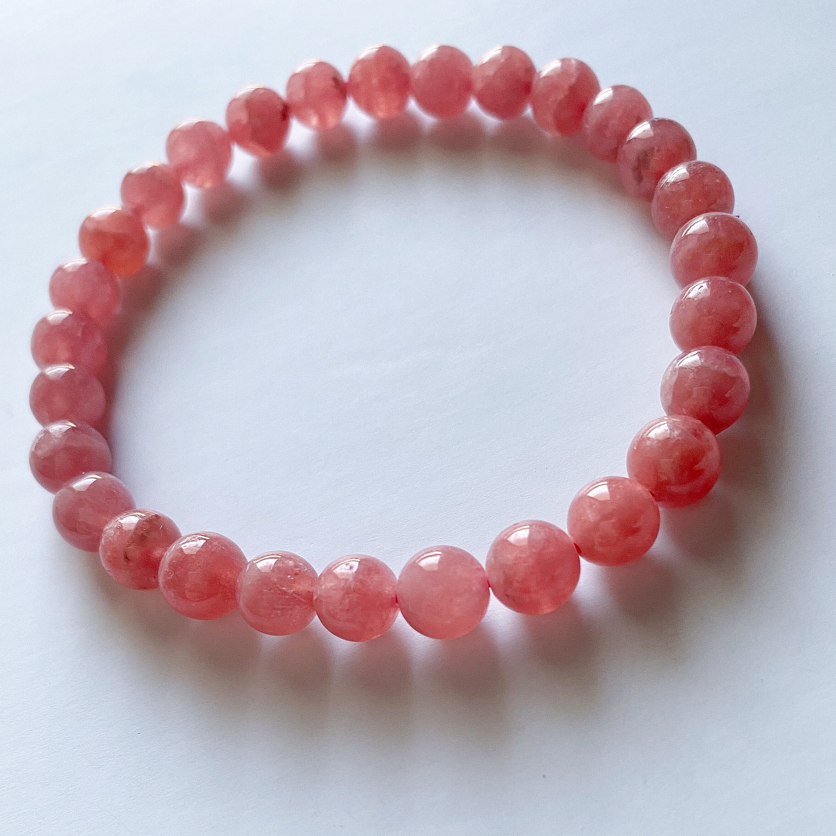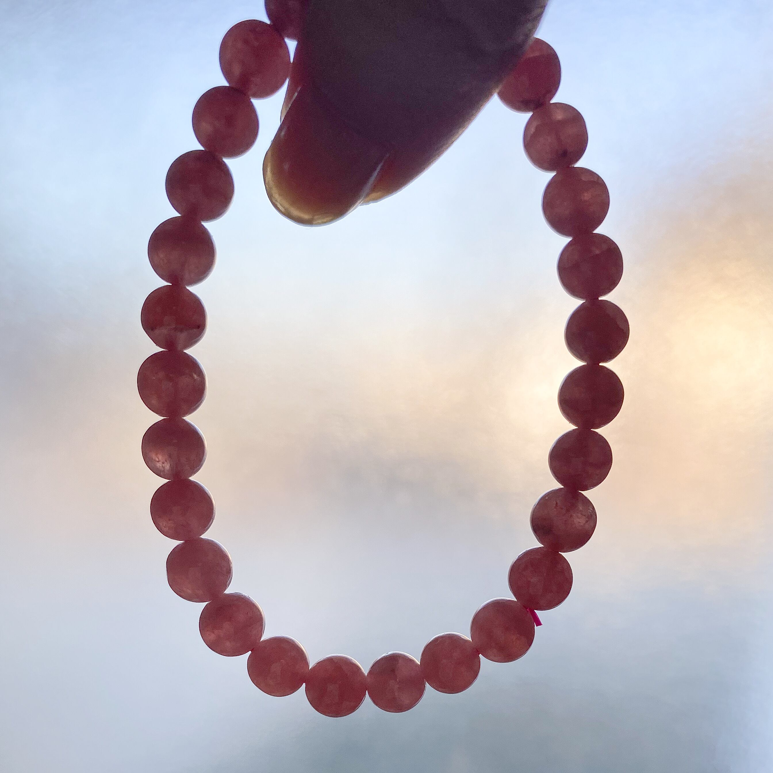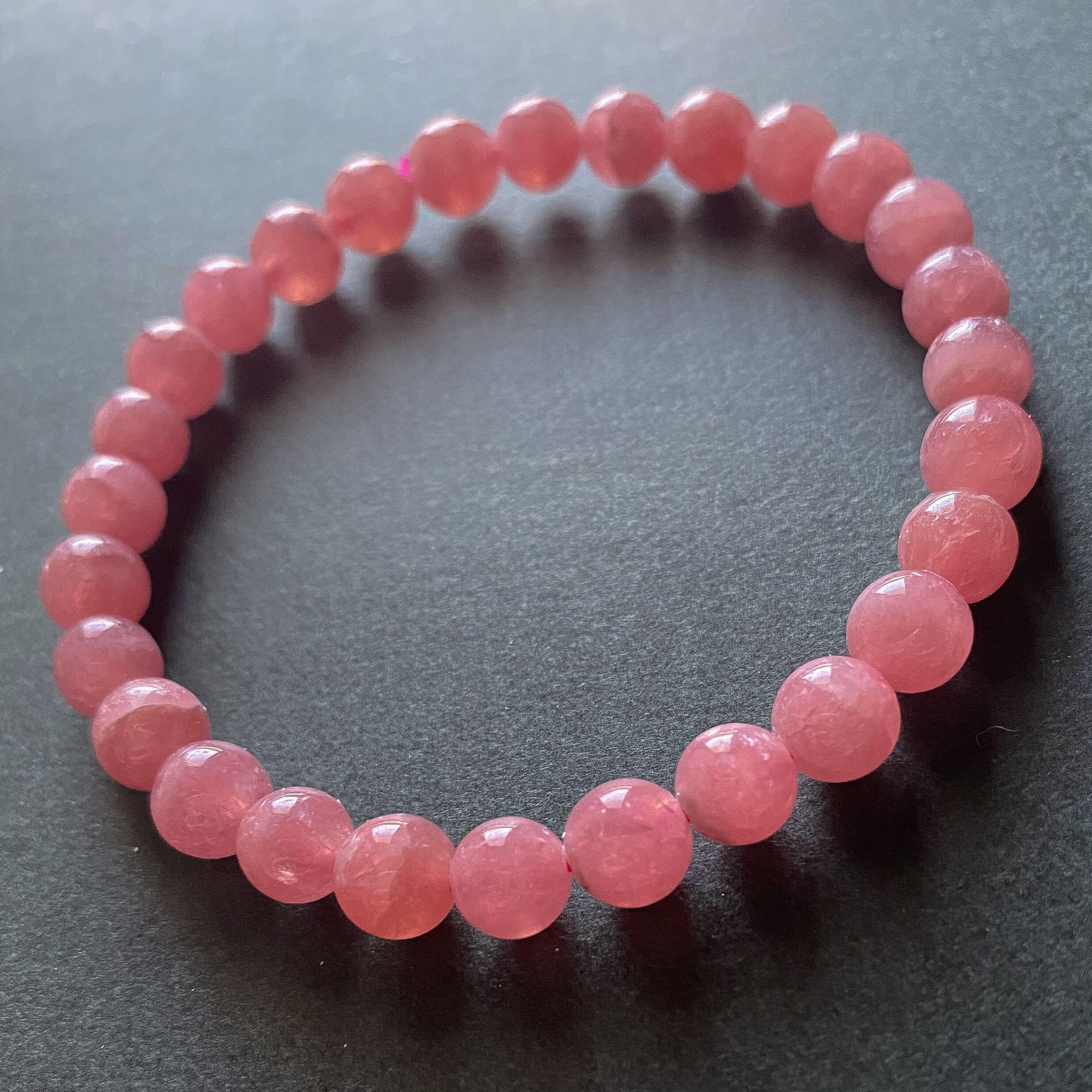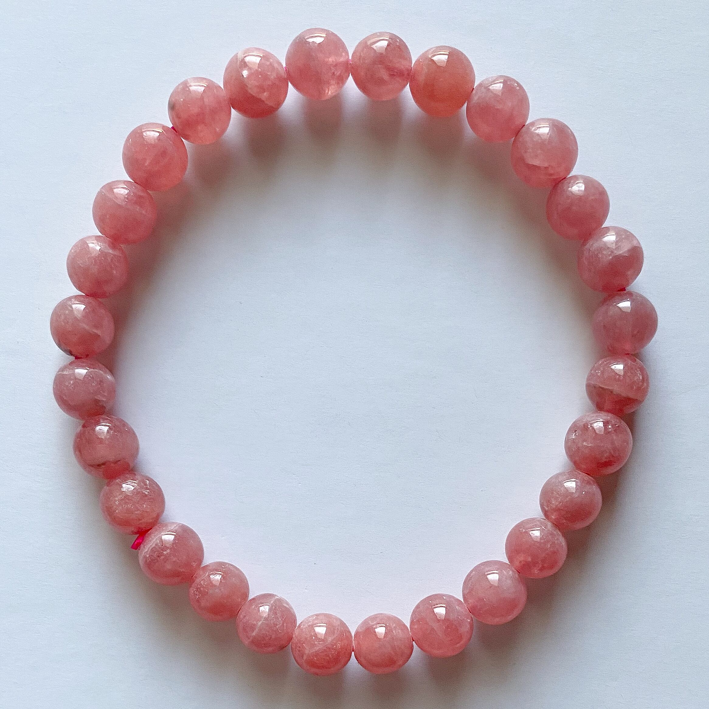 良い品質のインカローズで穴の付近に黒点が少し見える粒などもありますが、濃いローズカラーでキラキラとシラーのようなものが見える粒もあります。ほんのり透明感も感じられ縞がほぼ入っていない一連ブレスレットです。