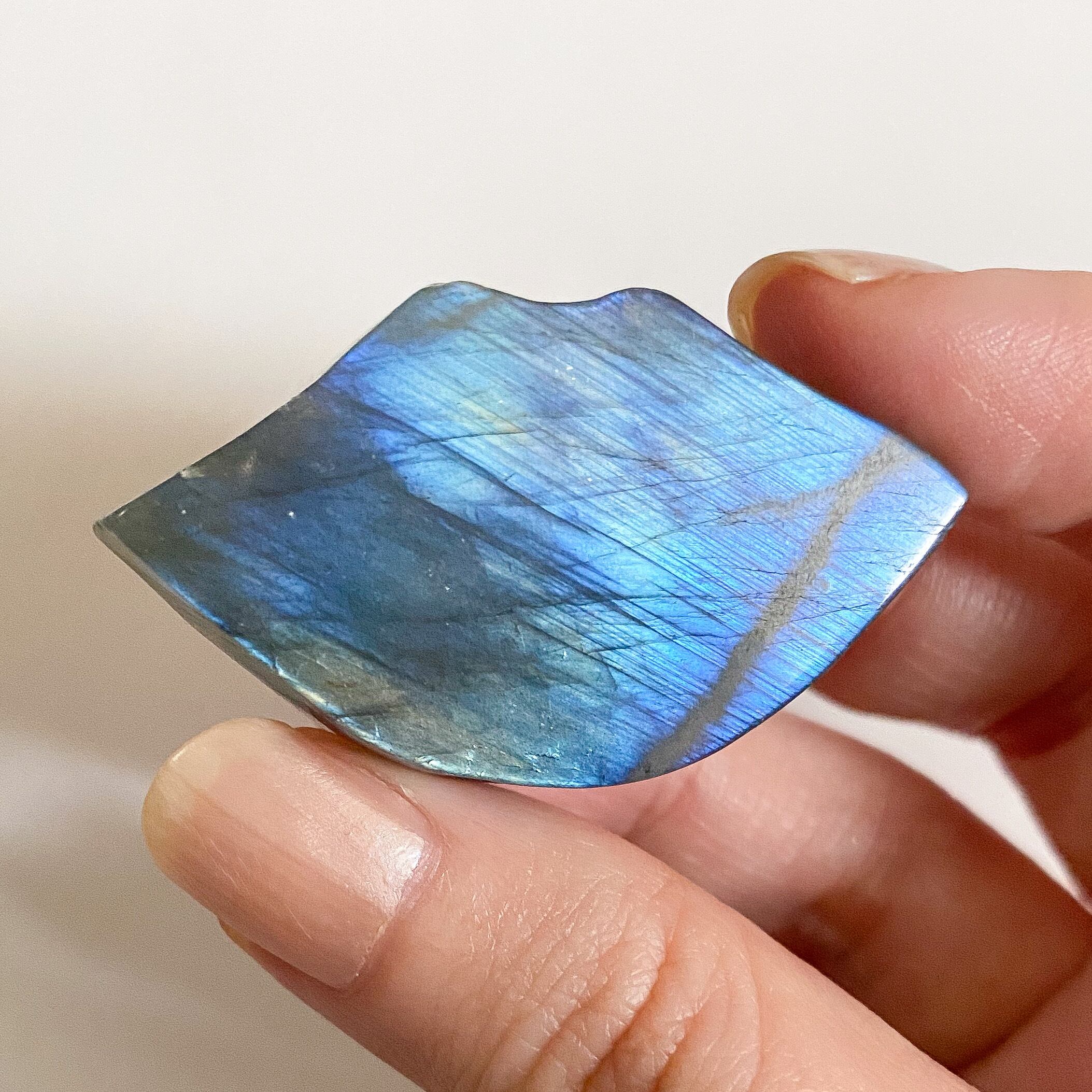 リップ全面にブルーシラーが浮かび、裏面にも強いシラーが見られる品質の良いラブラドライトです。