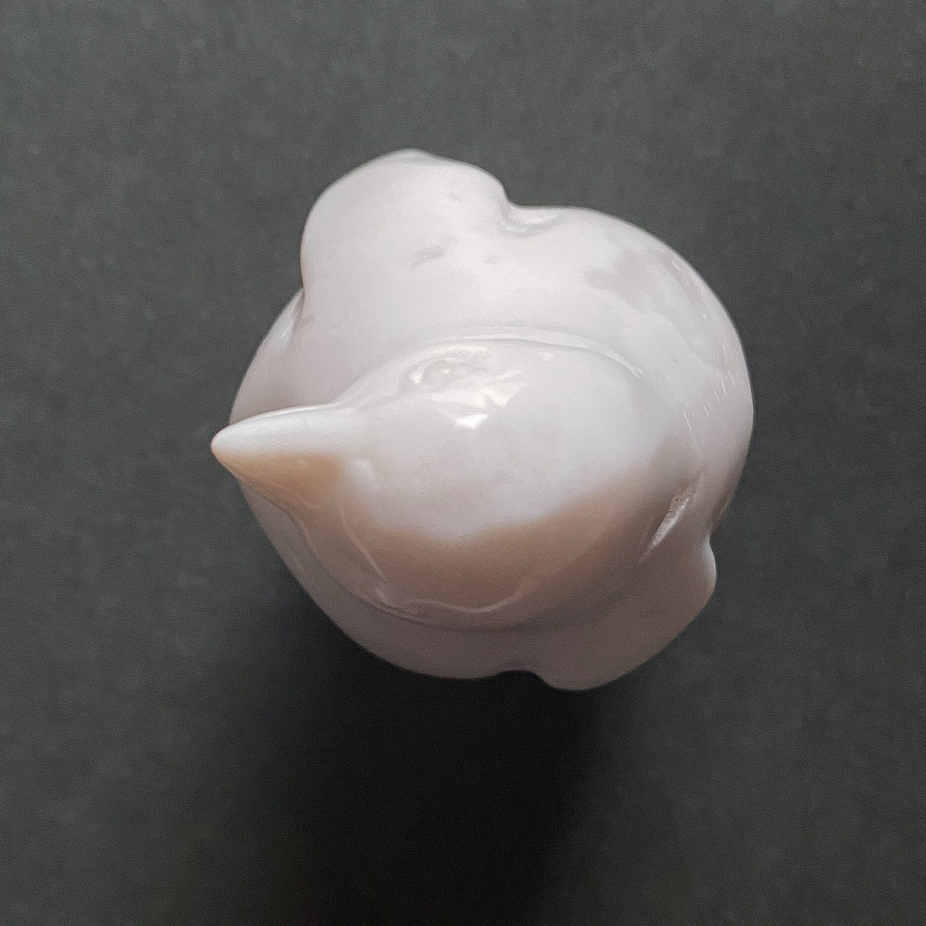 オールホワイトカラーの中に瑪瑙の透明度による色の濃淡があり、小さなジオードも所々に見られるアゲートです。つるんとした触り心地と全体的に丸みを帯びたシルエットが可愛らしいです。