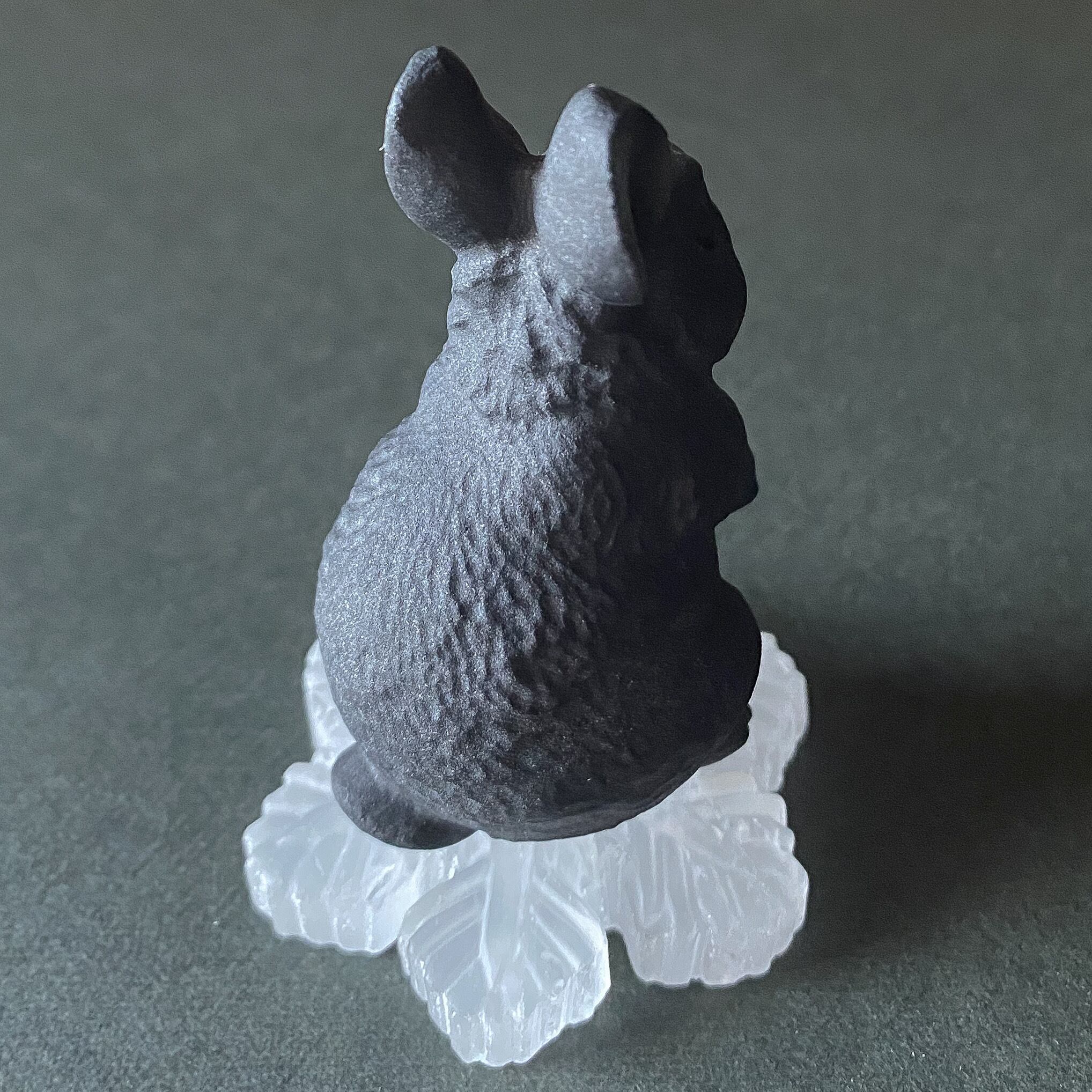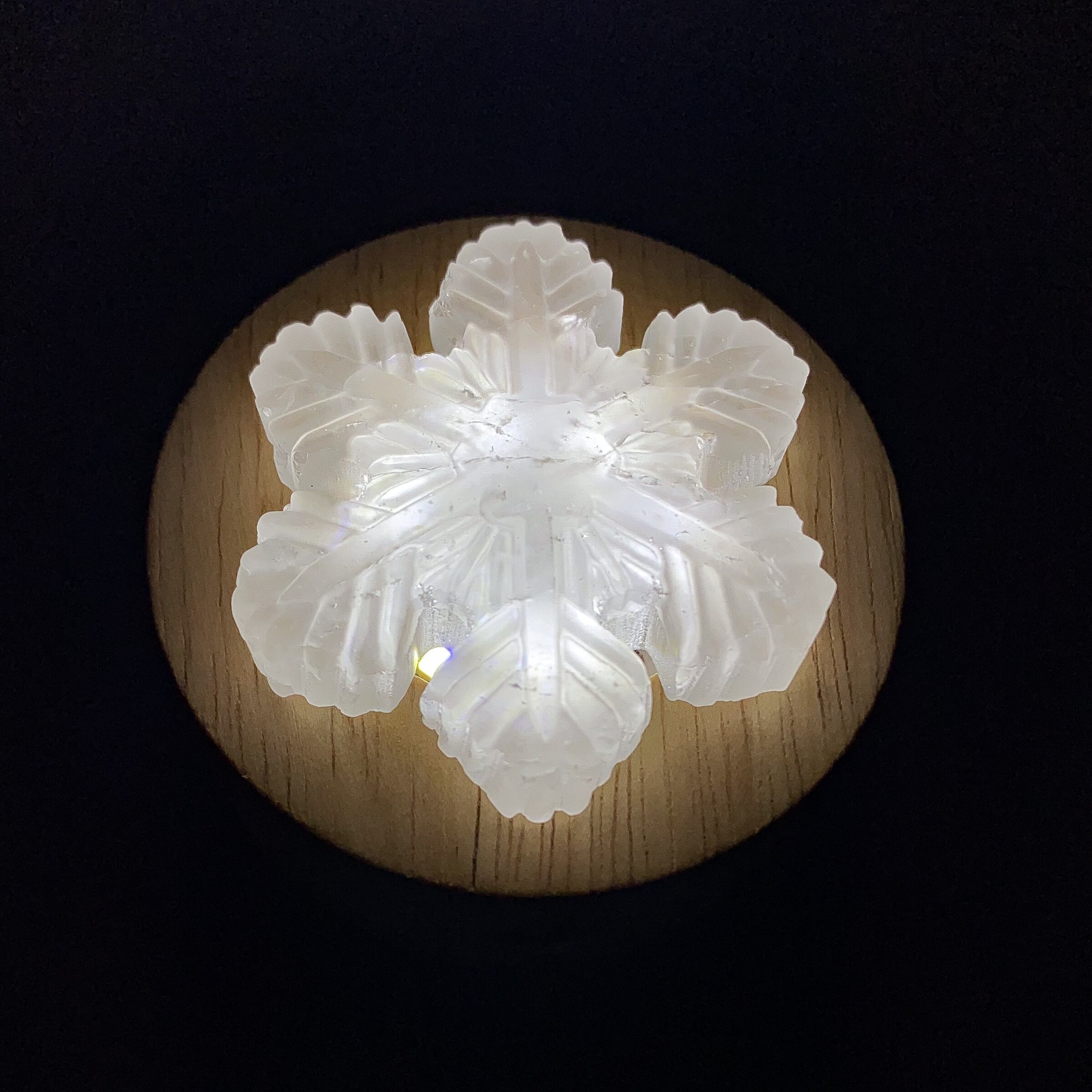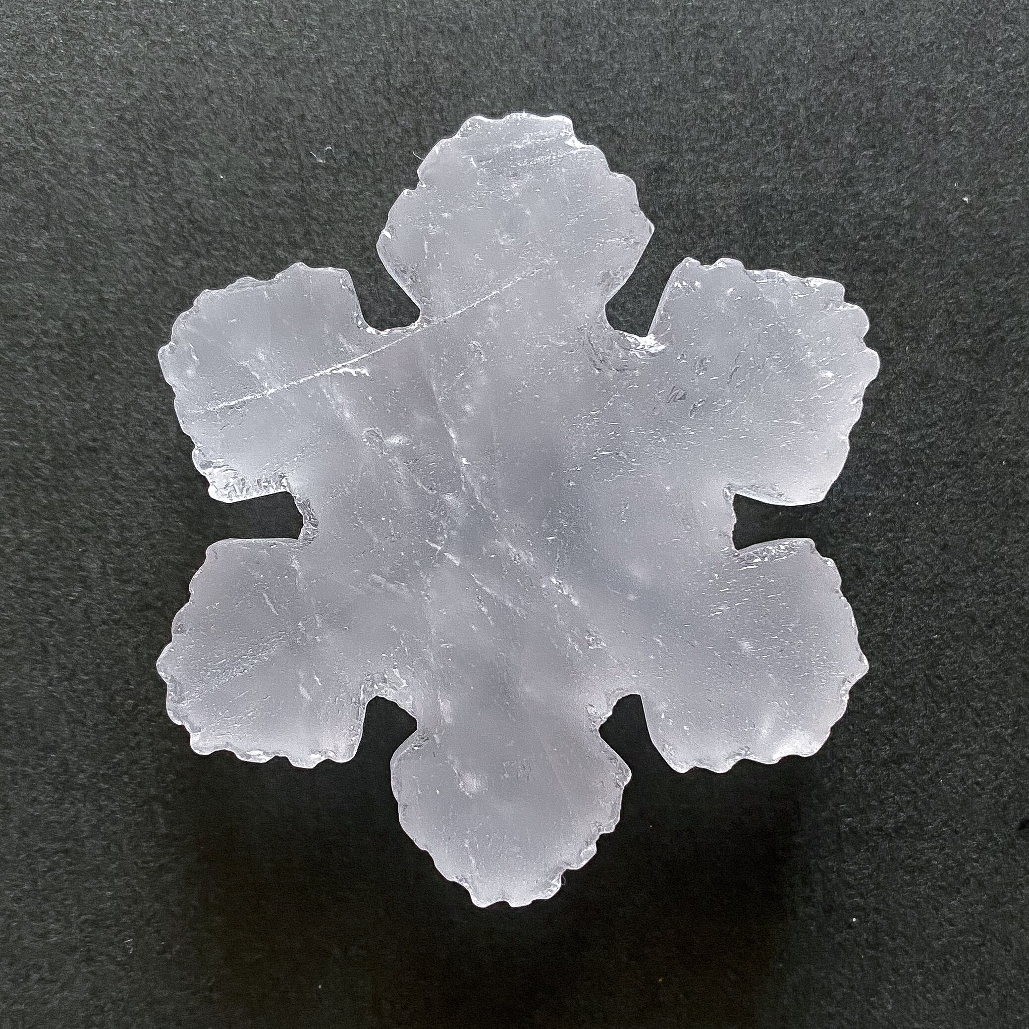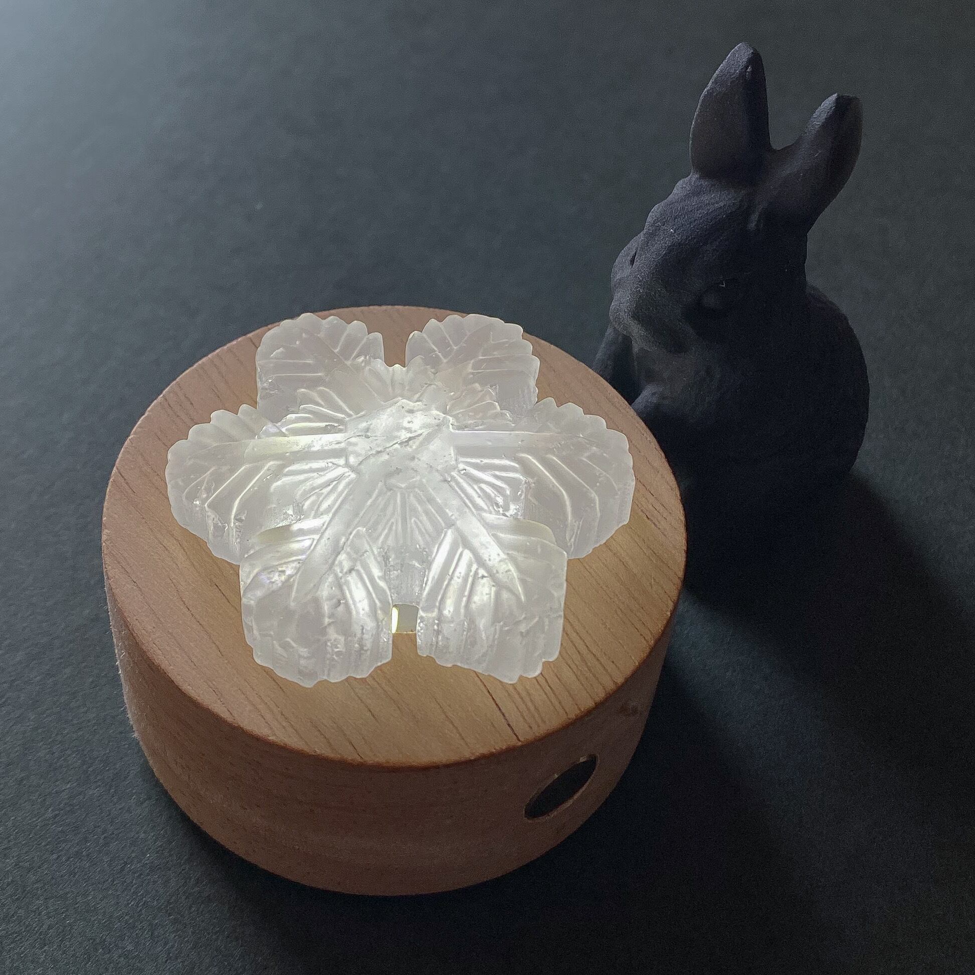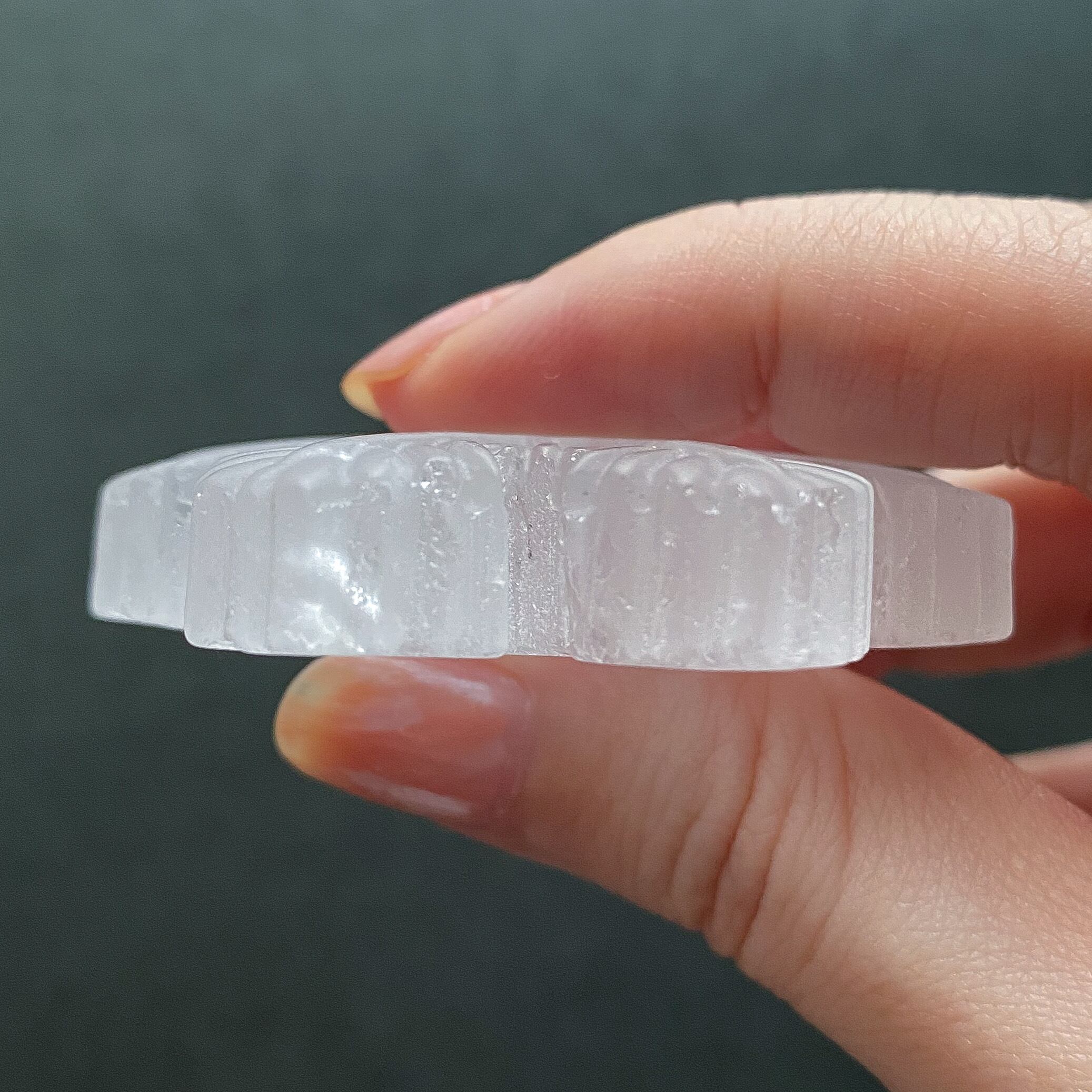 磨りガラスのようなマットな仕上げのカービングです。半透明のふわっとした優しい雰囲気の結晶で、そのままでも可愛らしいですが冬や雪を連想させるような動物や、光を柔らかく通しますのでライトなどとも相性が良いと思います。(参考写真6、7、8枚目)