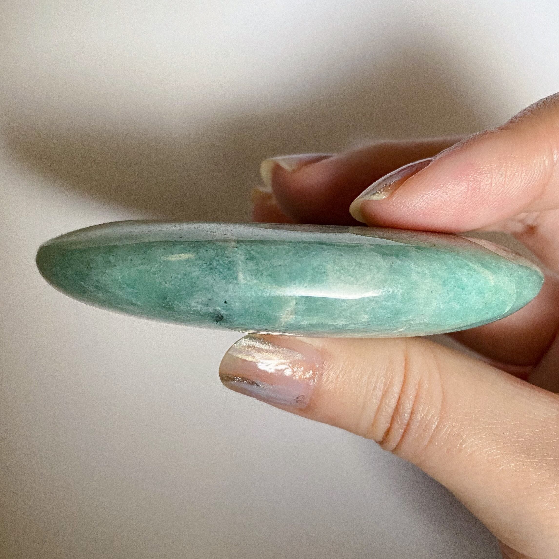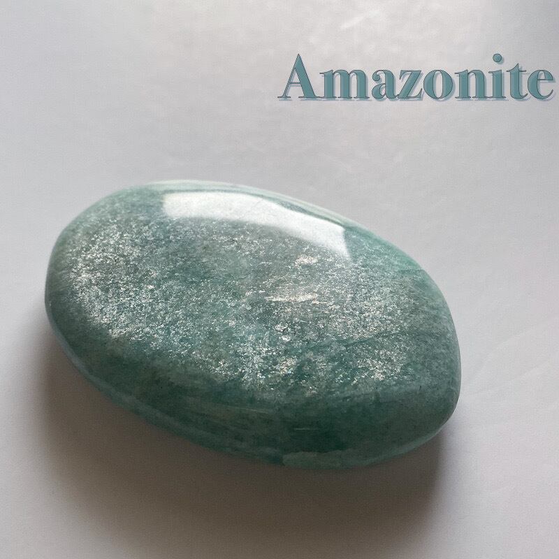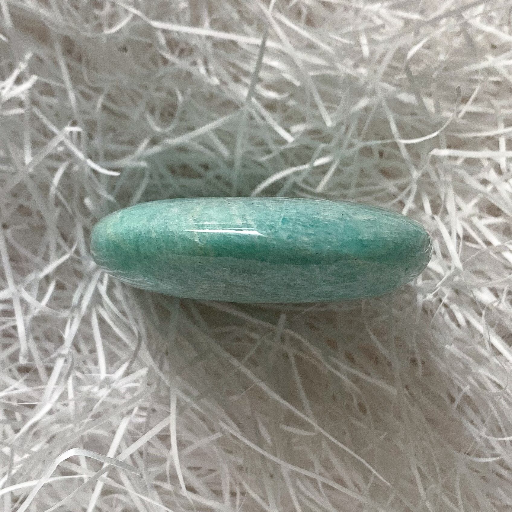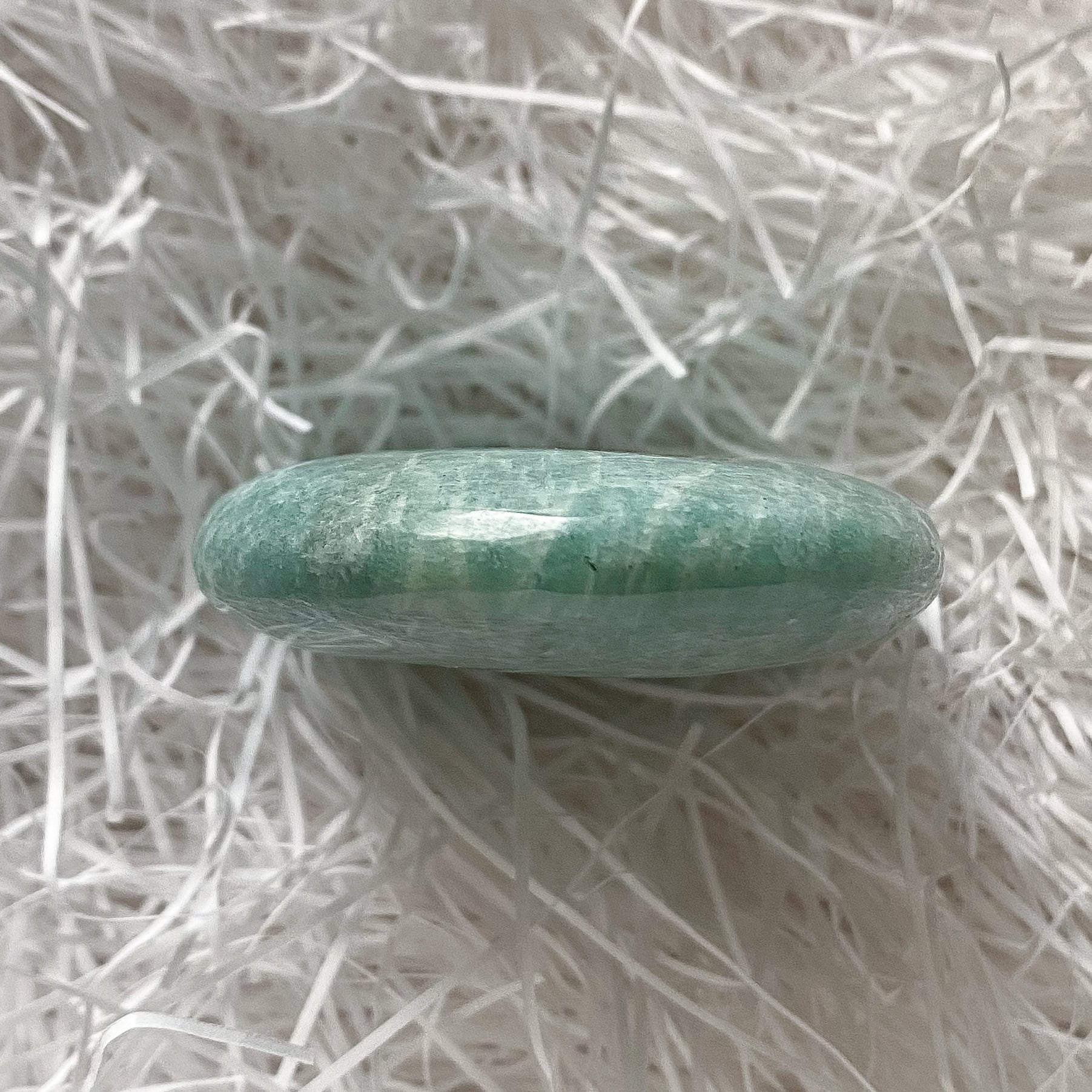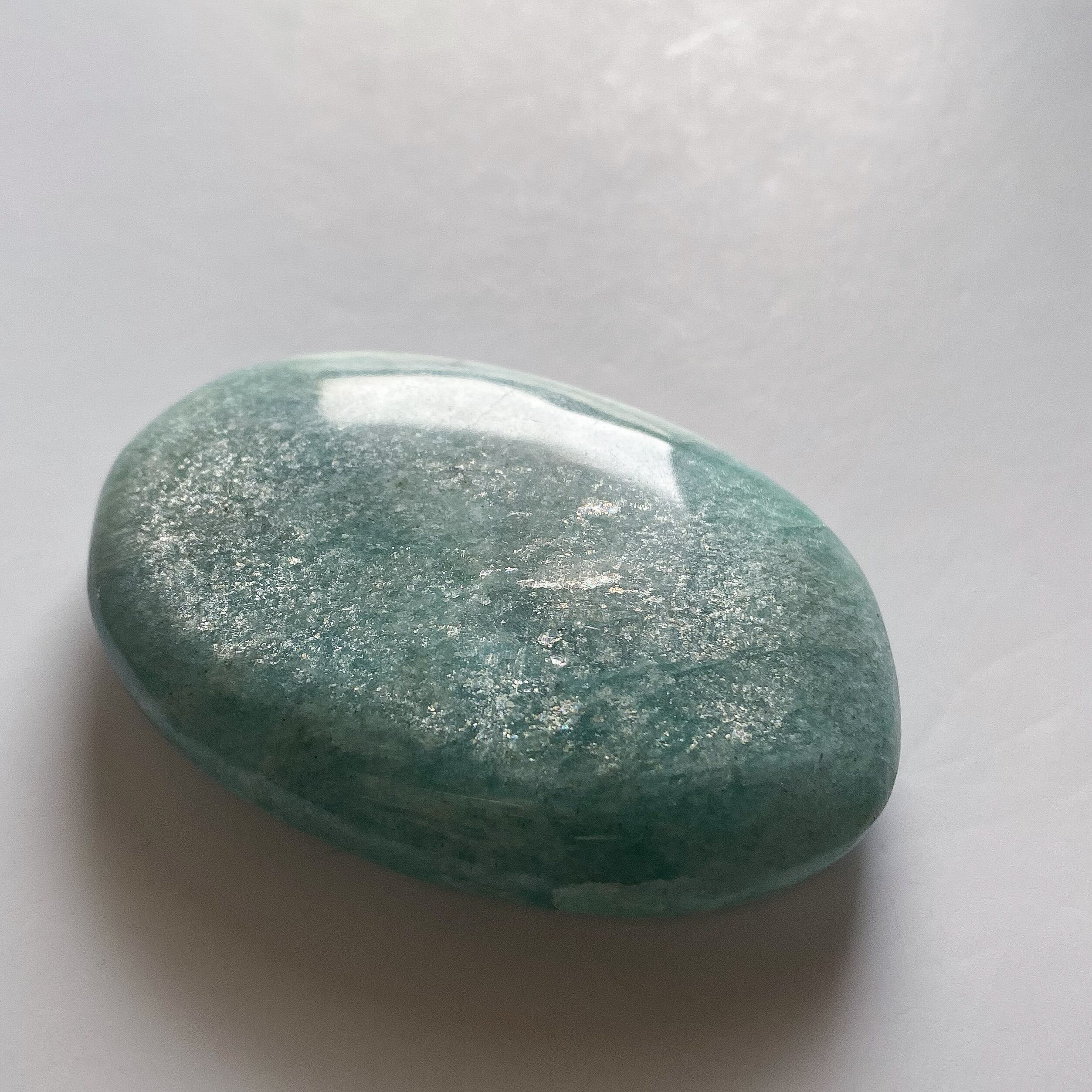優しいブルーグリーンが地色のアマゾナイトでシラーは両面に見られます。
