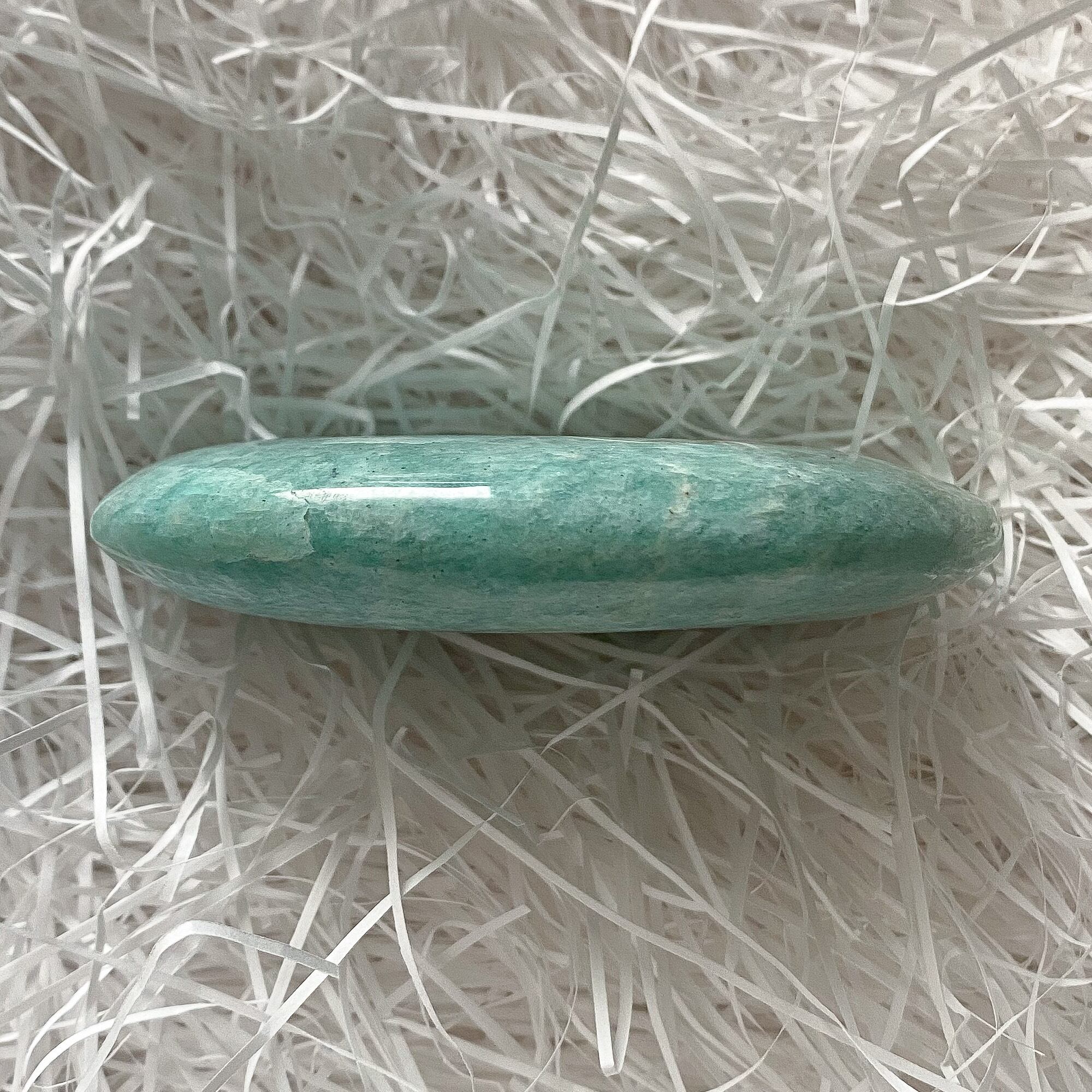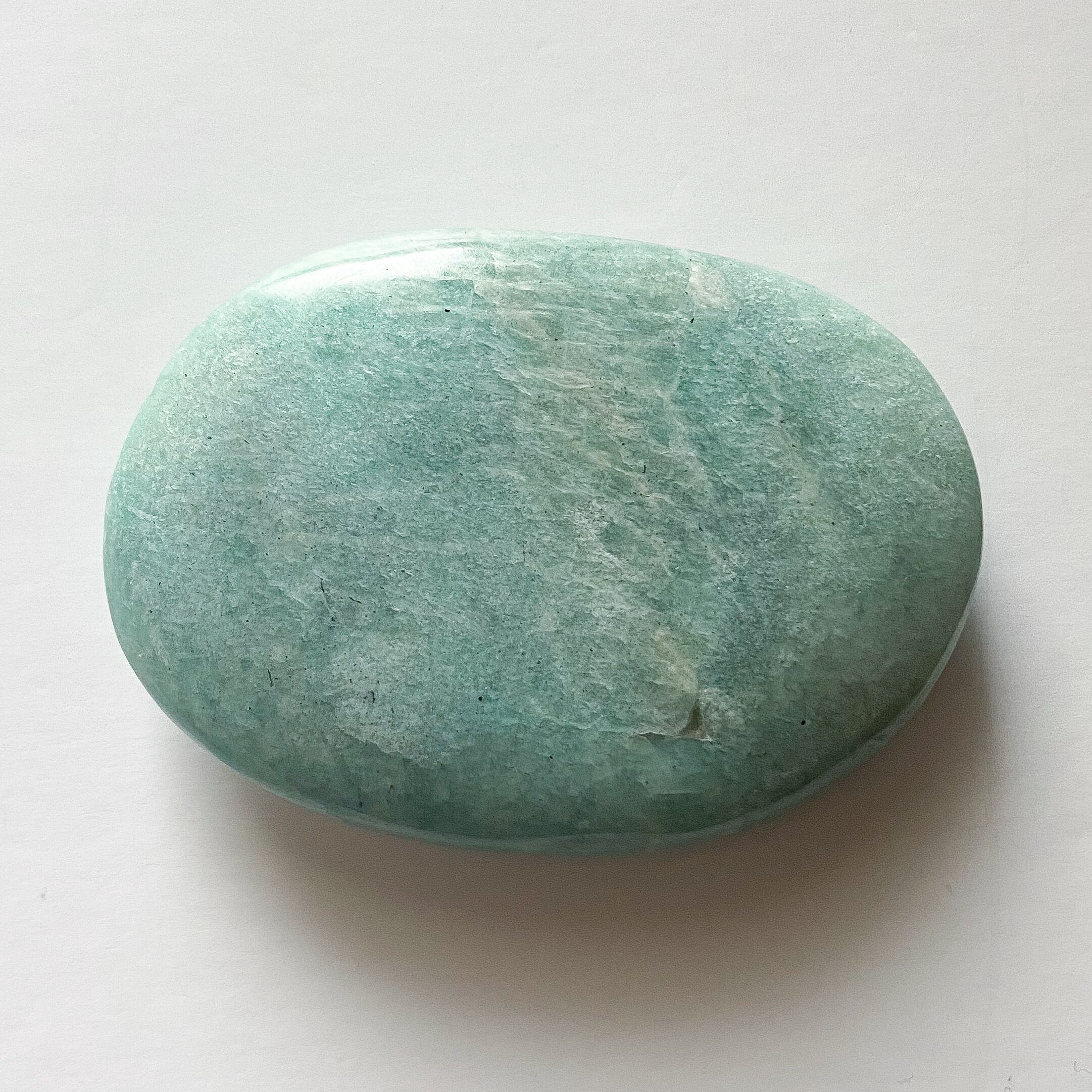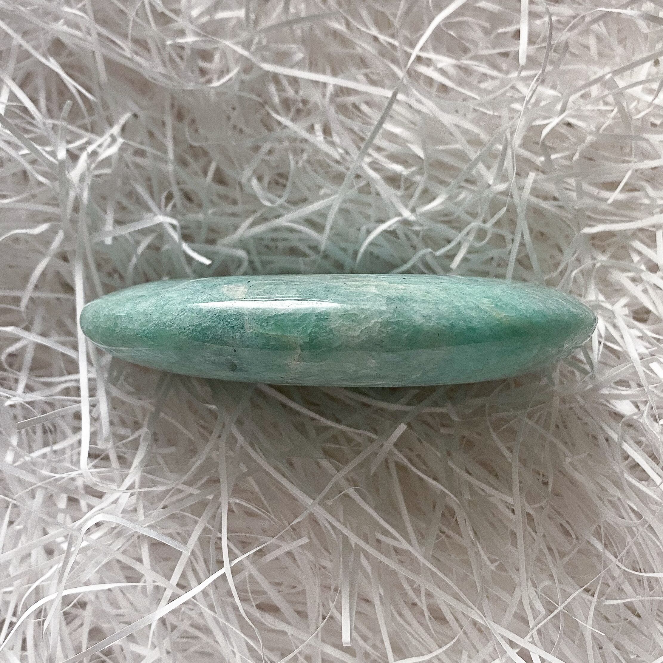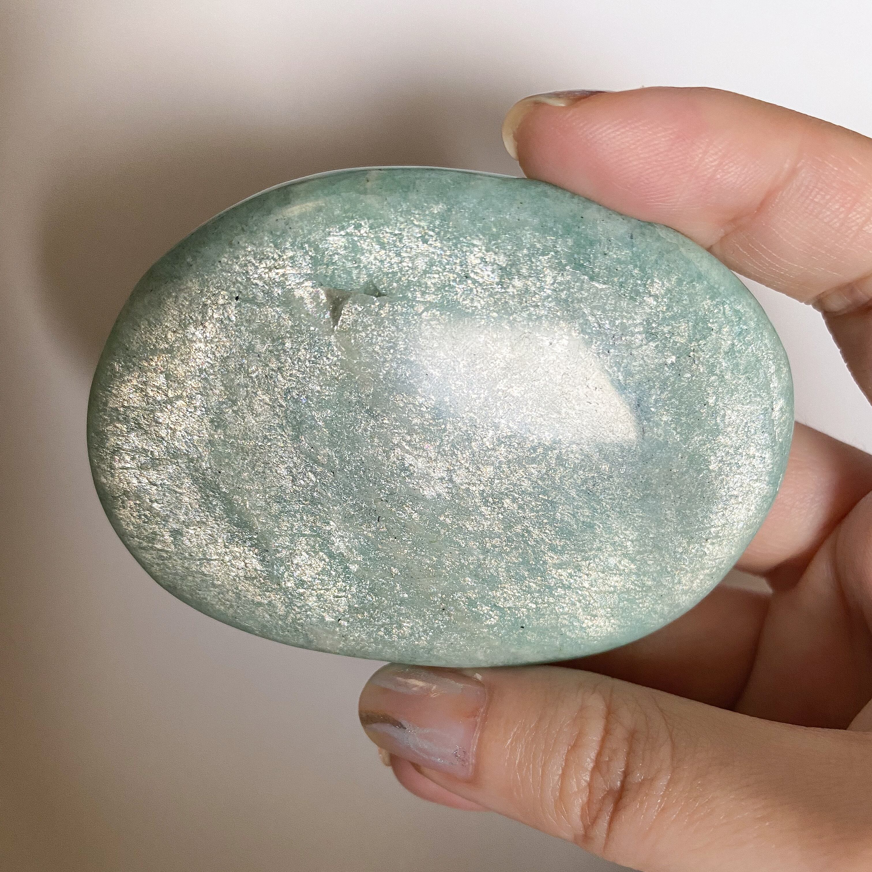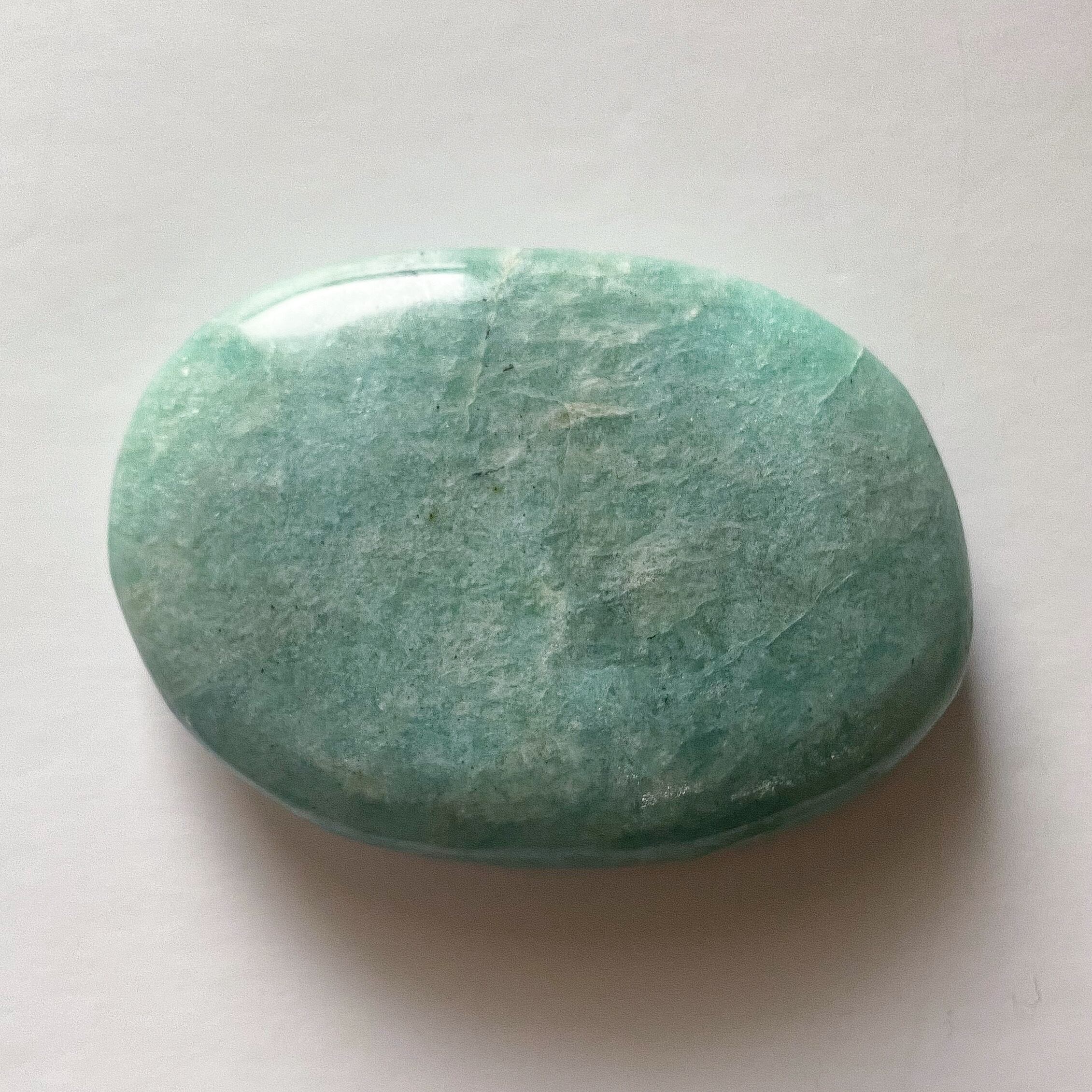 優しいブルーグリーンが地色のアマゾナイトでシラーは両面に見られます。