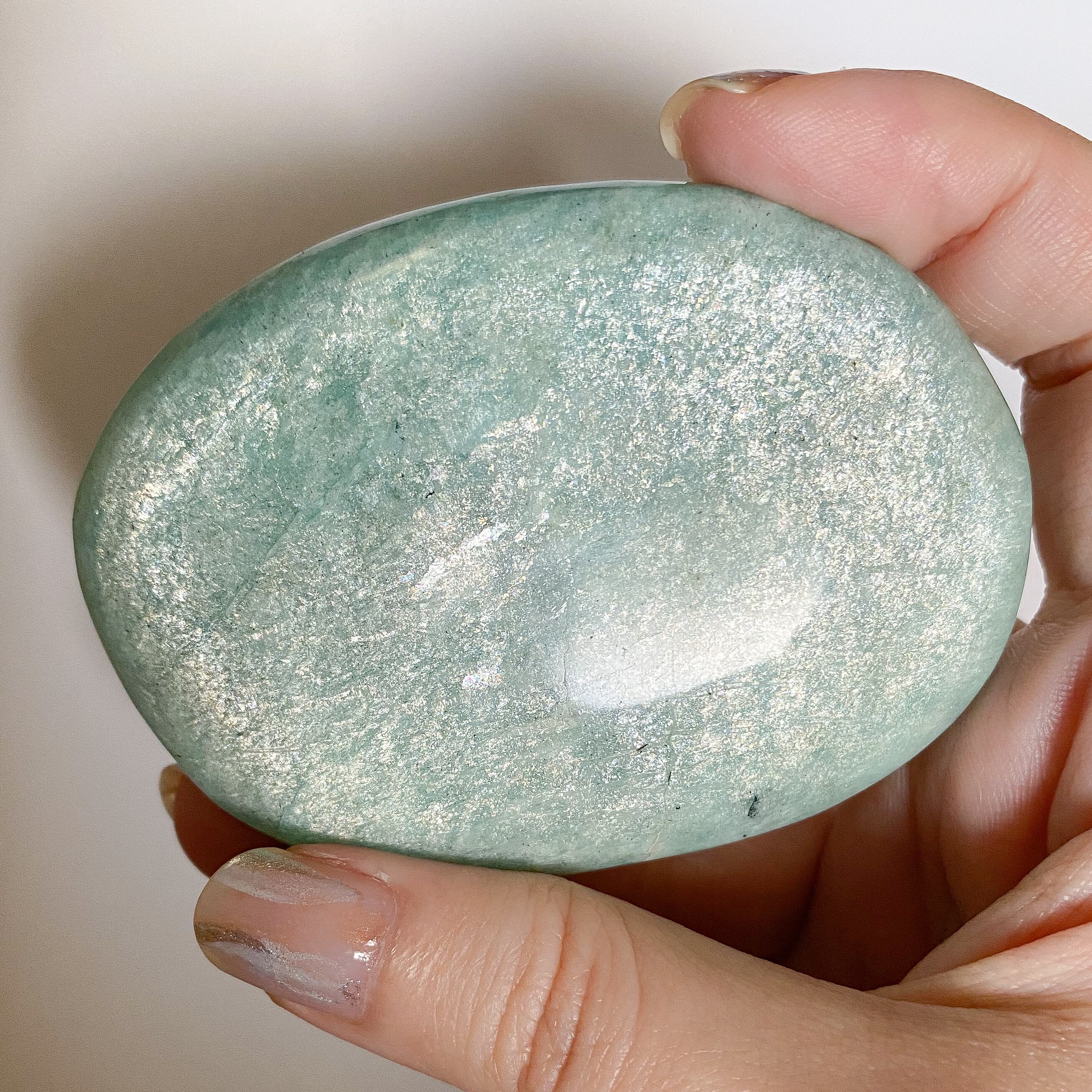 ブルーグリーンにキラリと光るシルバーのシラーが爽やかで、地色とシラー、2つの魅力を持ったパームストーンです。