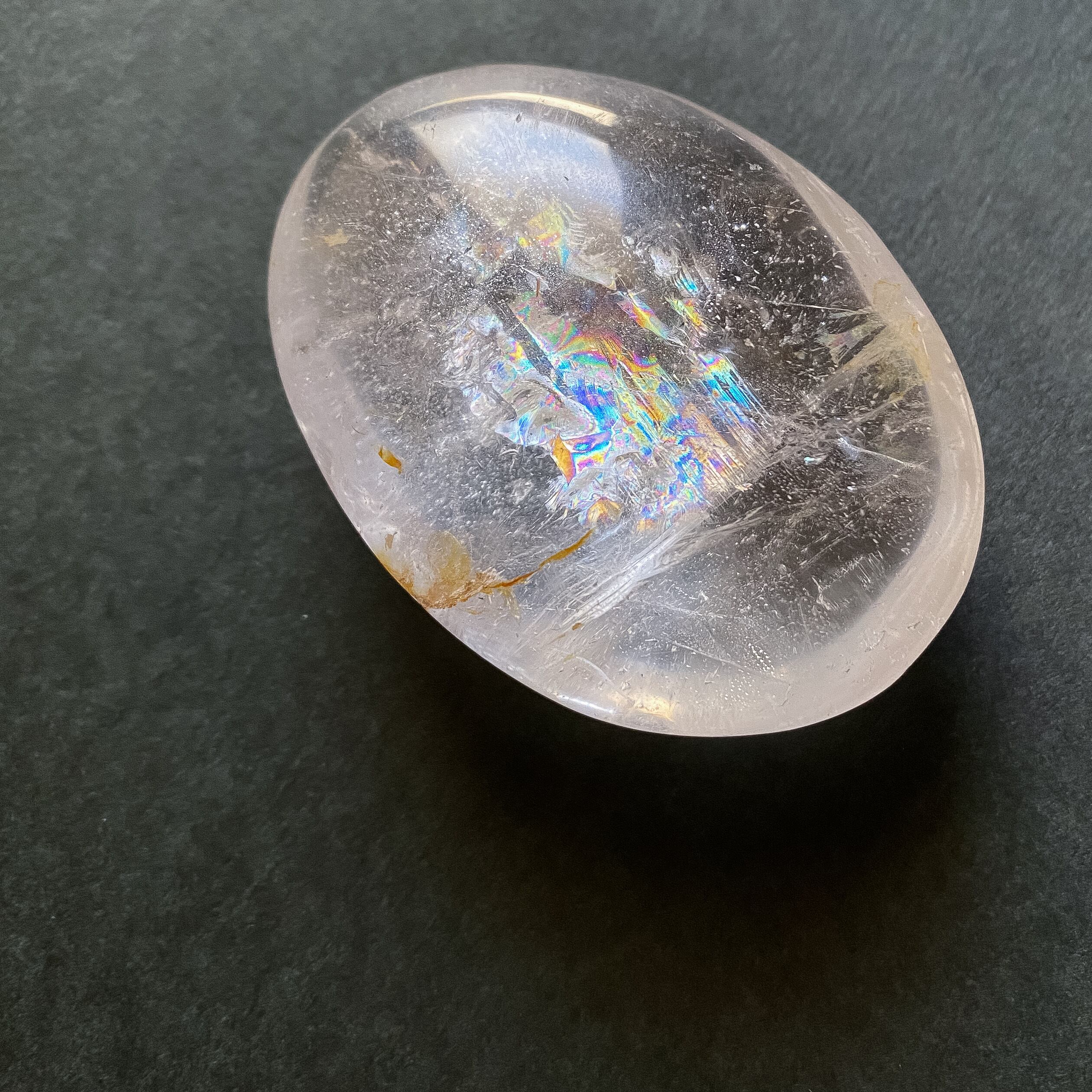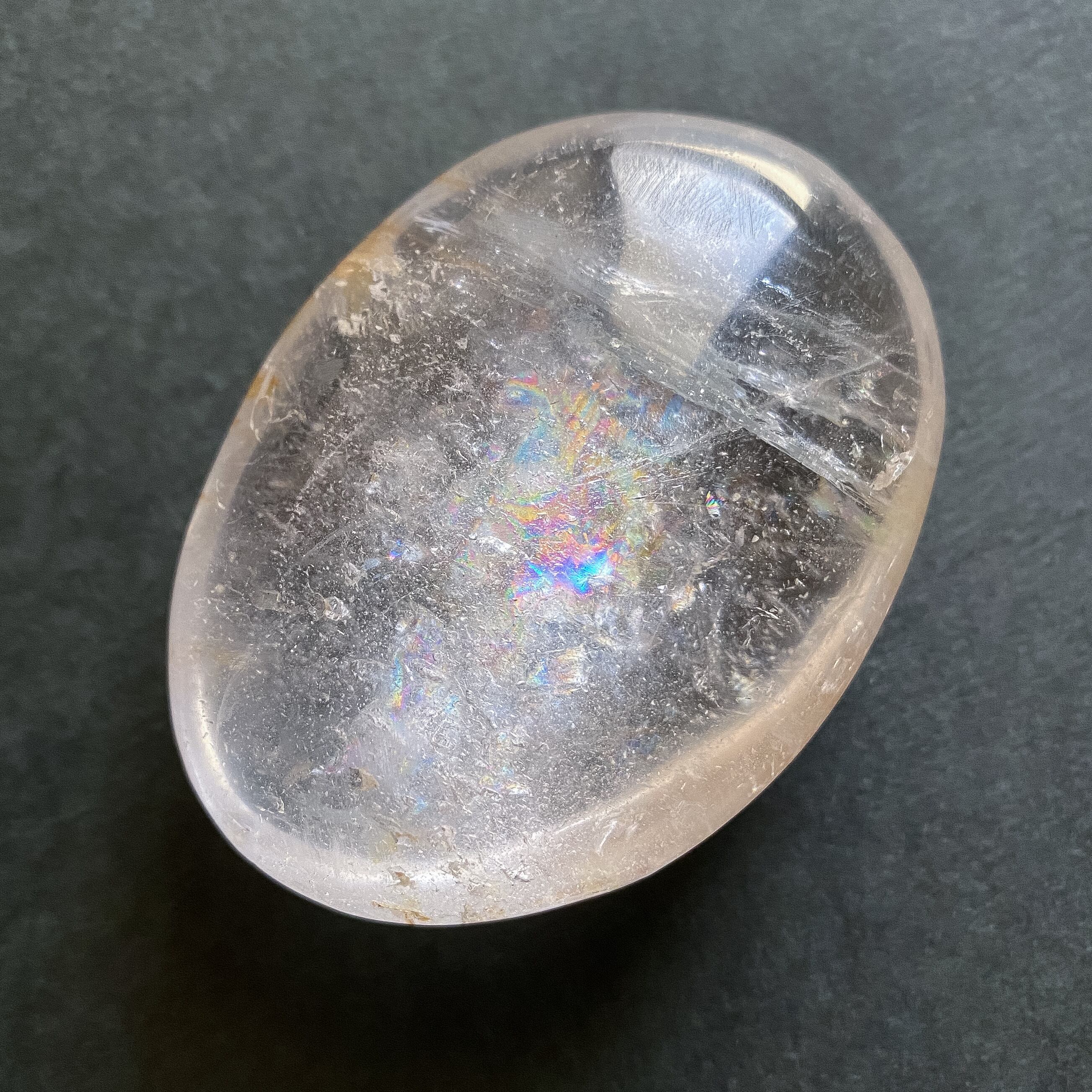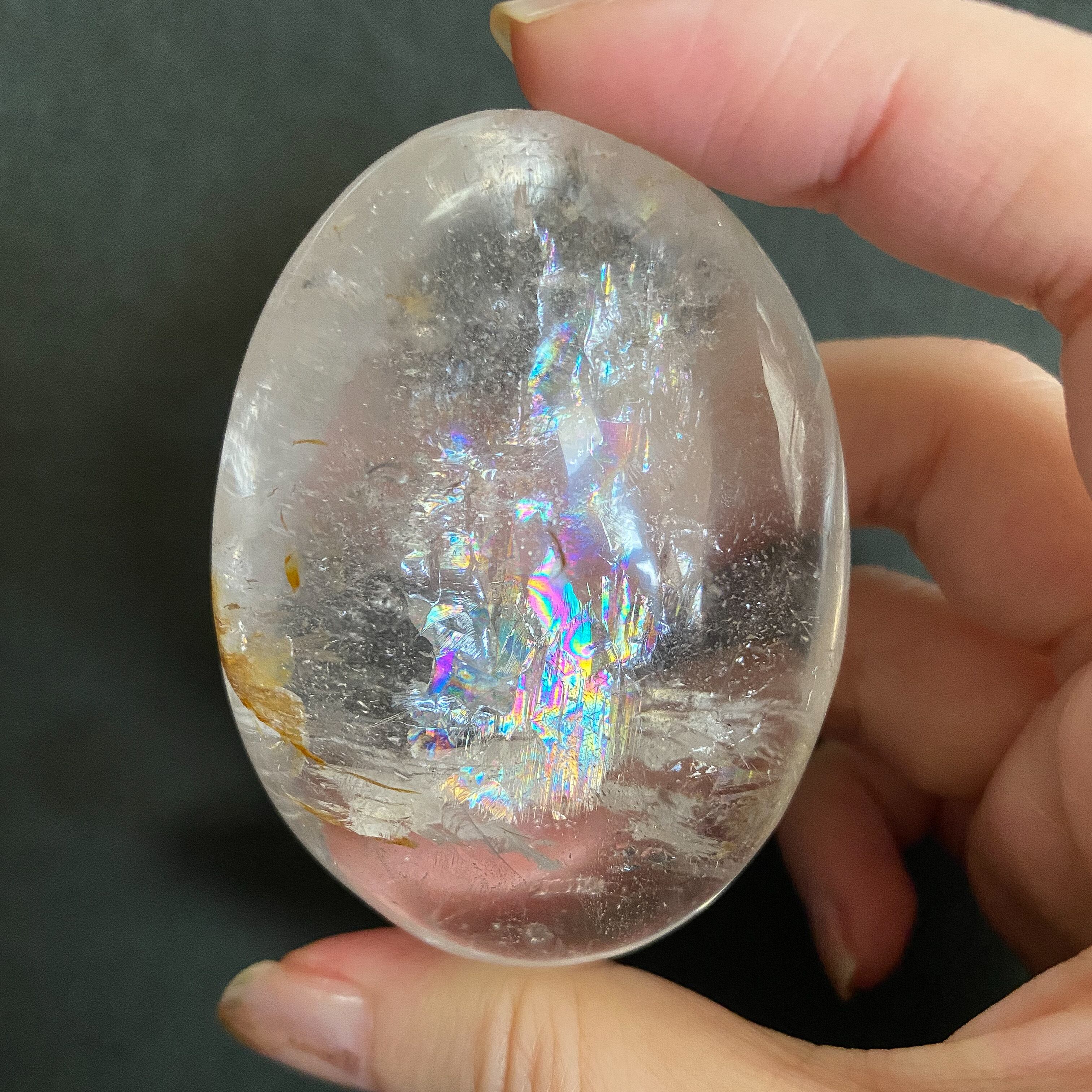 大きな虹の入ったマダガスカル産天然水晶のパームストーンです。