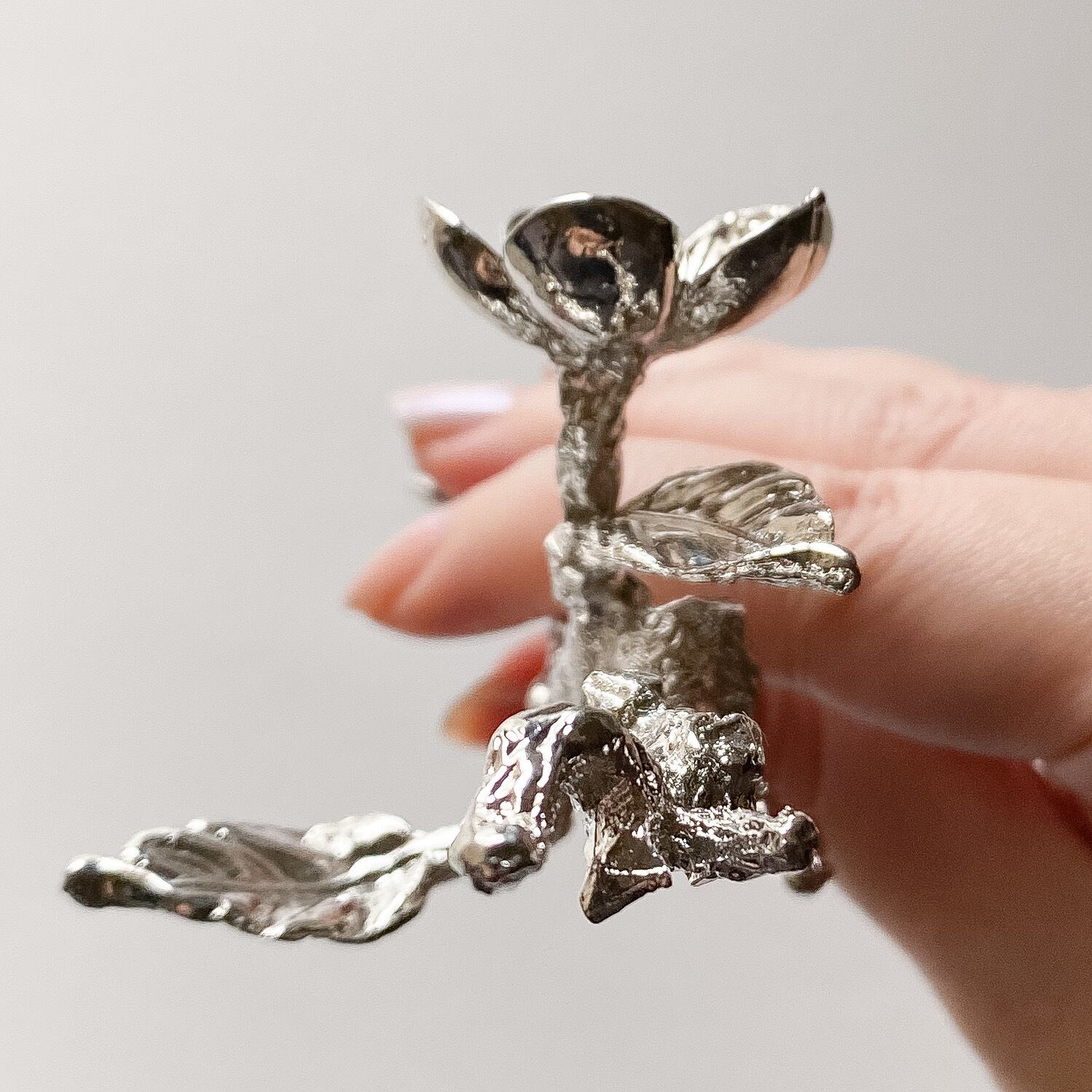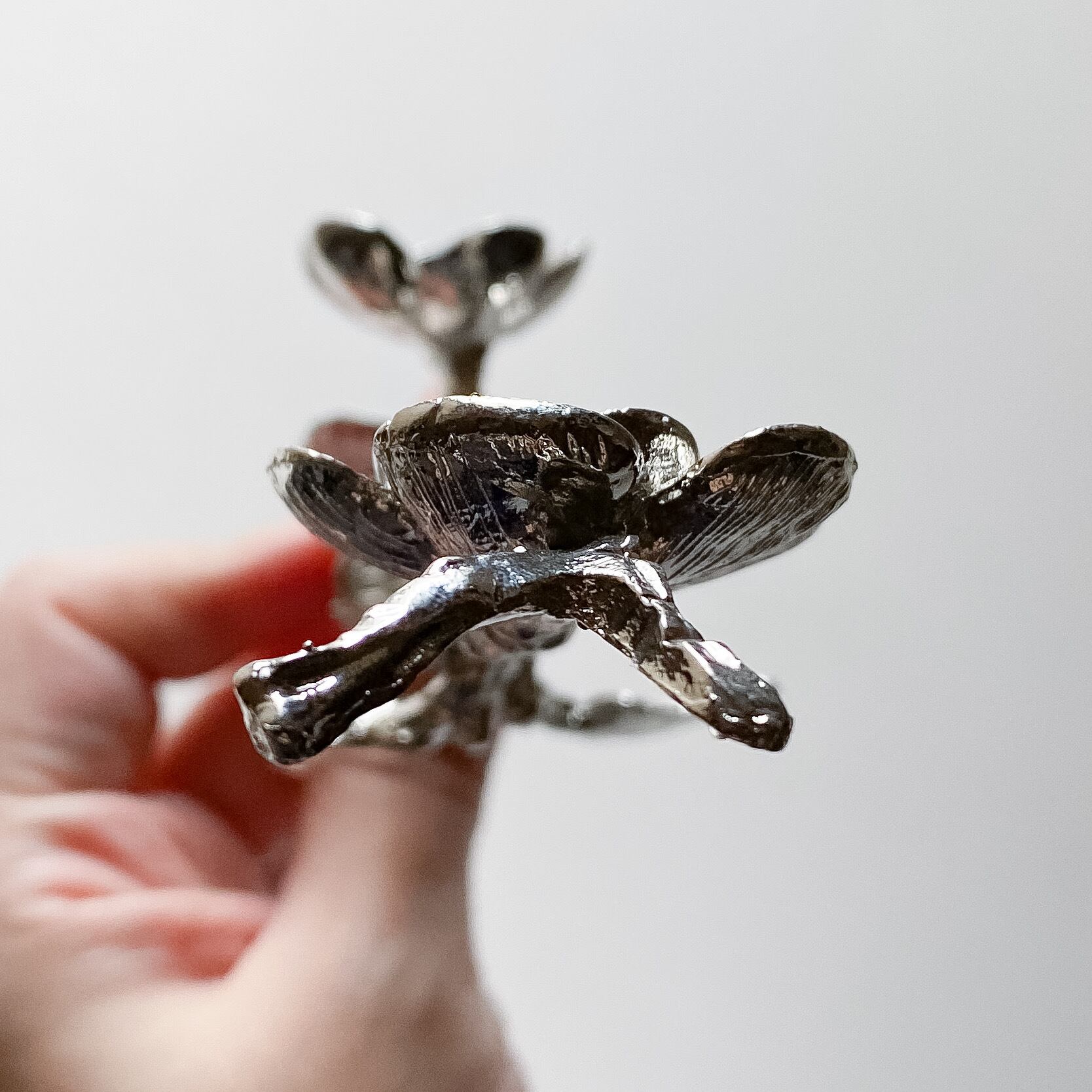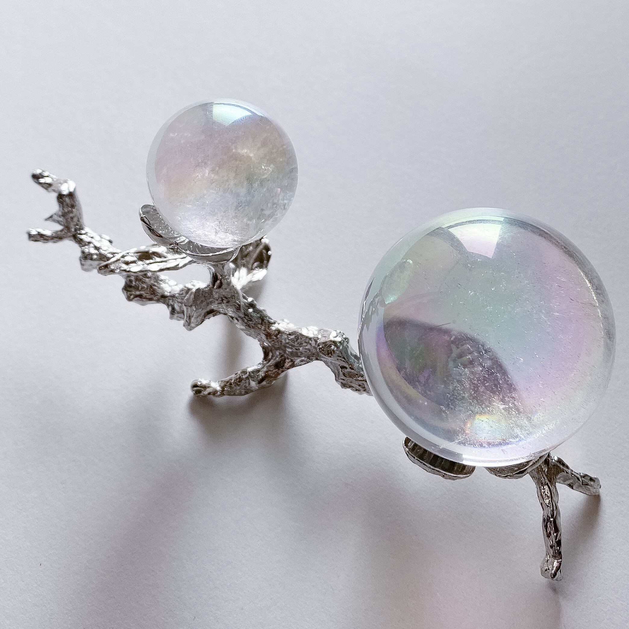 カラーはシルバーカラーの金属製で、お花二輪の部分が台座となりますのでスフィアを2点飾ることが出来ます。