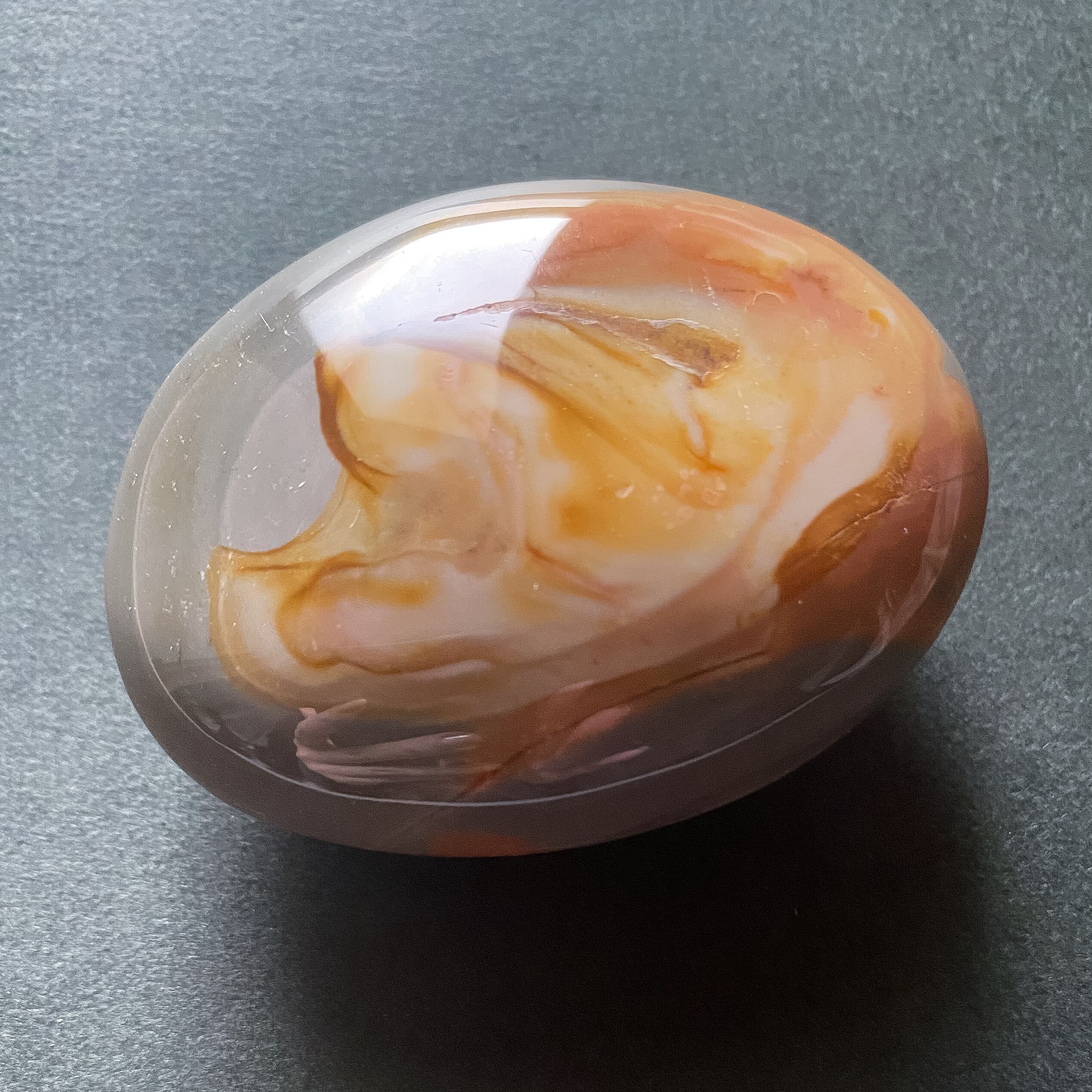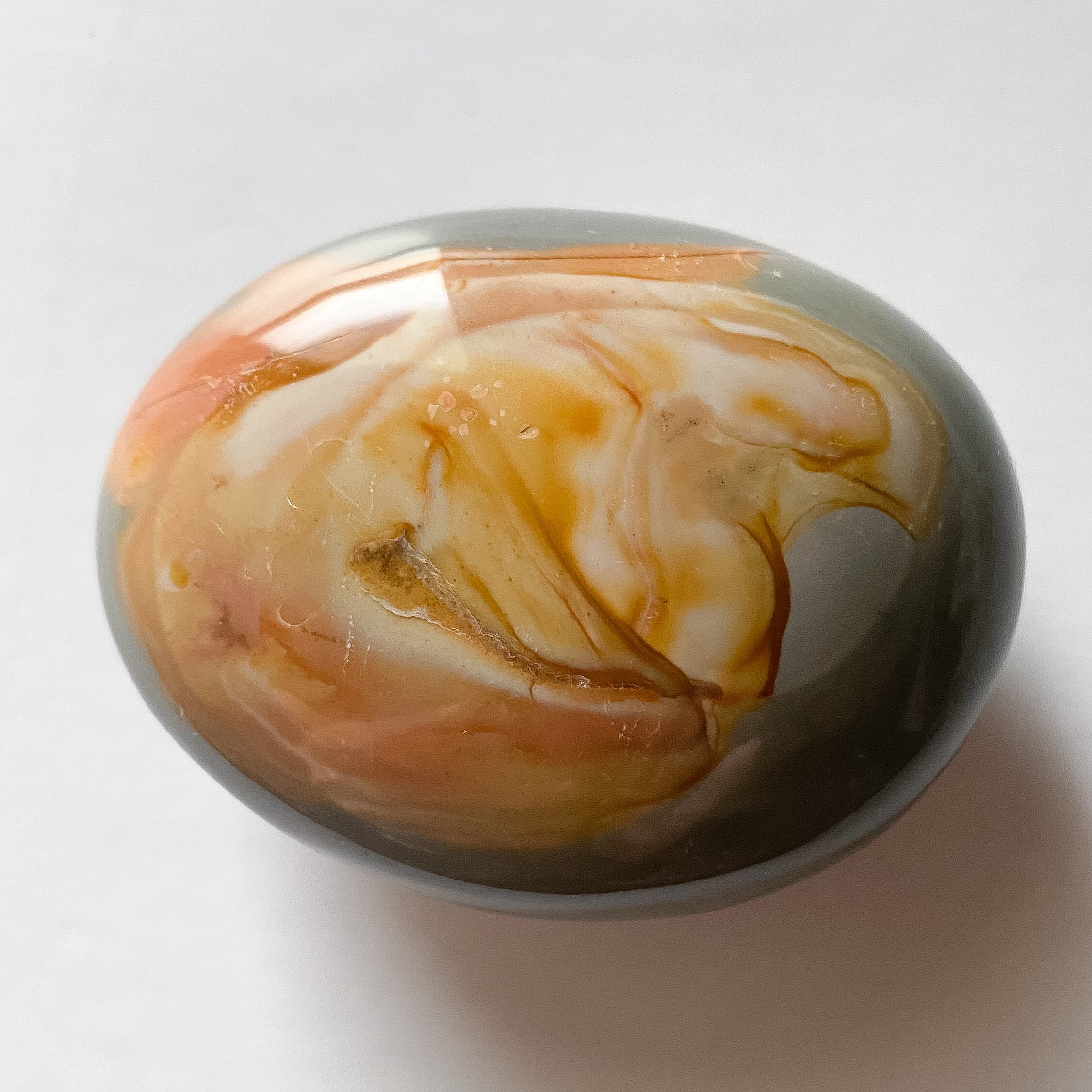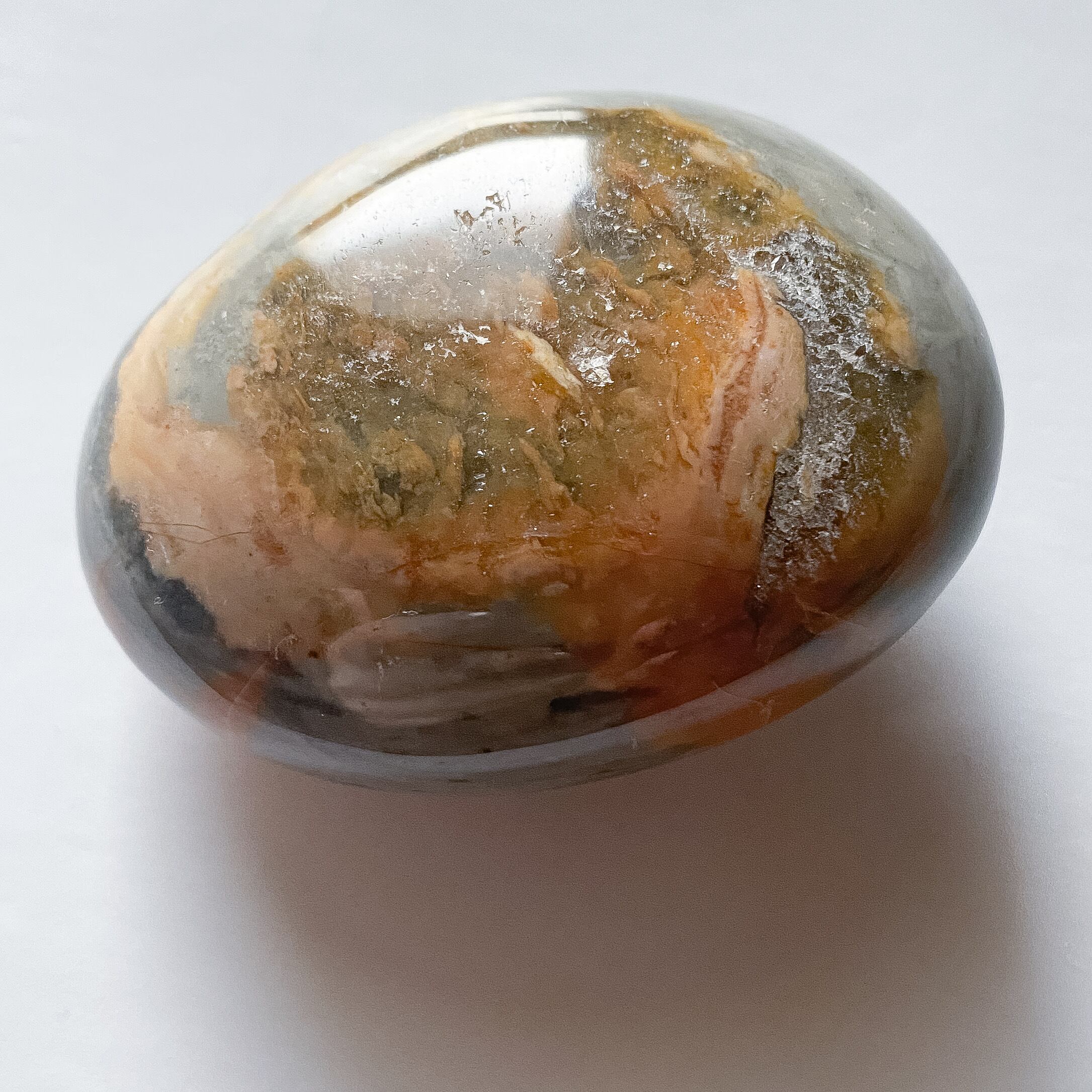 落ち着いたグレーカラーの上に絵の具を乗せたように様々な色が混じり合い、両面、少し違った風合いでくるくると回しながら個性を楽しんで頂けるパームストーンだと思います。