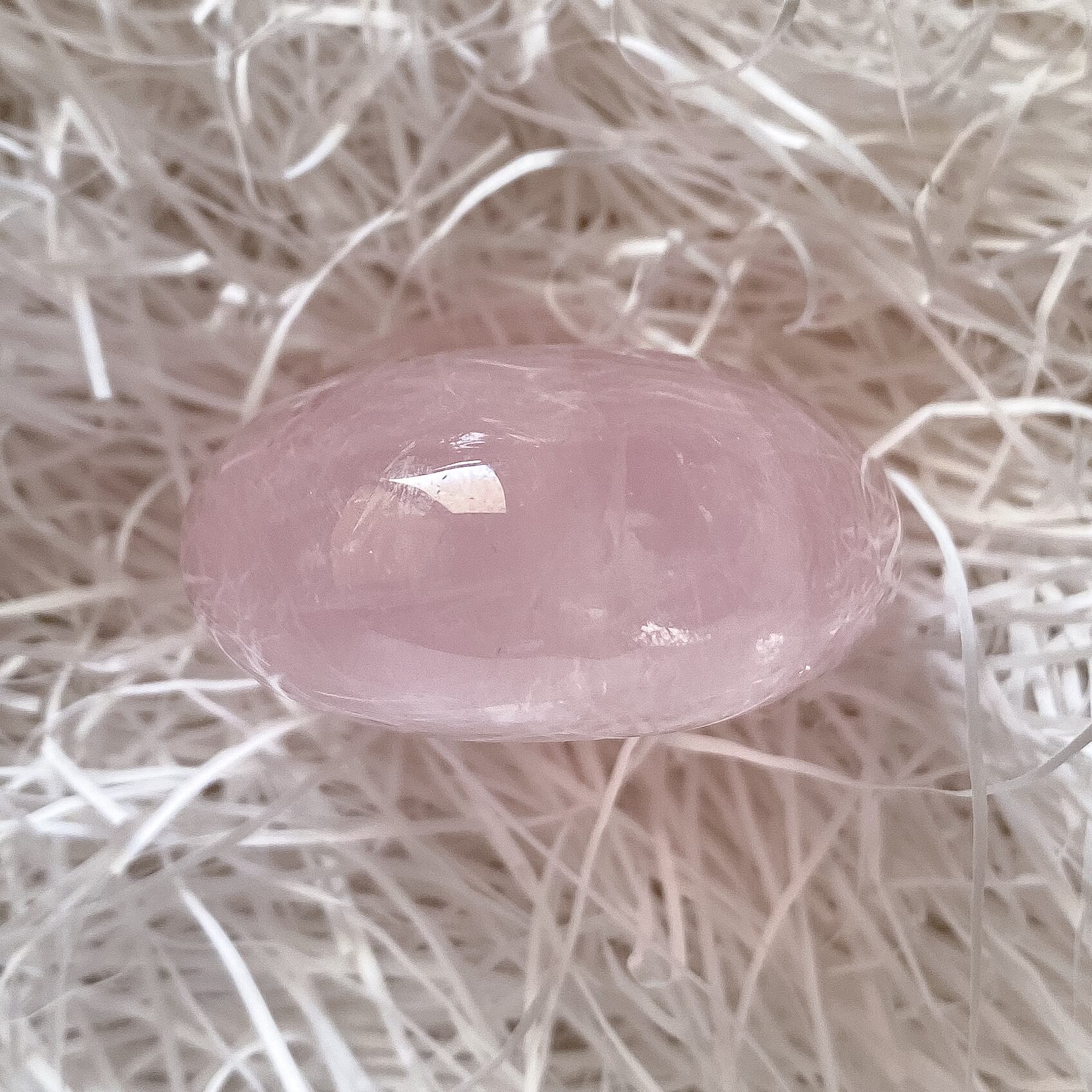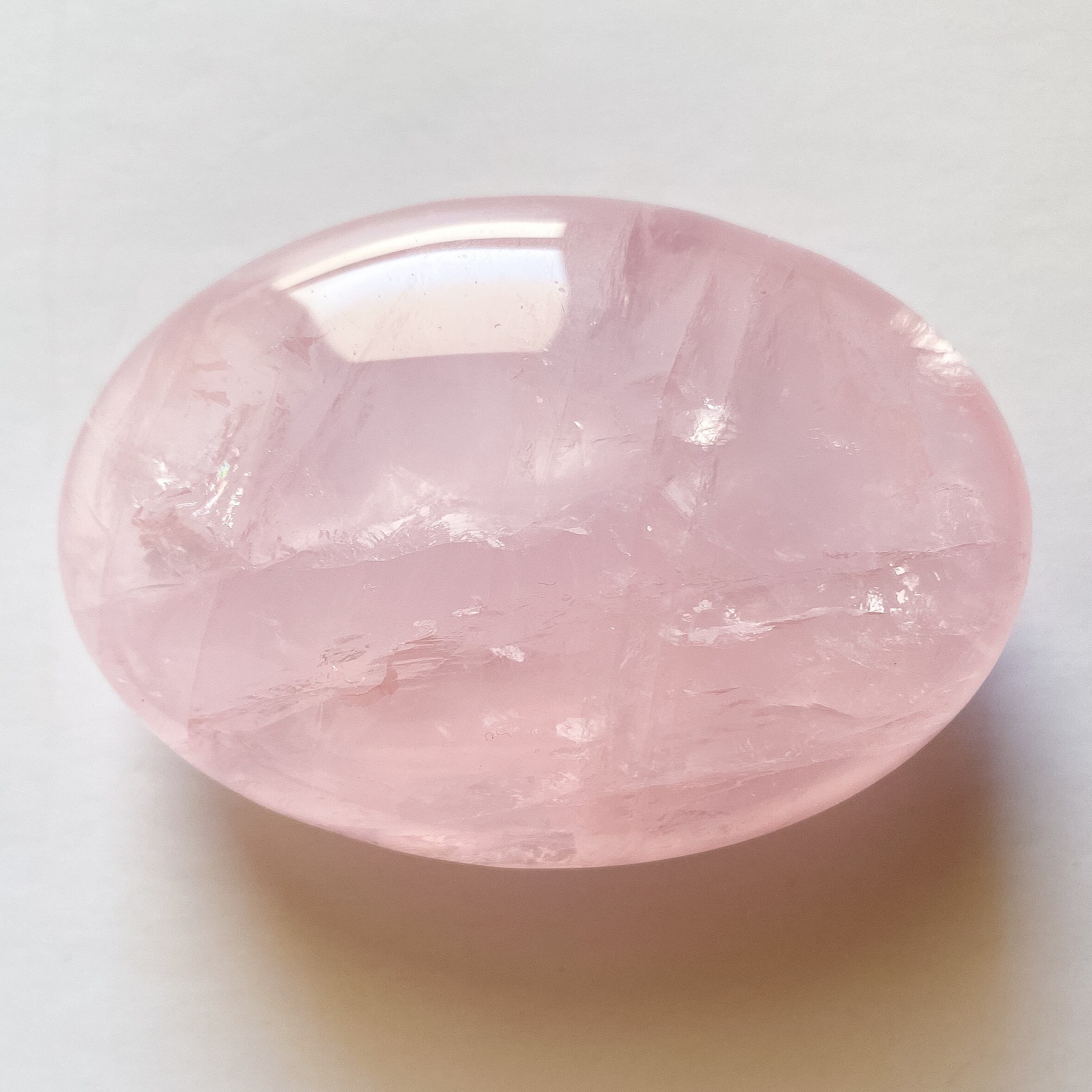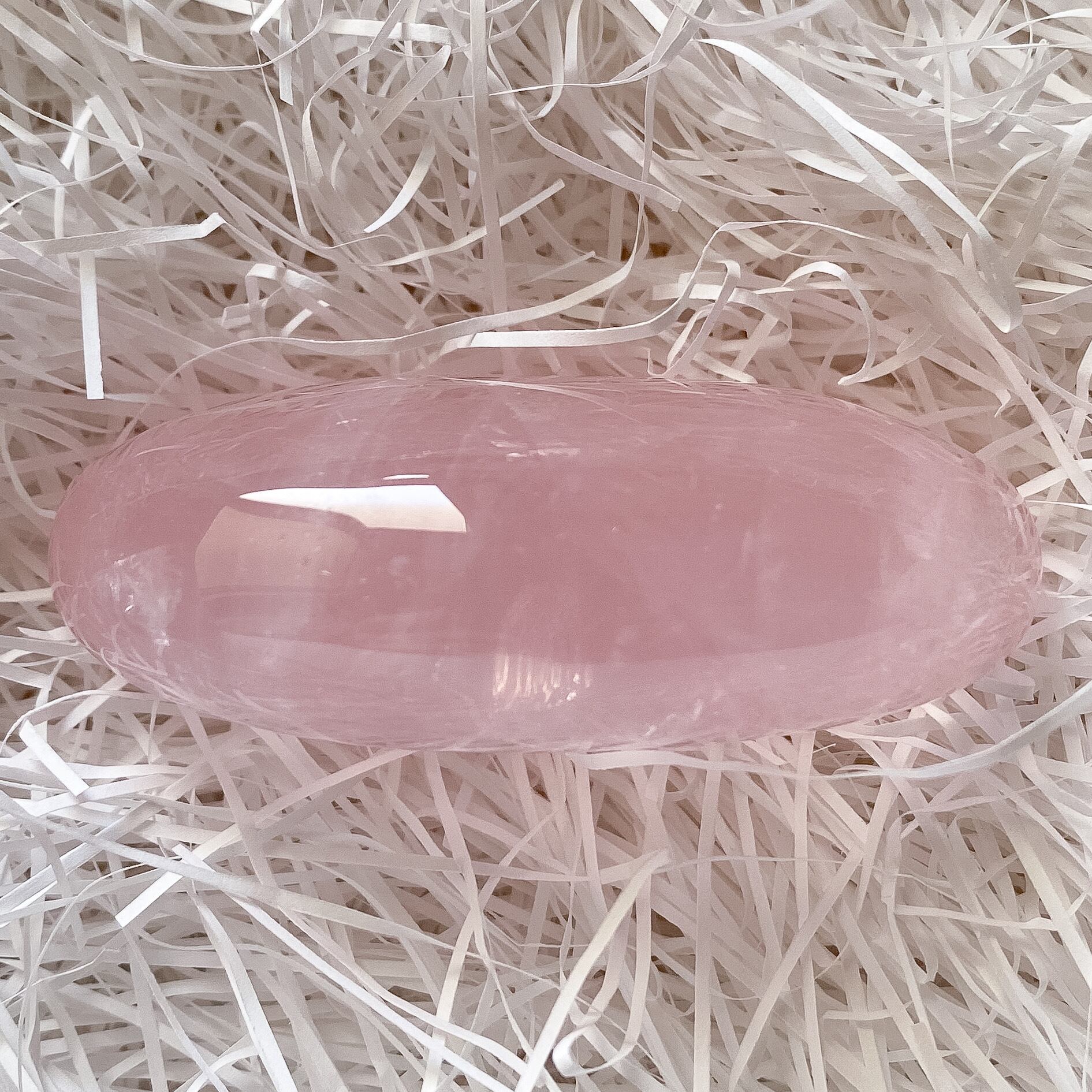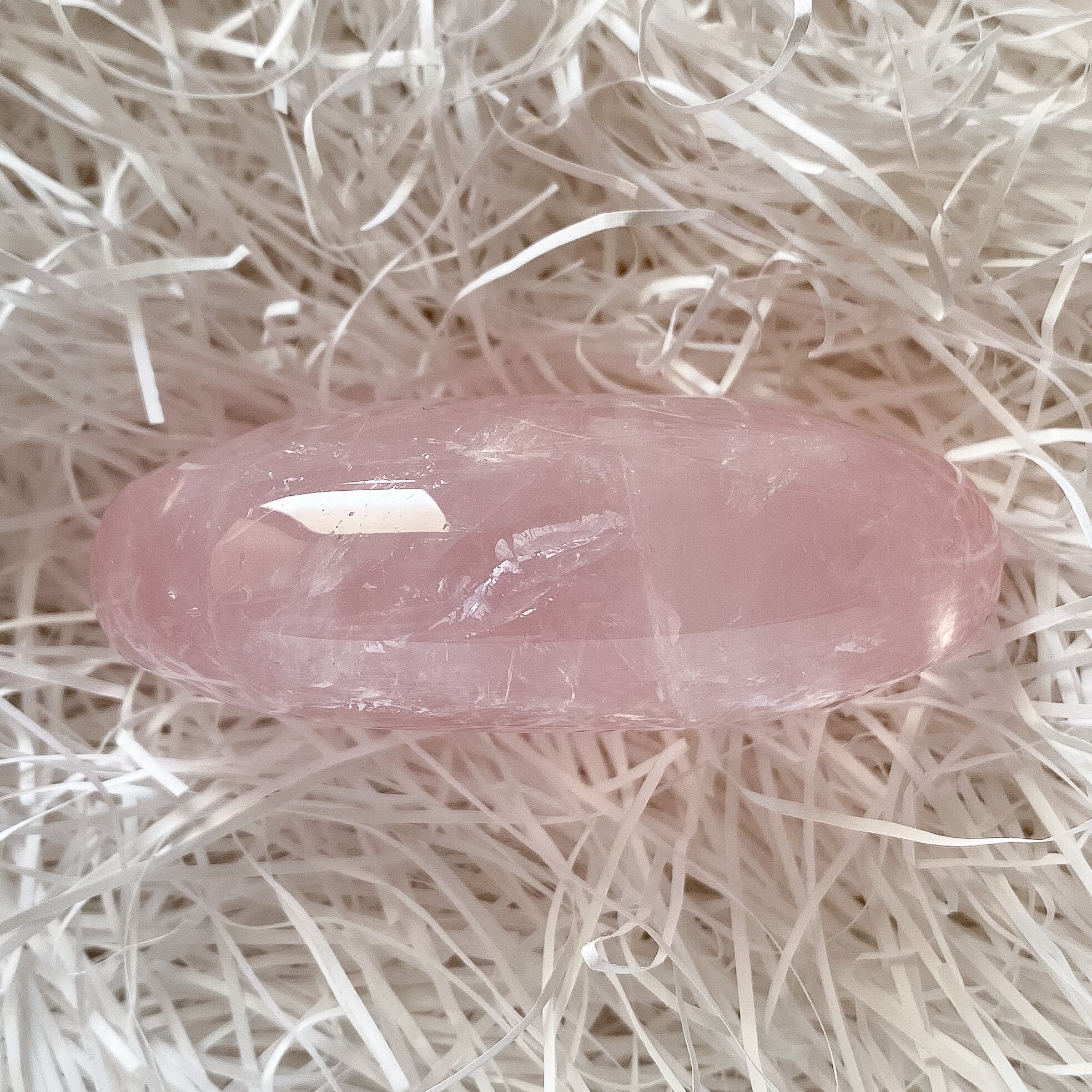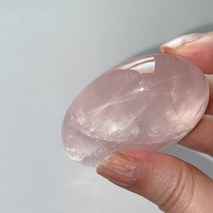 手の平に丁度良いサイズ感で、ローズクォーツの優しく柔らかな色合いや感触を確かめて頂けるパームストーンだと思います。