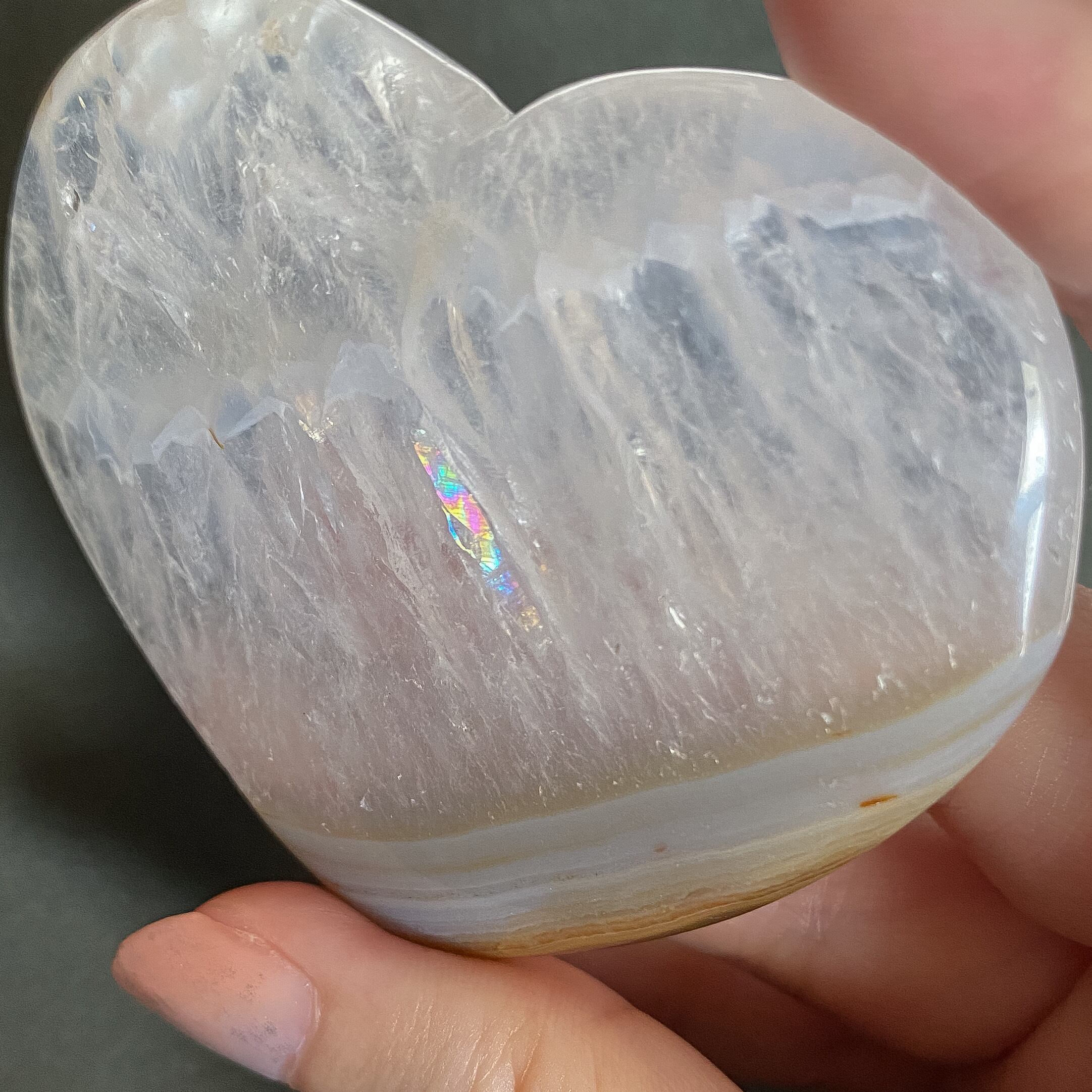 クォーツ部分は柔らかいホワイトカラーで透明感も感じられます。虹が見られる部分もあり、山型のファントム部分が入っています。