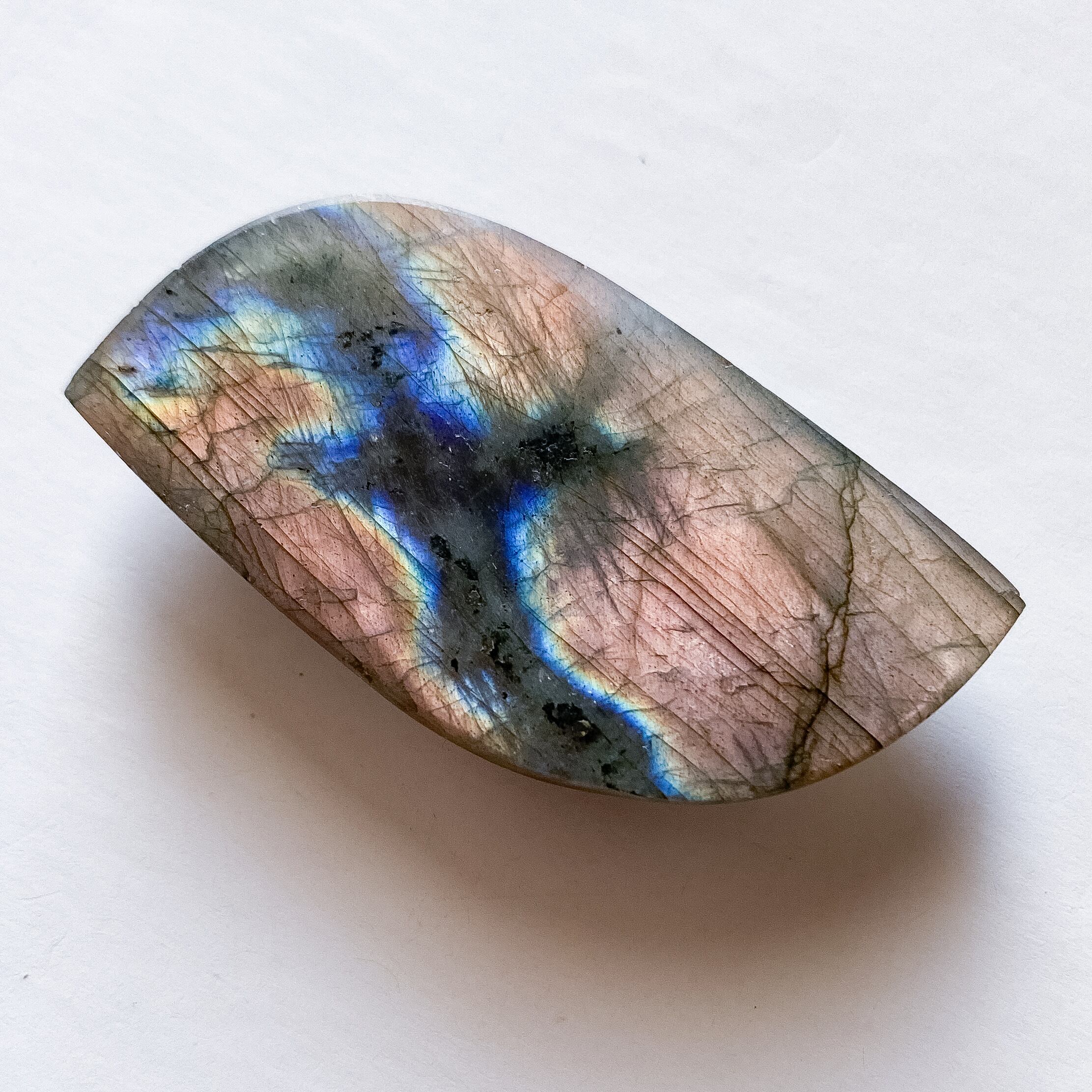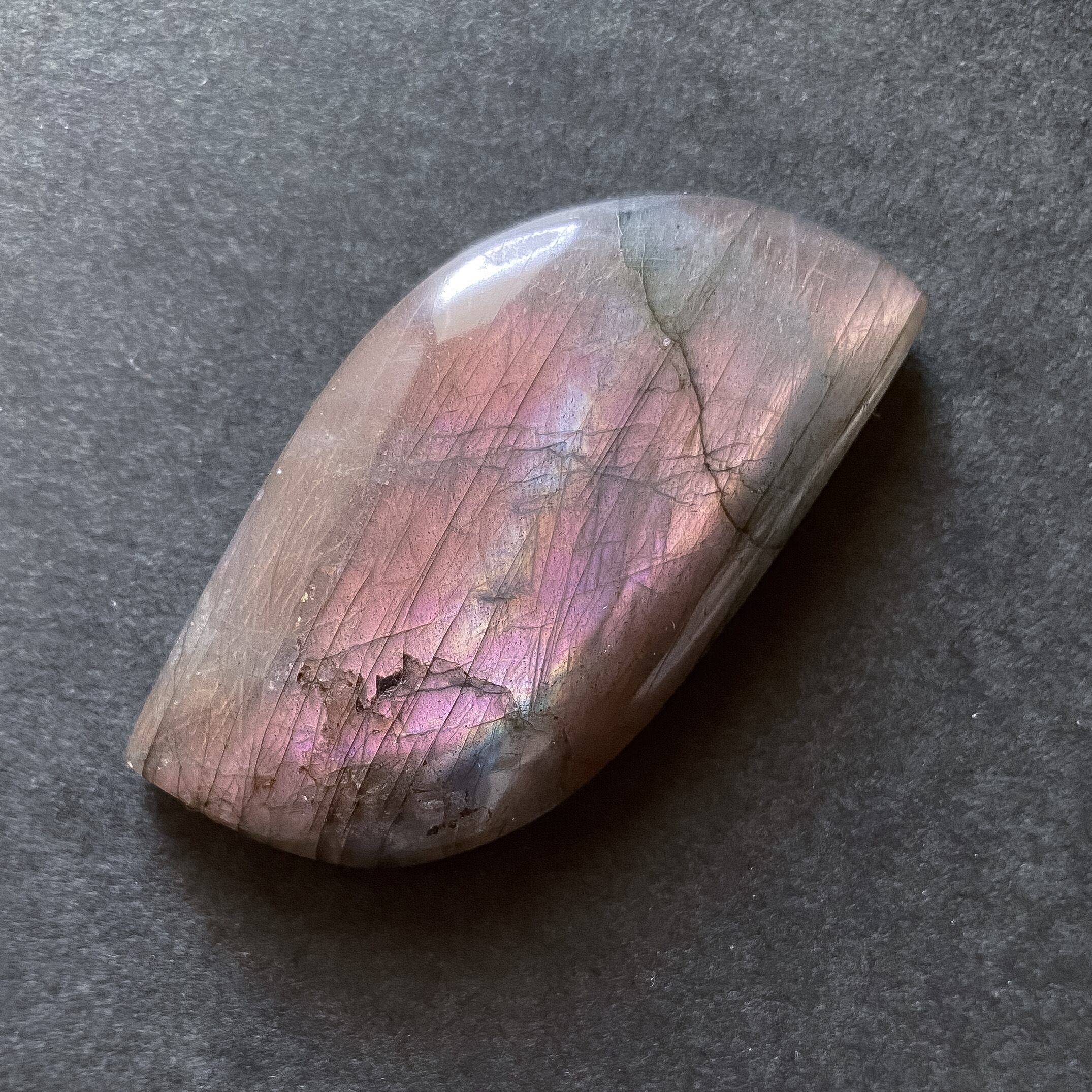 地色が灰〜黒色で、内部にラブラドレッセンスと呼ばれるシラーの層を持ちます。シラーの色は多彩で青色、虹色、ピンク、紫と様々です。
