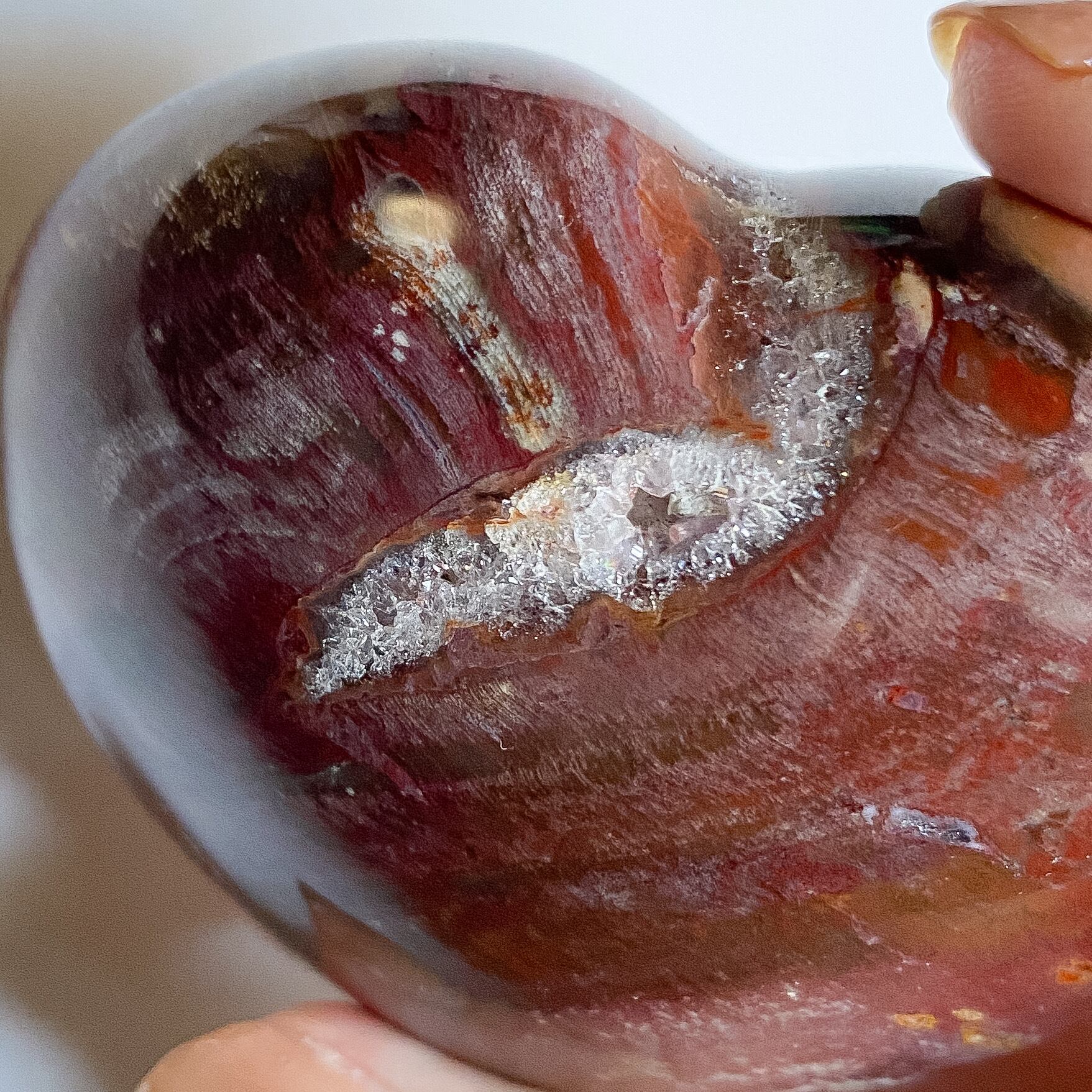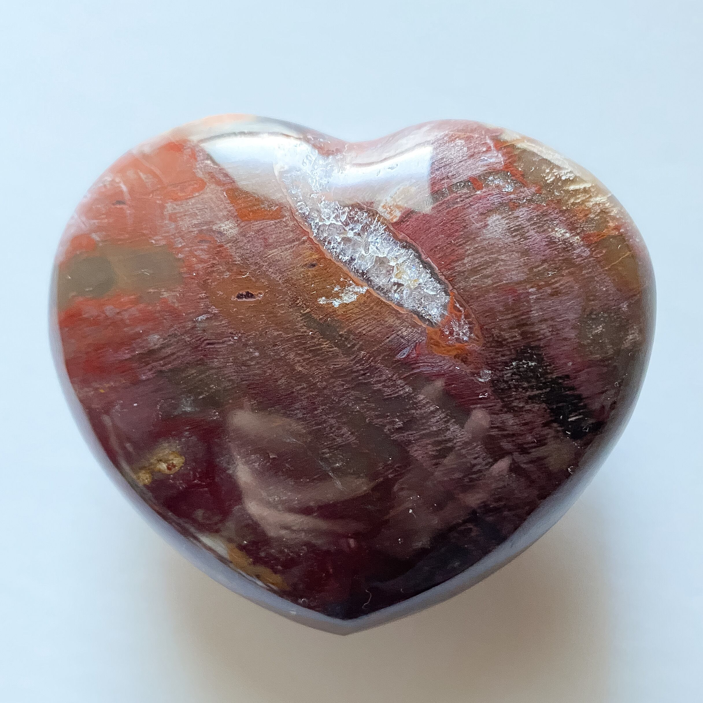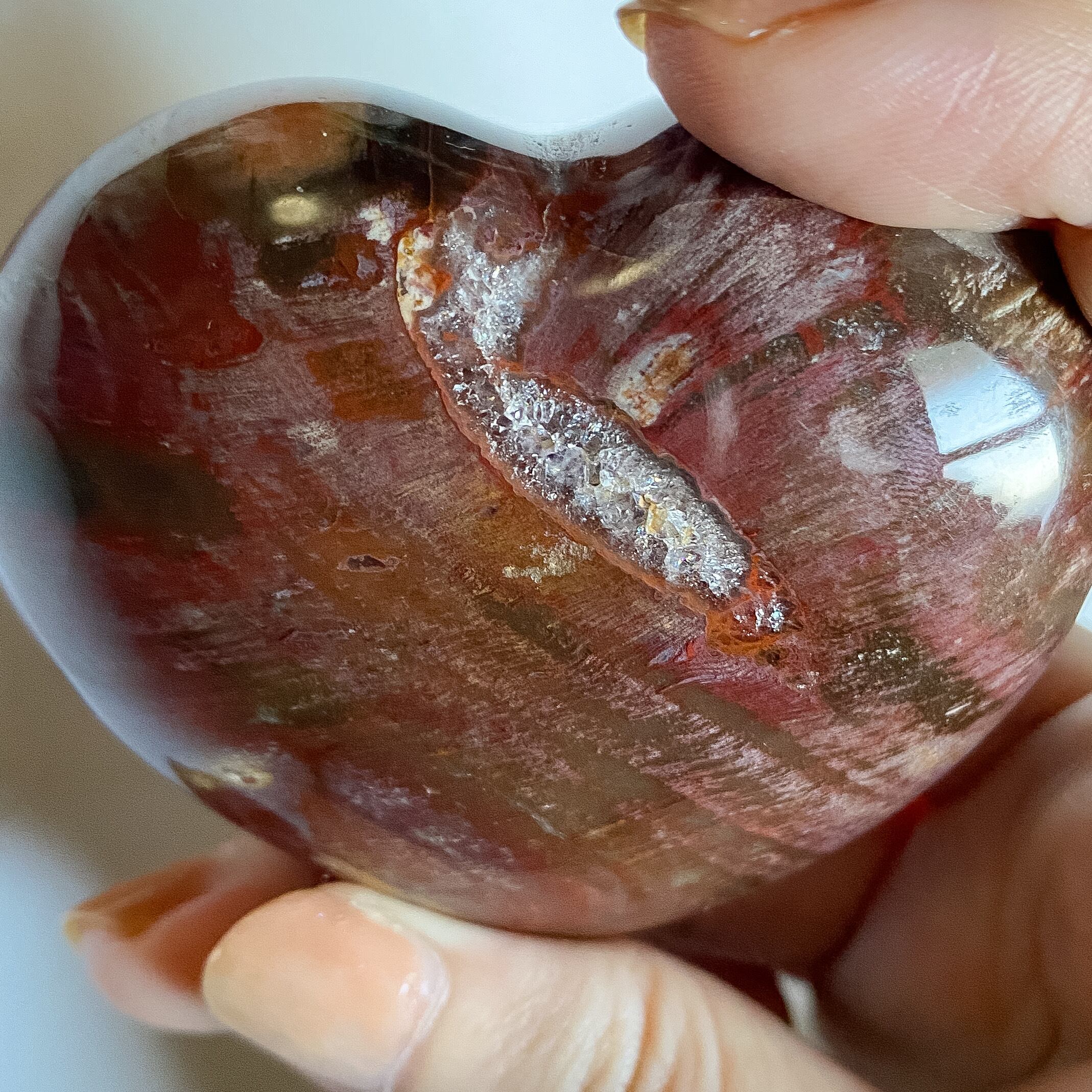 地色は茶〜赤褐色で、全体的に瑪瑙質の艶やかな光沢があります。ハートの中央〜上部にかけてクォーツ結晶化した部分も見られ、こちらもキラキラとした輝きがあります。