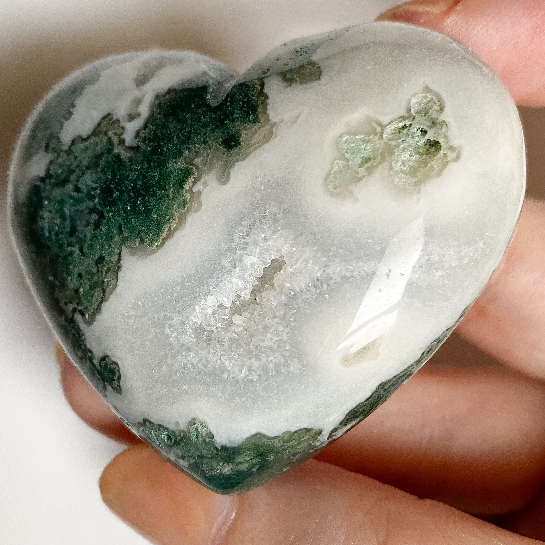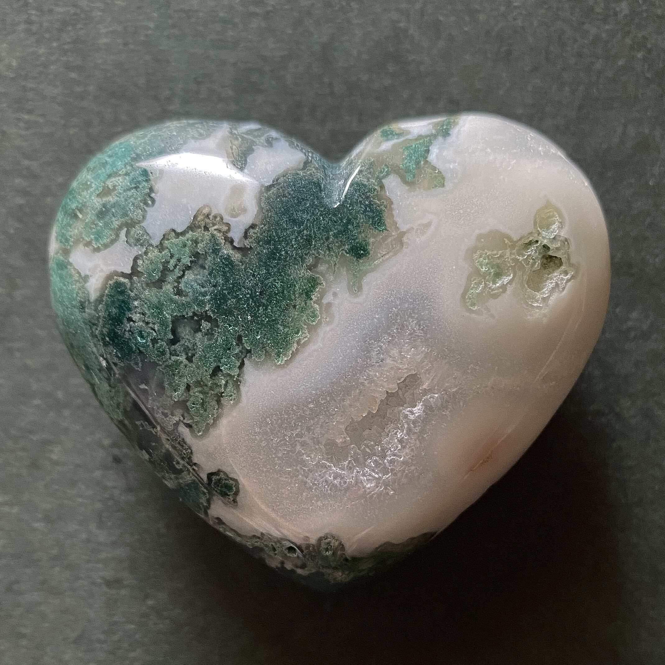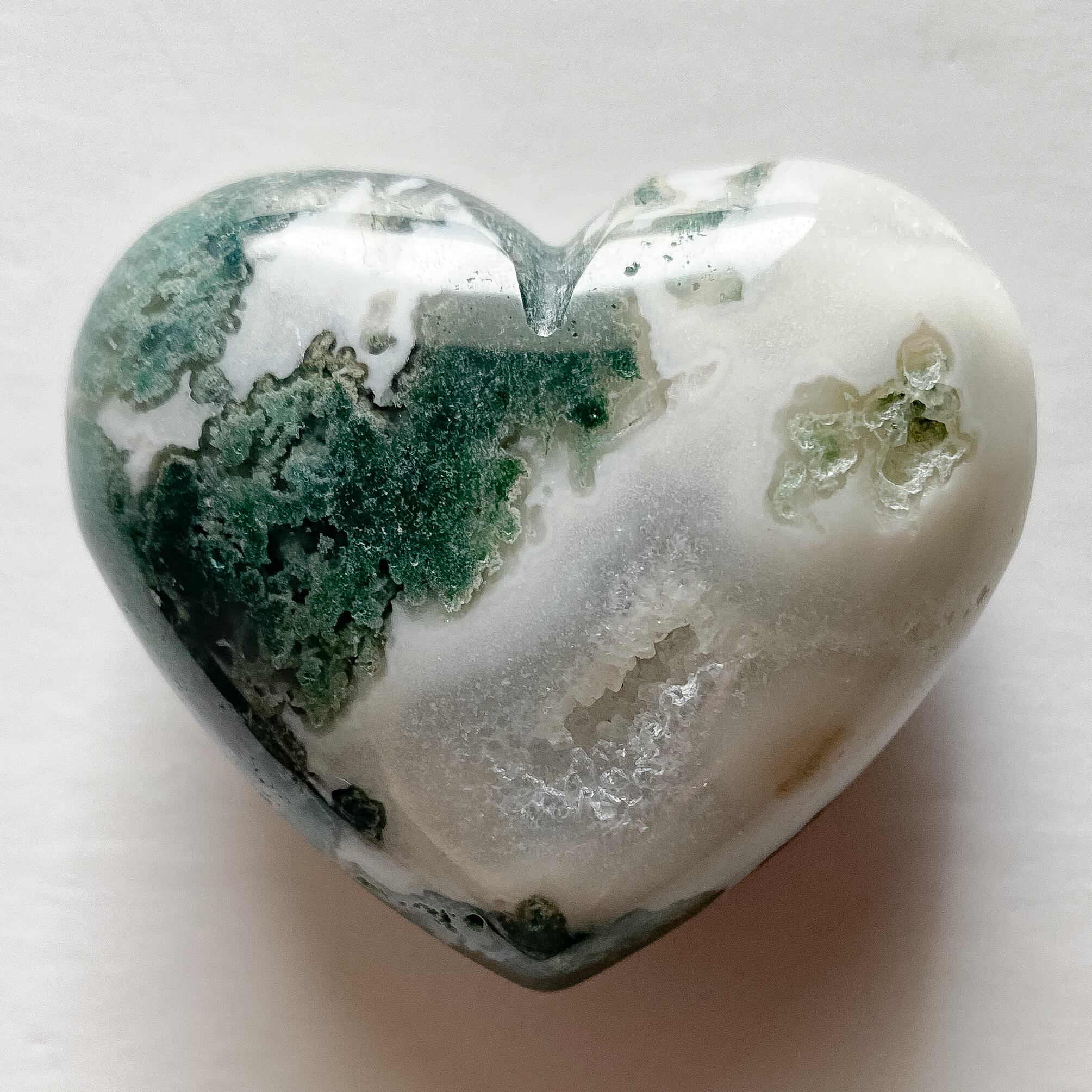 ジオード結晶の部分も見られ、緑と白のコントラストも鮮やかです。森を感じるようなクローライトと柔らかでソフトな色味のホワイトアゲートの組み合わせが可愛らしく癒しをくれそうなハートシェイプです。