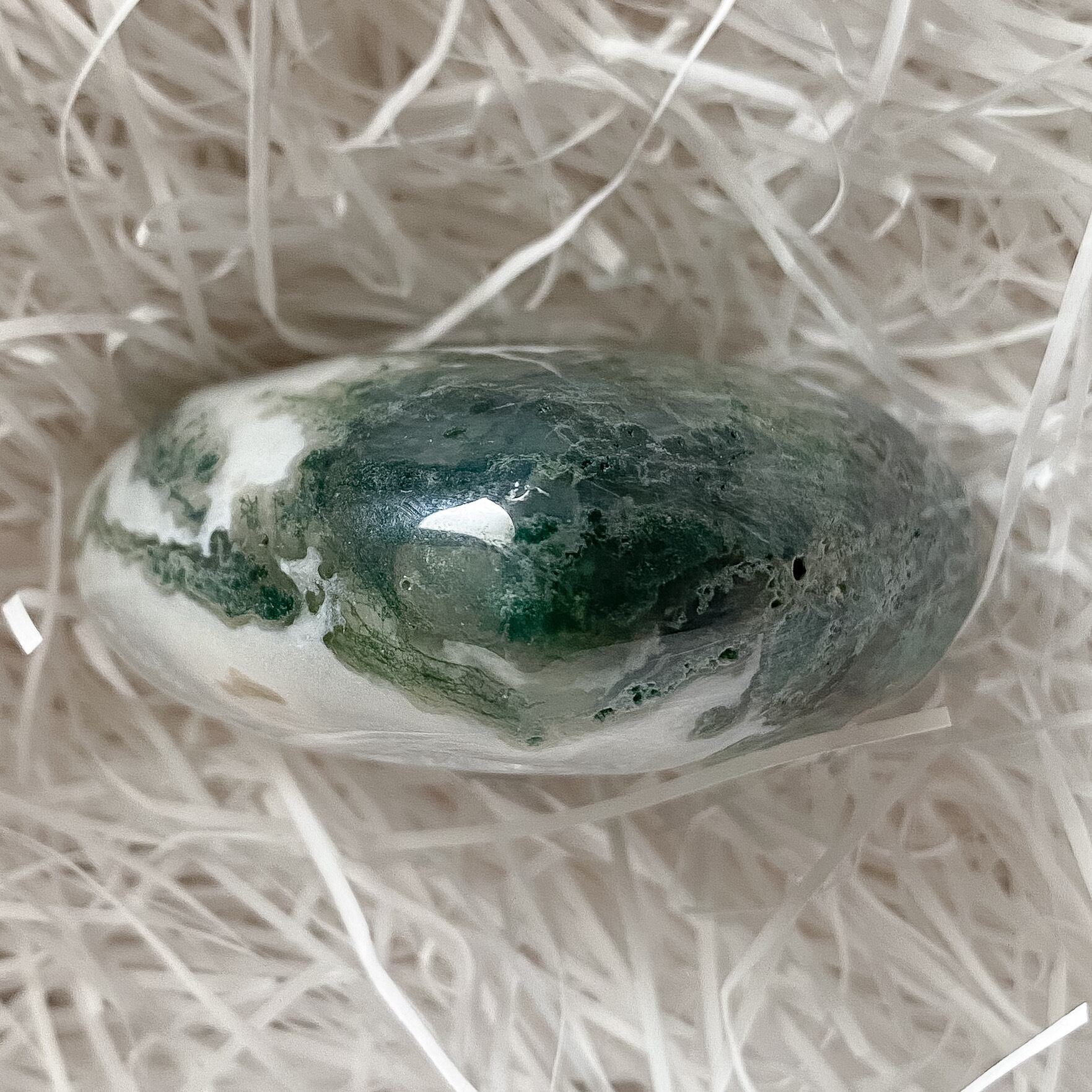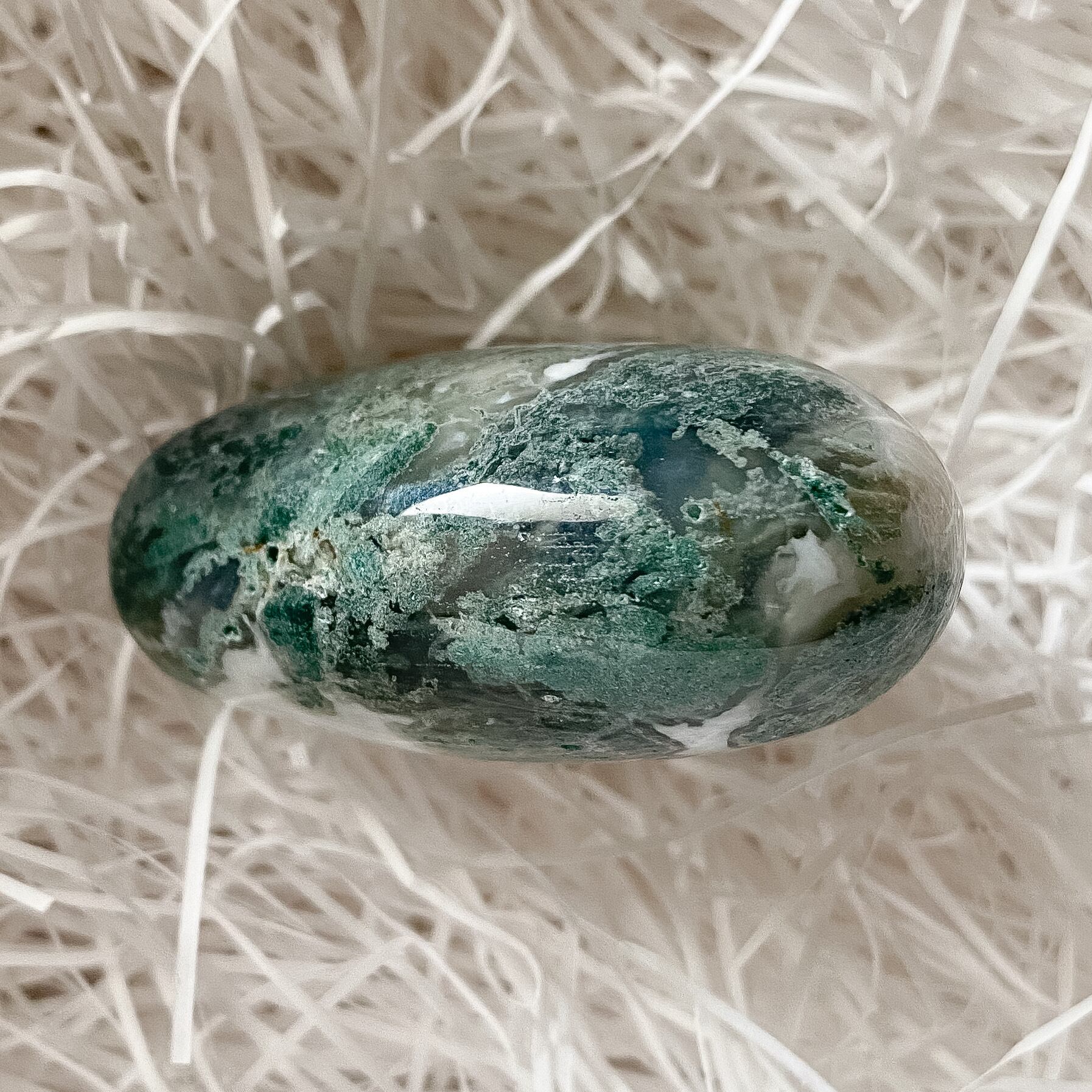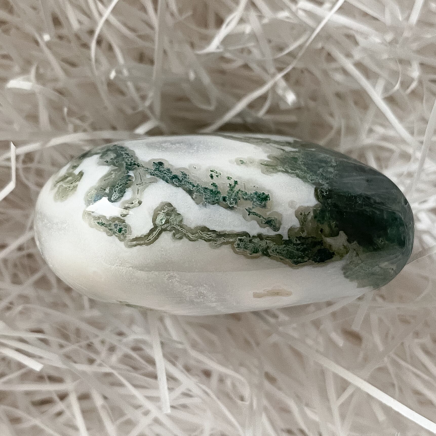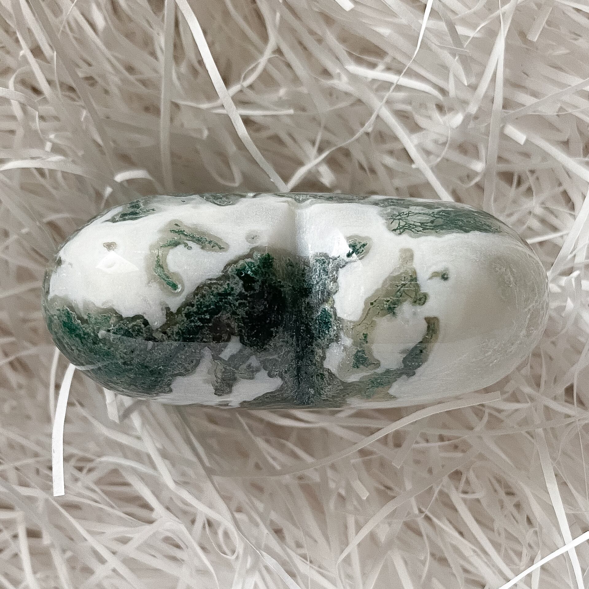 グリーンのクローライトが入る部分とミルクのようなホワイトアゲートが混じり合った高品質のモスアゲートです。研磨も良く形も整っています。