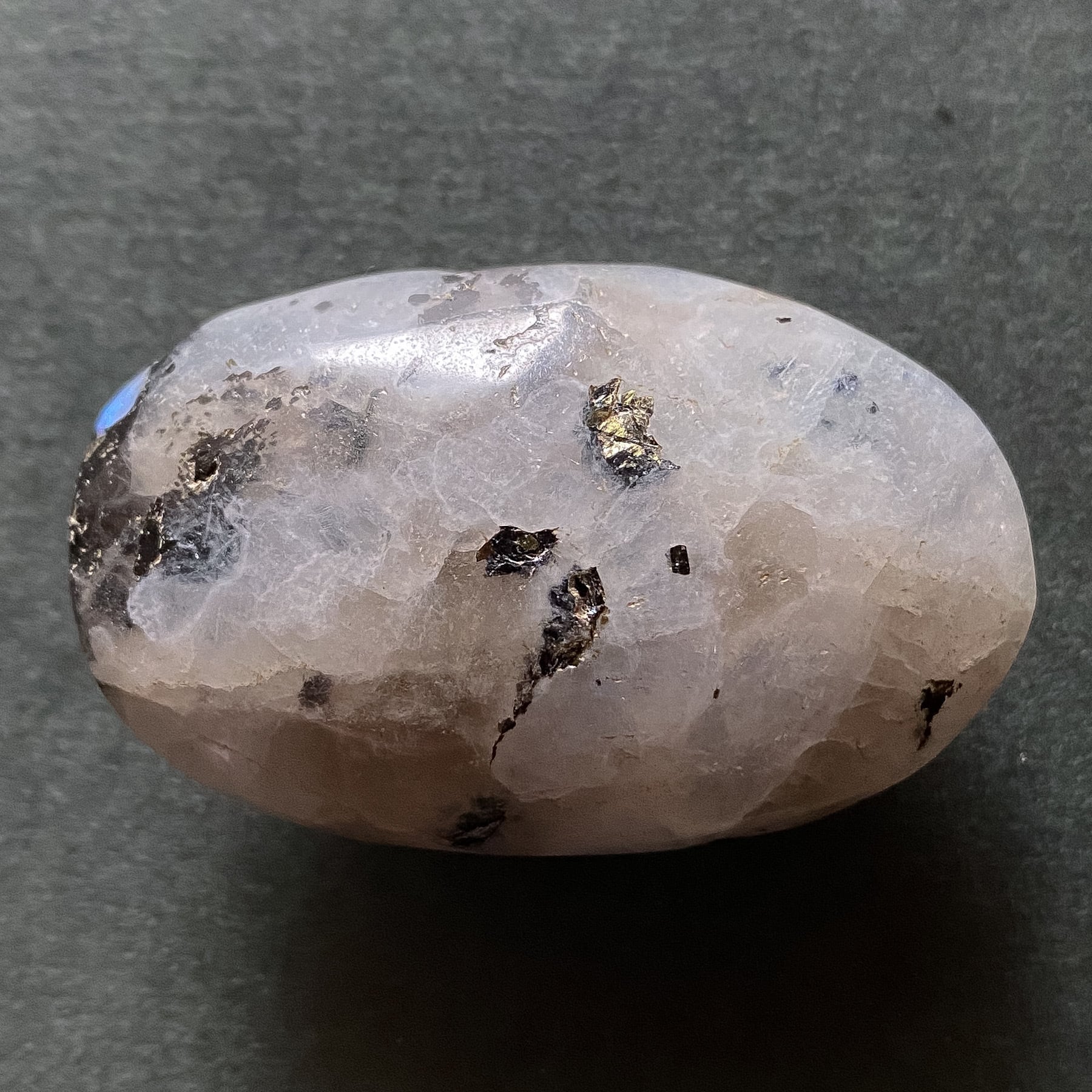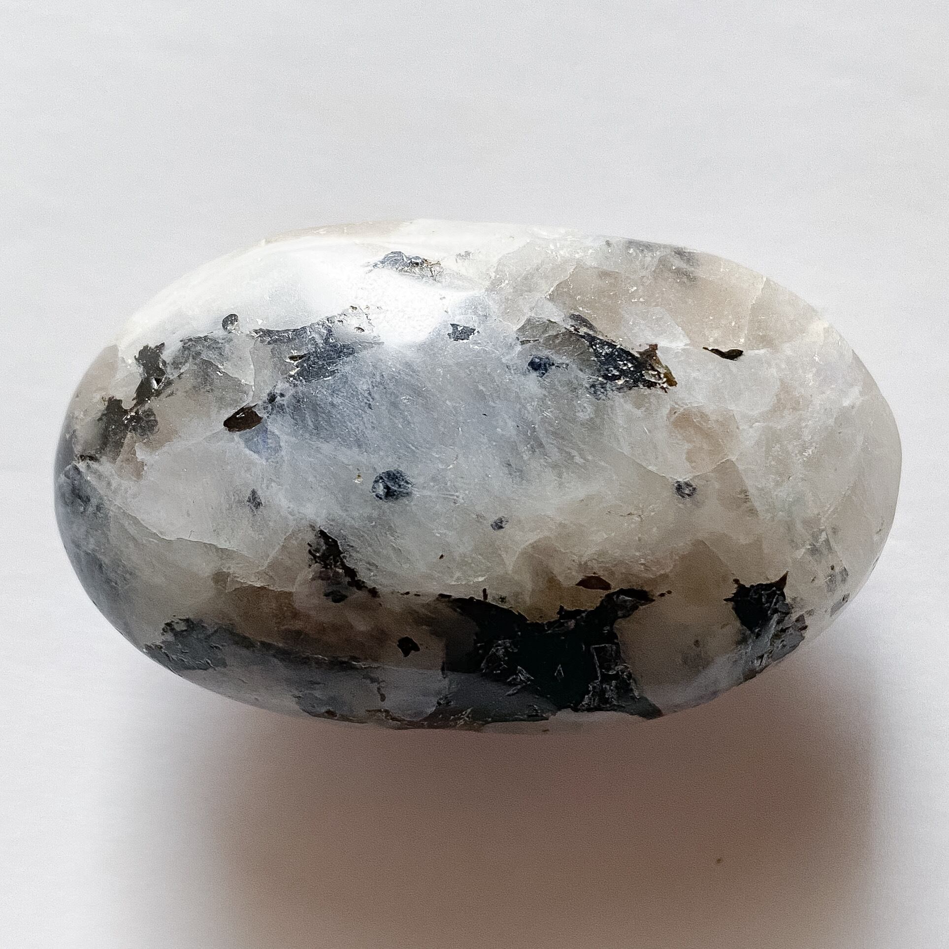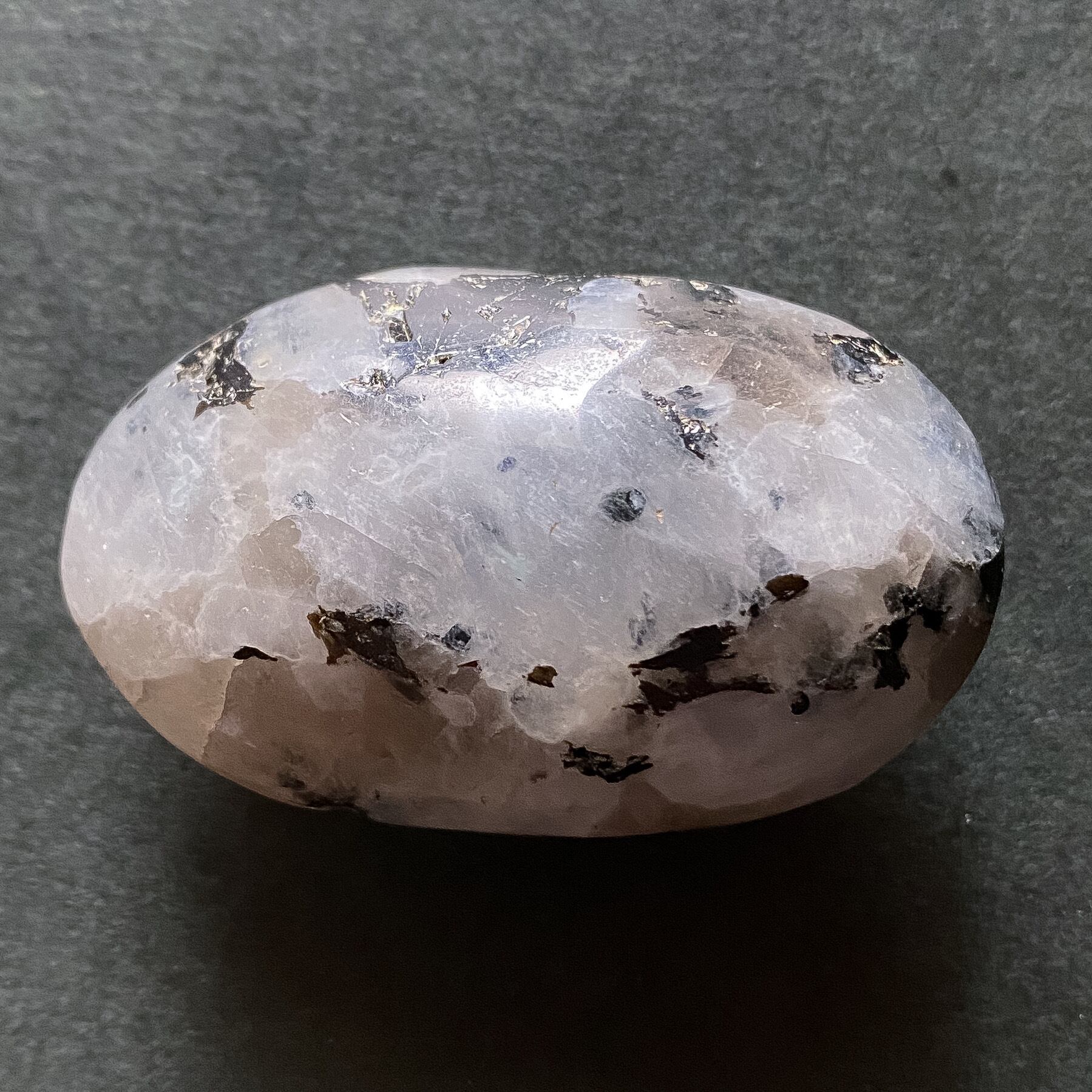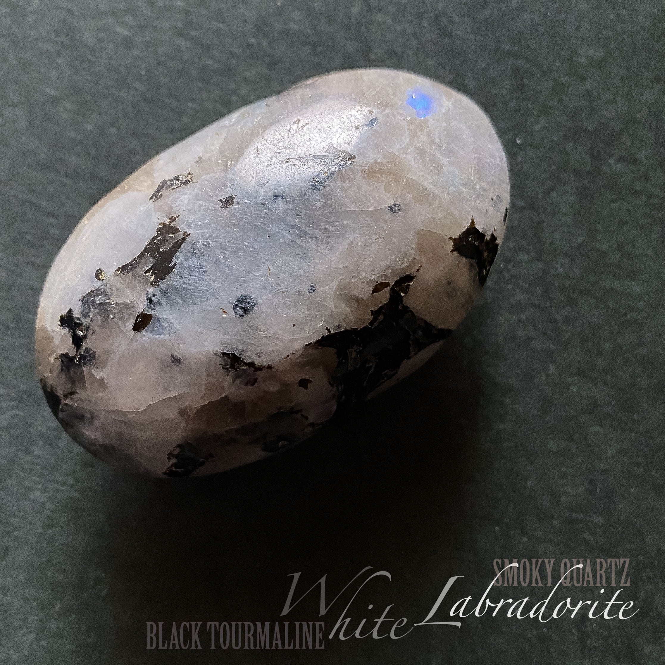 スリランカ産ホワイトラブラドライト(レインボームーンストーン)、スモーキークォーツ、ブラックトルマリンの複合鉱物のパームストーンです。