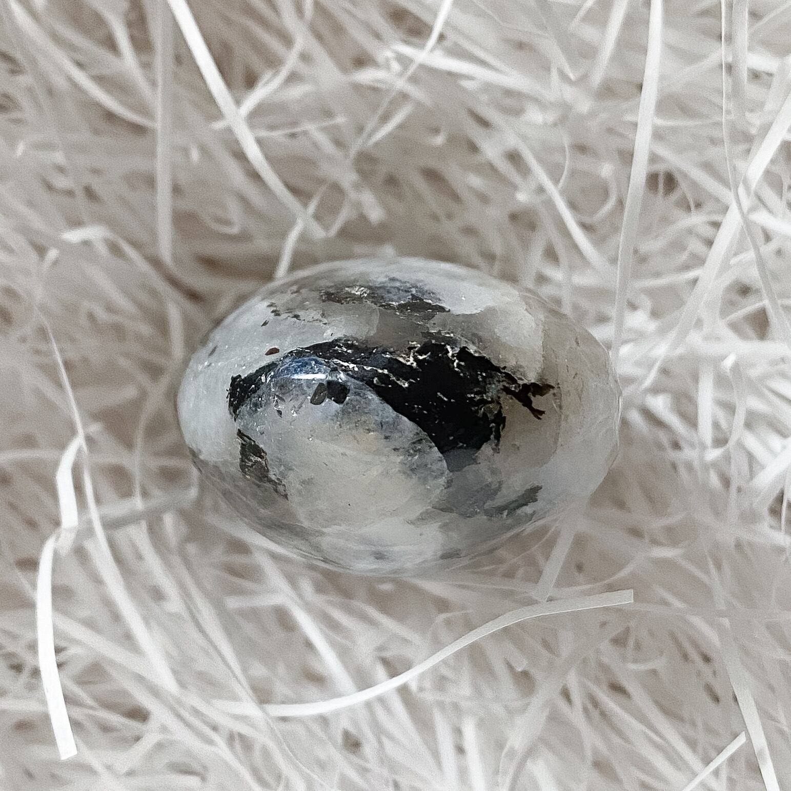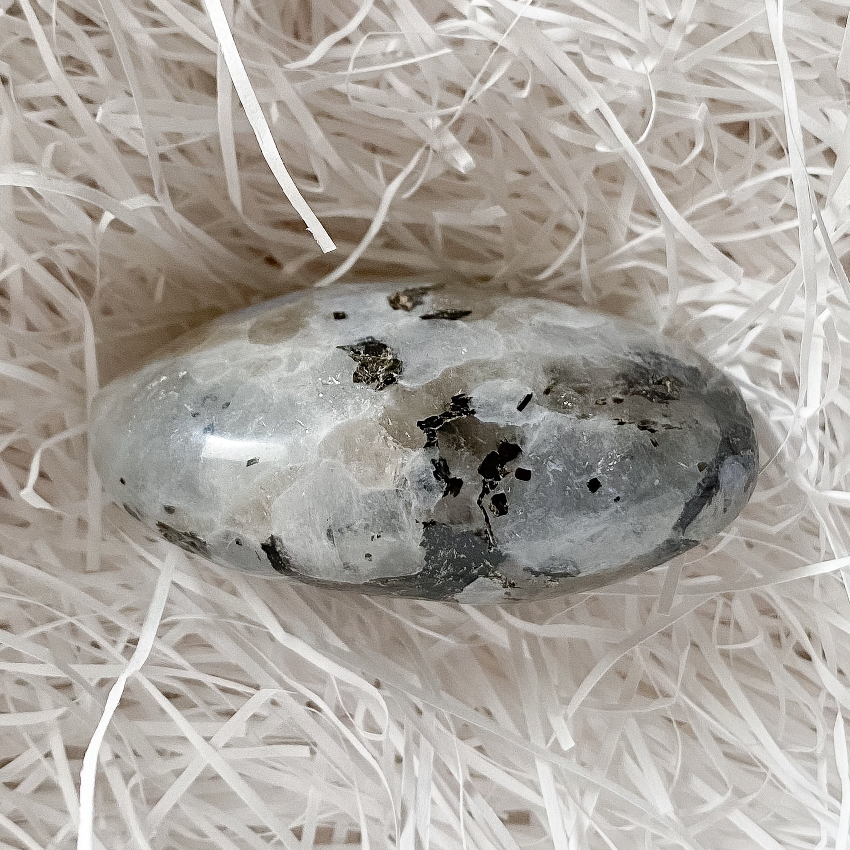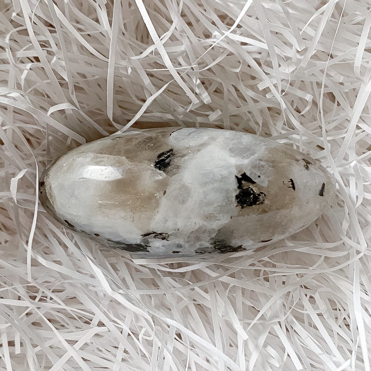 スリランカ産ホワイトラブラドライト(レインボームーンストーン)、スモーキークォーツ、ブラックトルマリンの複合鉱物のパームストーンです。