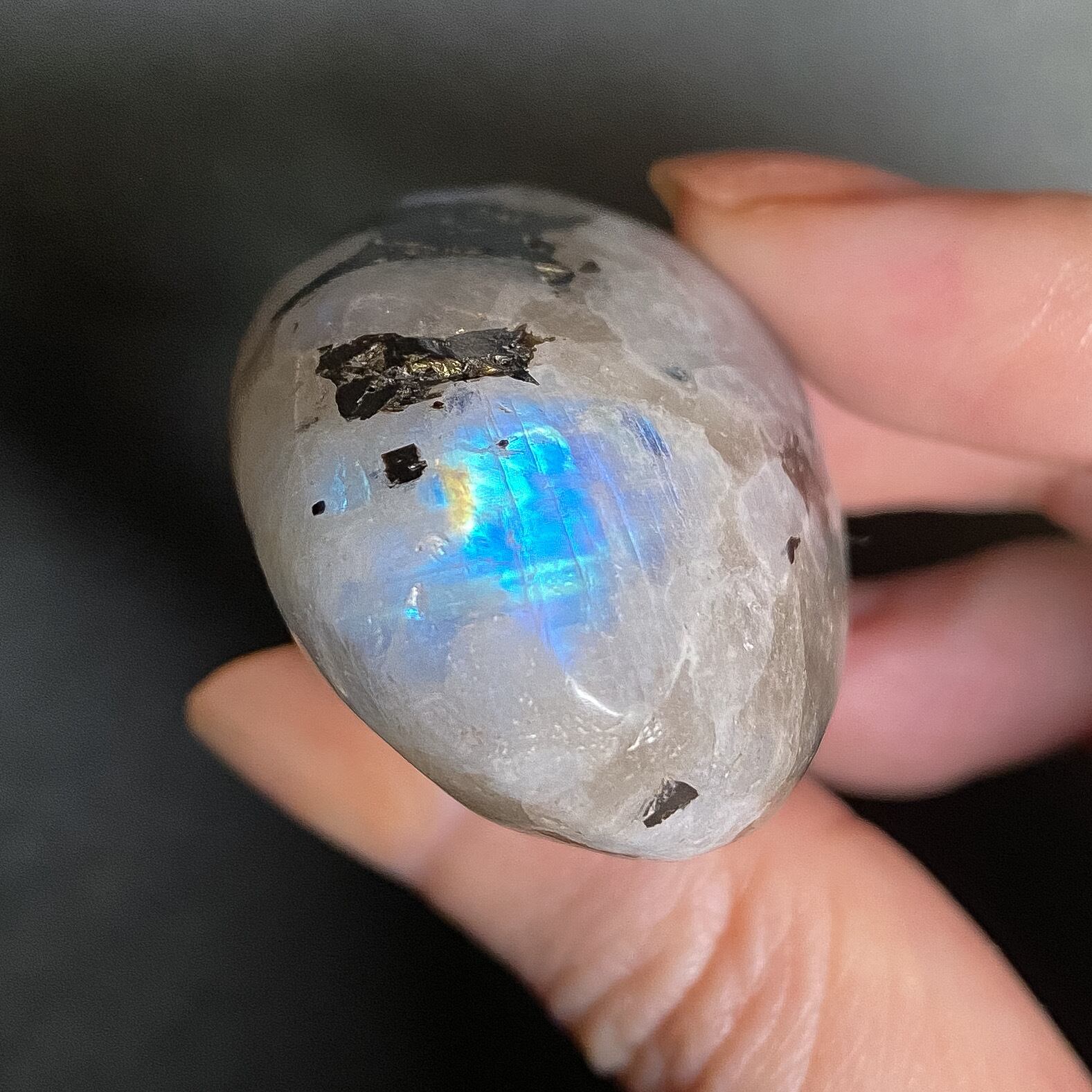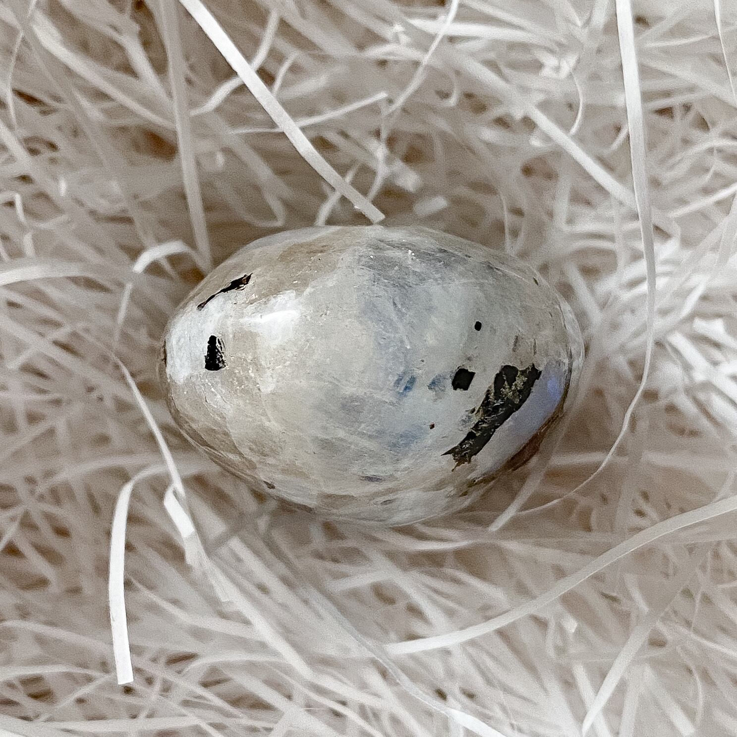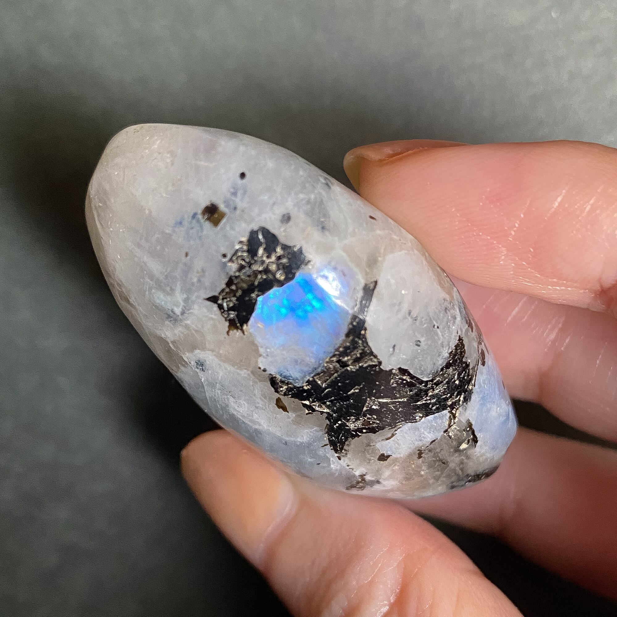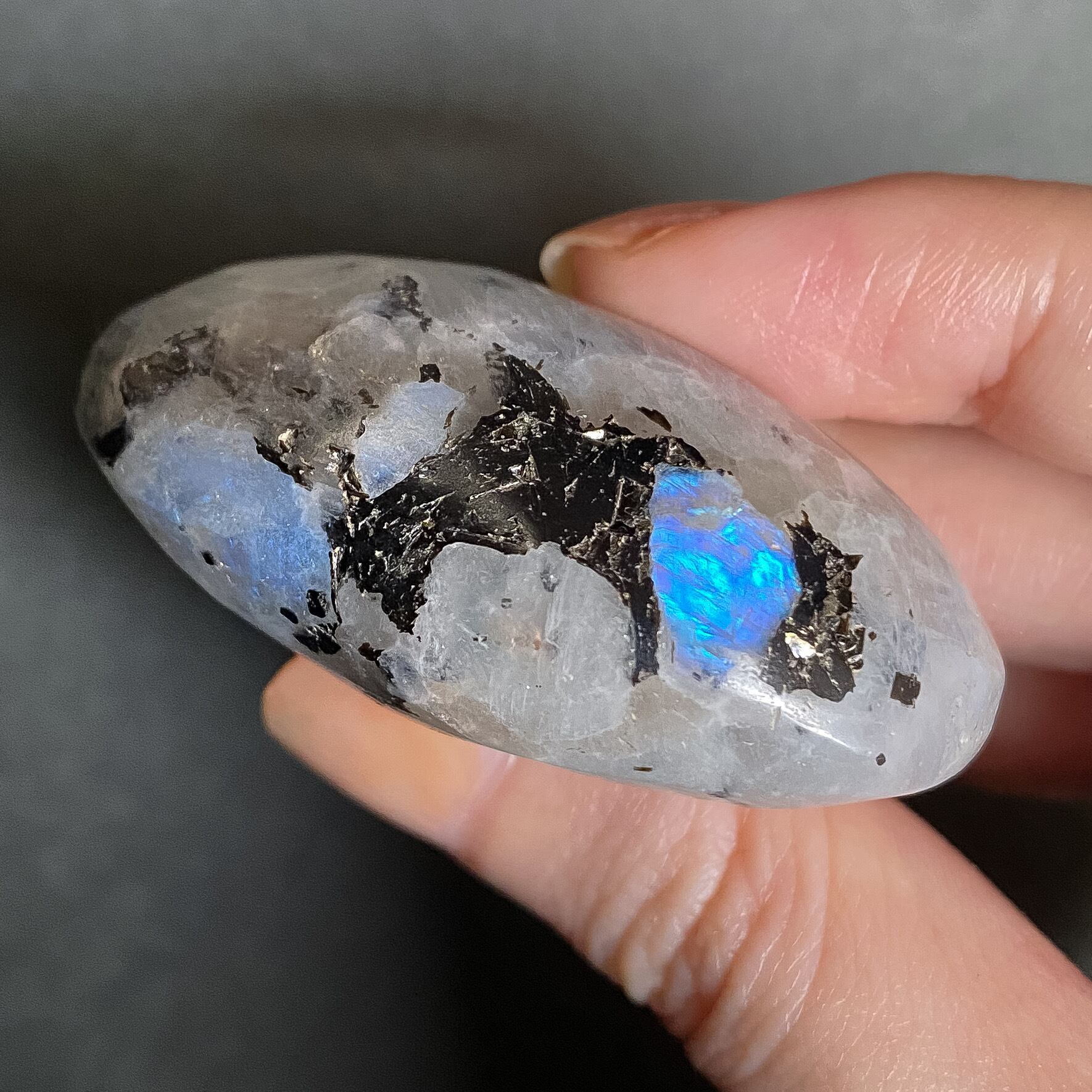 スリランカ産ホワイトラブラドライト(レインボームーンストーン)、スモーキークォーツ、ブラックトルマリンの複合鉱物のパームストーンです。