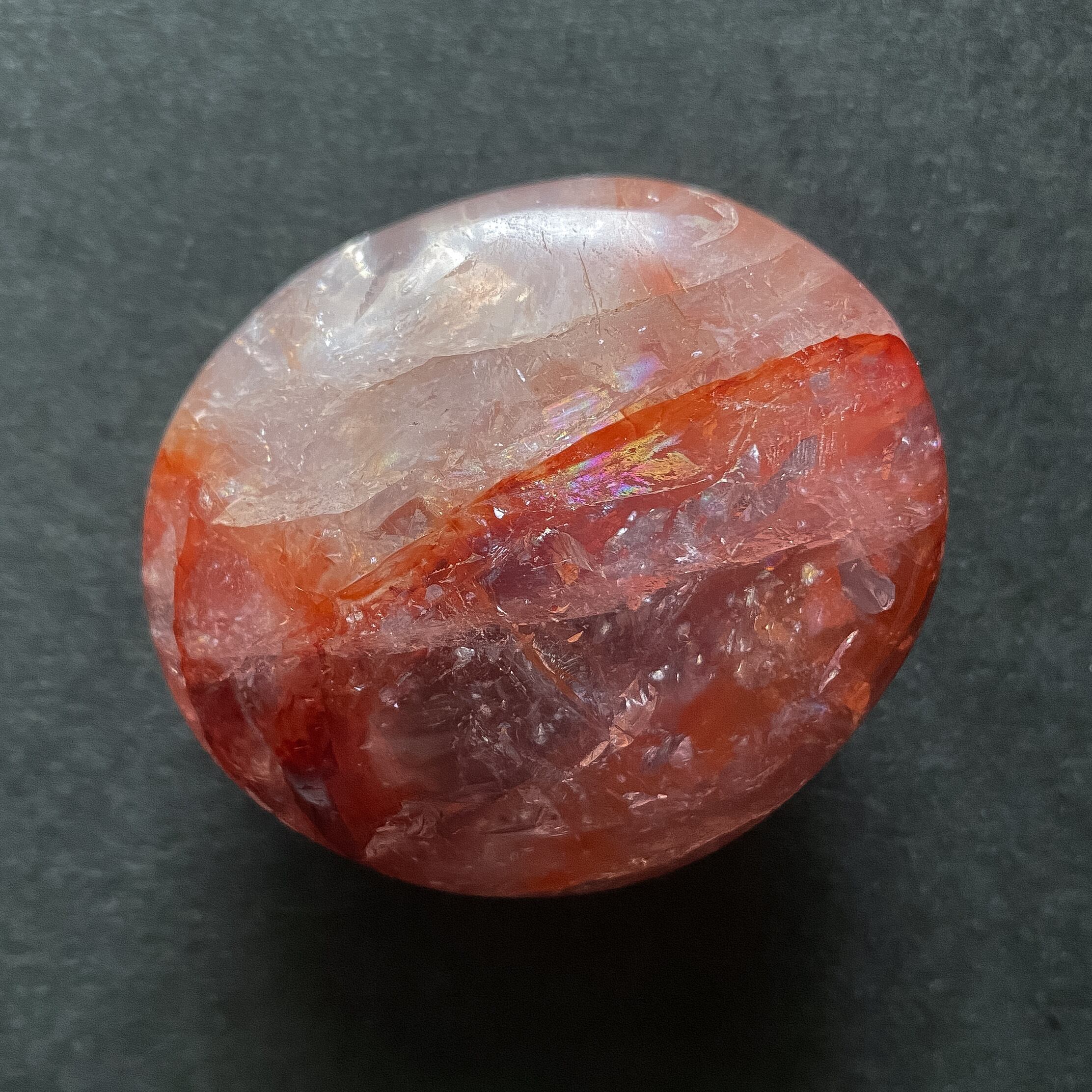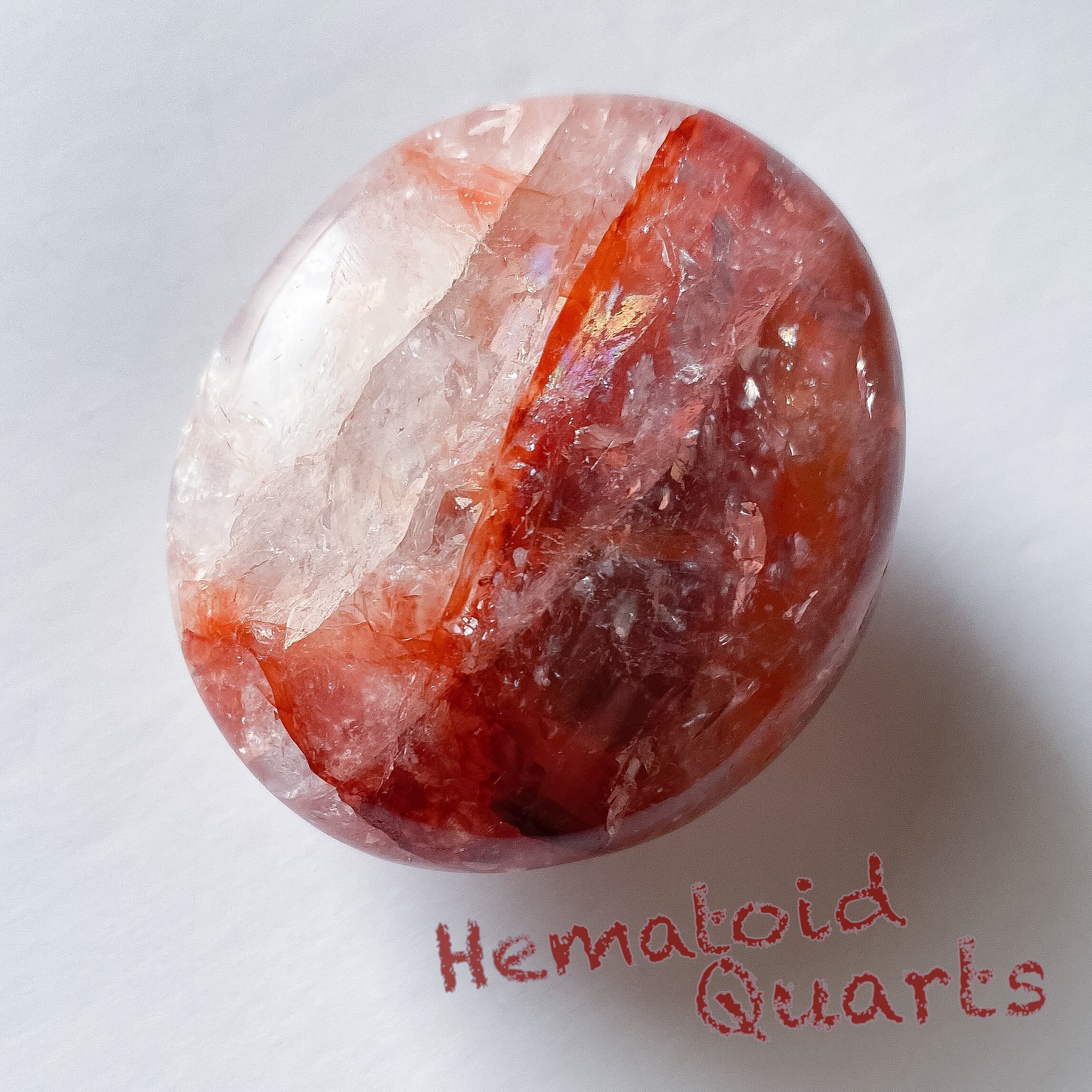ヘマタイトのエネルギッシュな赤色と虹の多彩さを楽しめるパームストーンだと思います。