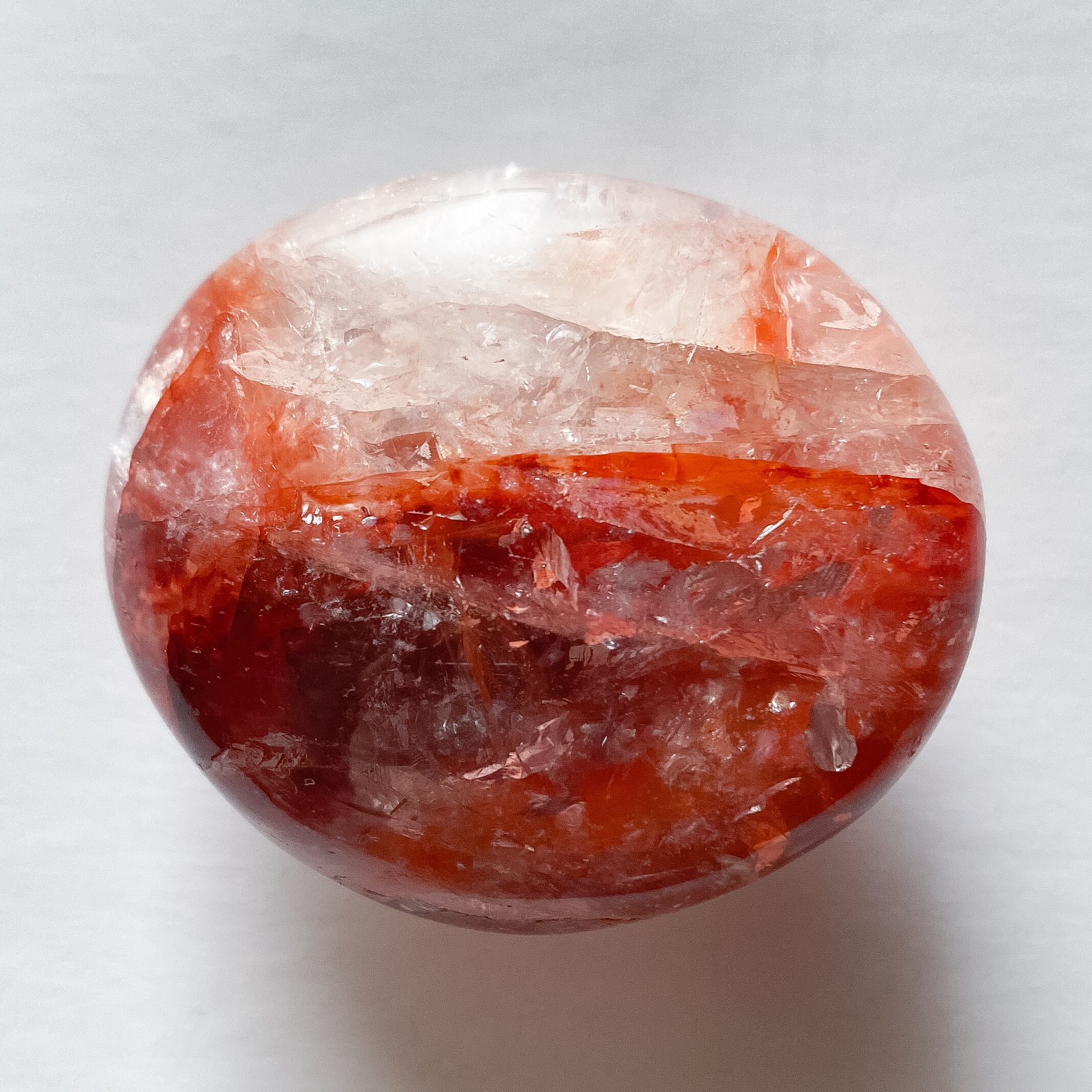濃い赤のヘマタイト部分と水晶の透明感ある部分が共存したパームストーンです。