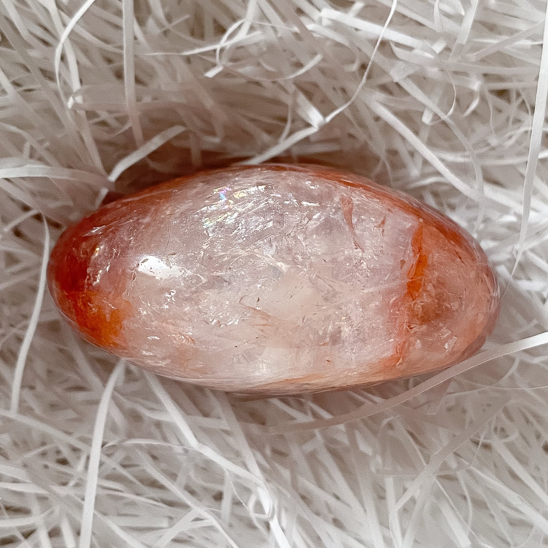 至る所に虹が見られ、水晶部分には透明感も見られます。虹の入り方が様々で、内部から見られる虹や手前でキラキラと輝く虹、また入る虹の色も多彩な印象です。