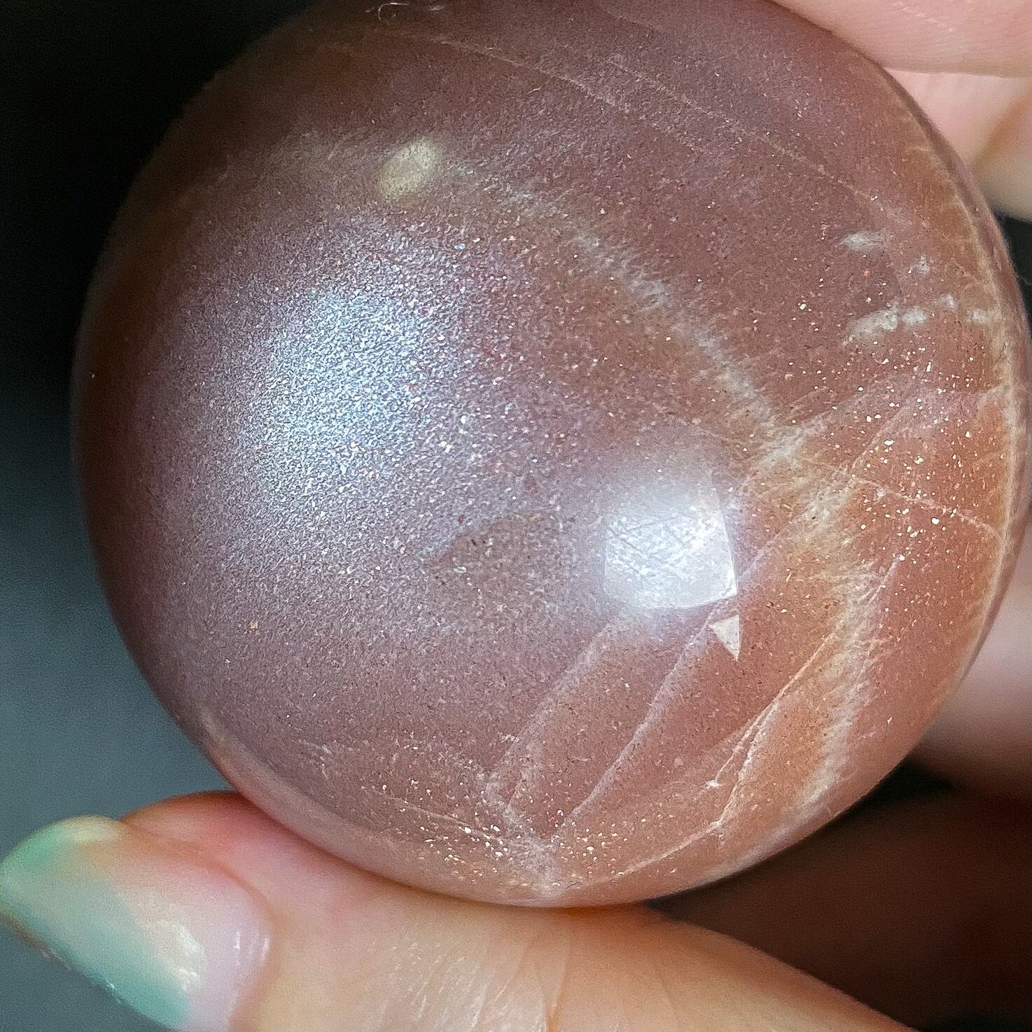 ムーンストーンが持つシラーと、サンストーンに内包されるレピドライトやマイカ等の内包物によるアベンチュレッセンスの両方を持つ珍しい石です。