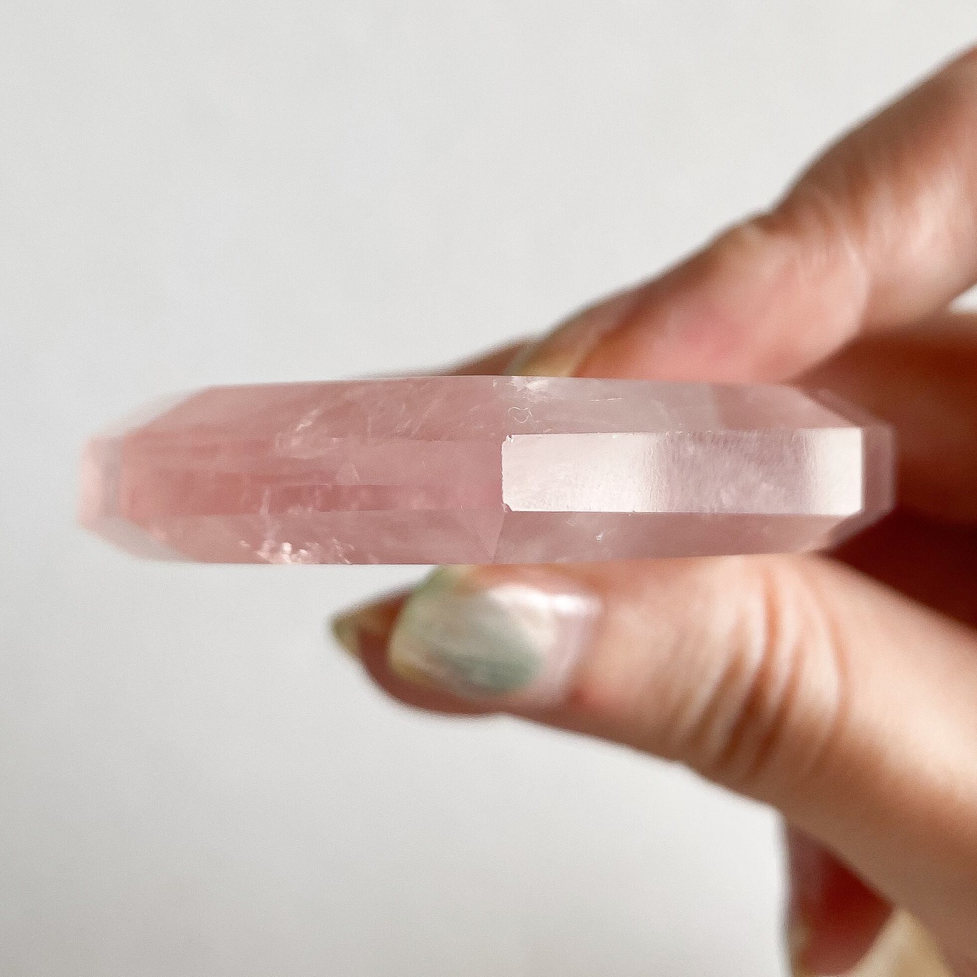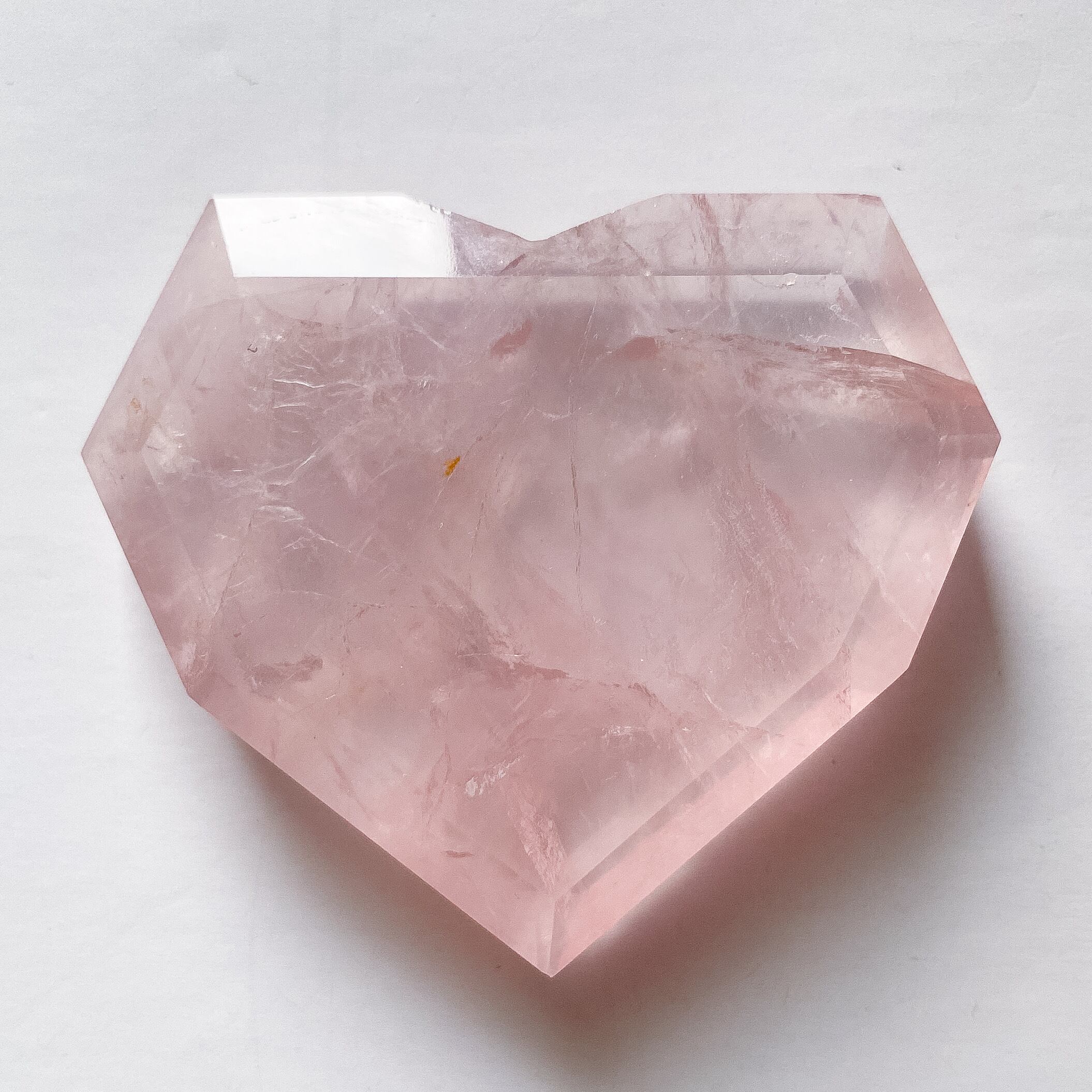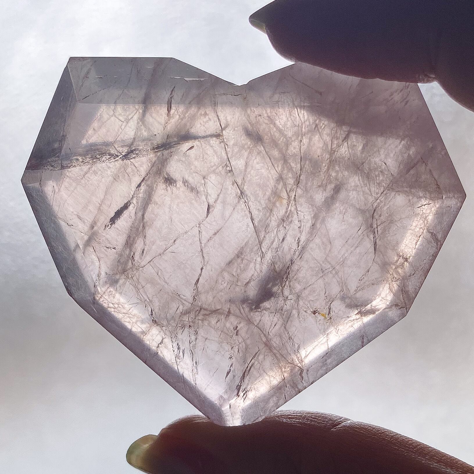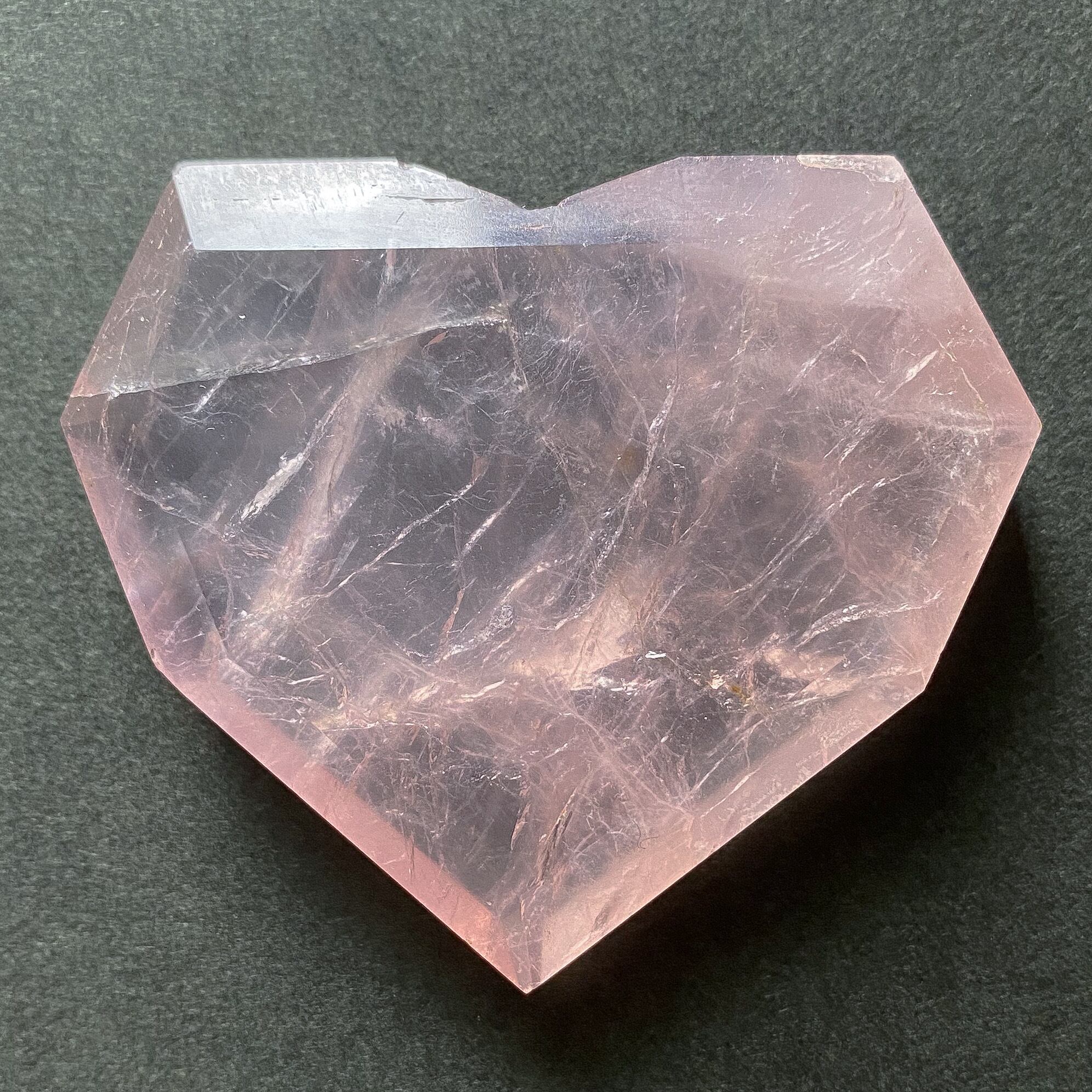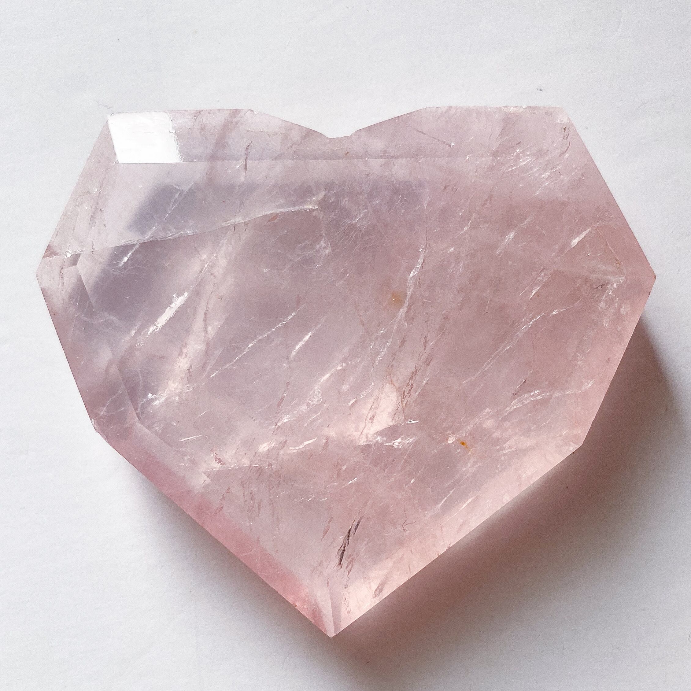 透明感がとても良く、透け感の中にピンク色が乗るハートシェイプです。ローズクォーツのキラキラした層を生かしてカットされており、光に当てると両面ともキラキラと輝くシルバーカラーの層を確認出来ます。