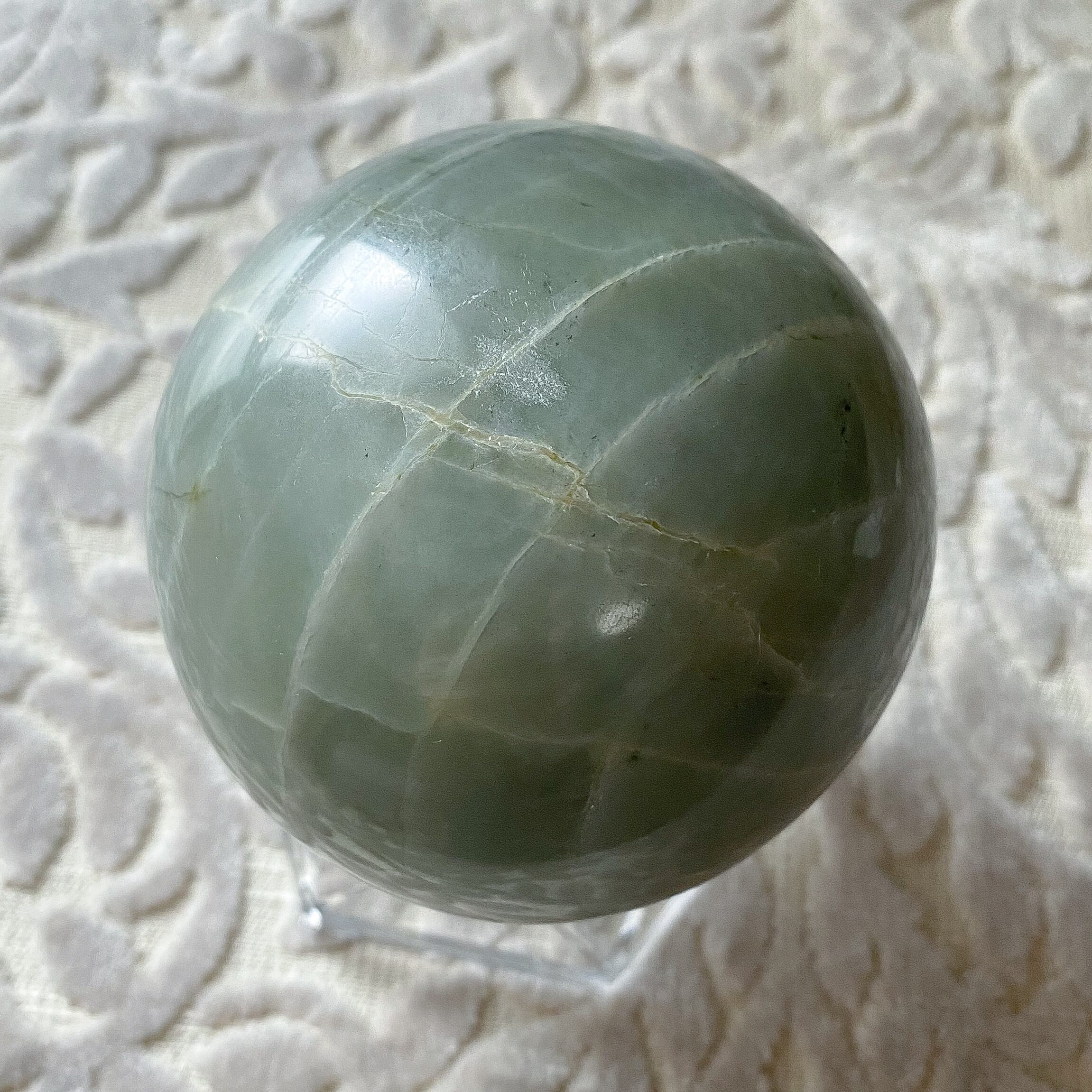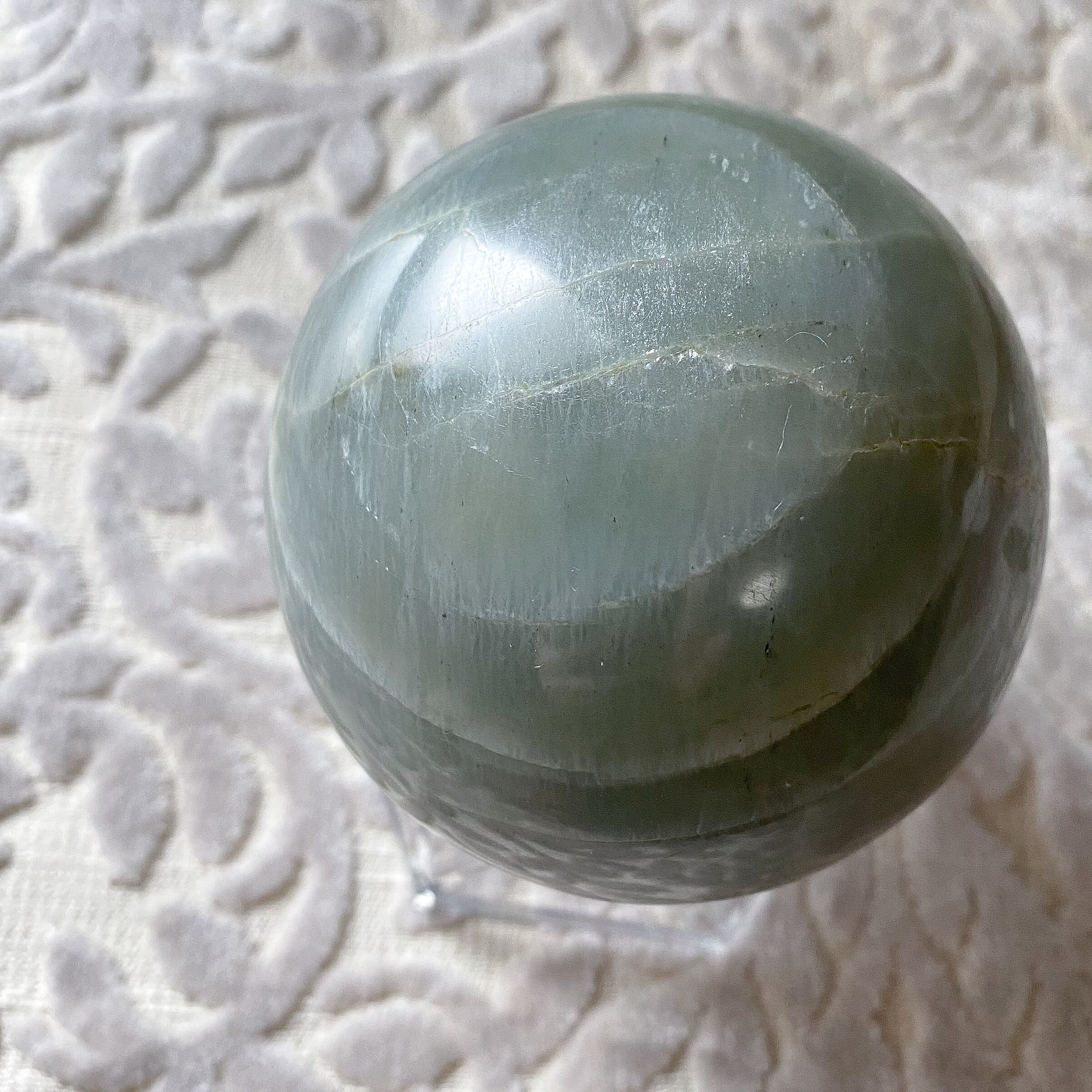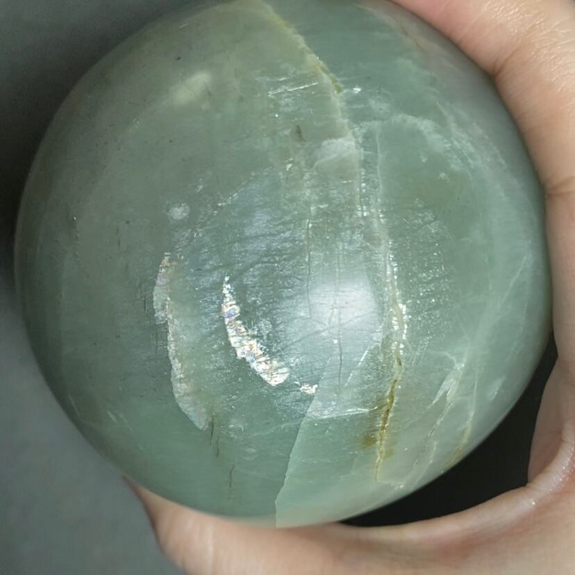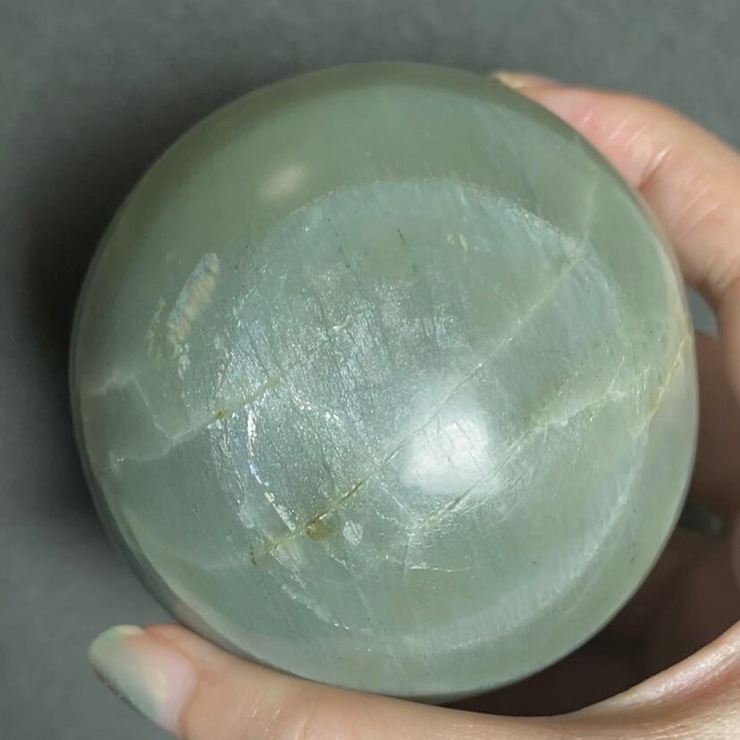 大きめのスフィアですので女性が片手に持つとかなりずっしりとした重みがあります。触れた感触は長石類によく見られる、冷たすぎず柔らかみを感じるようなしっとりとした質感です。