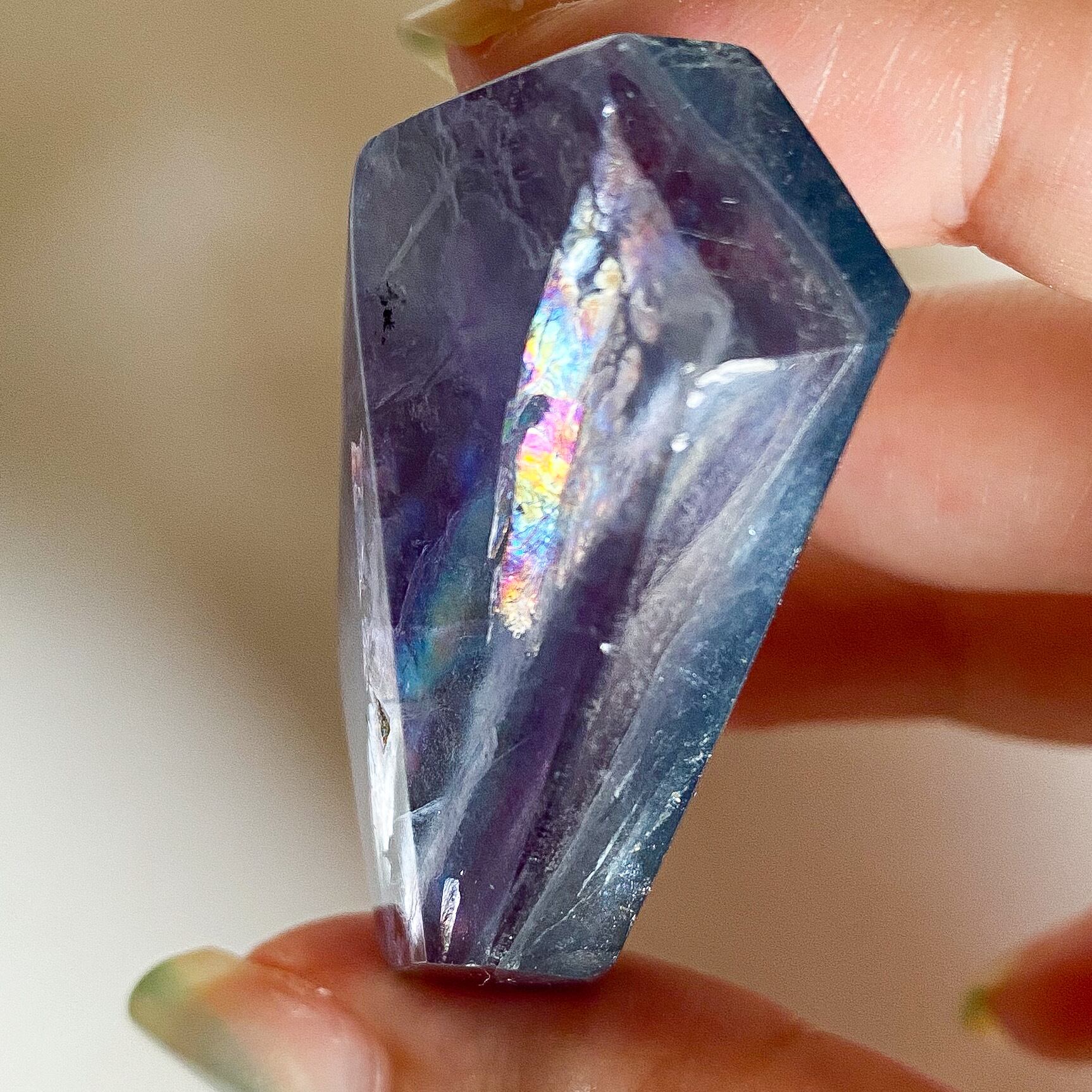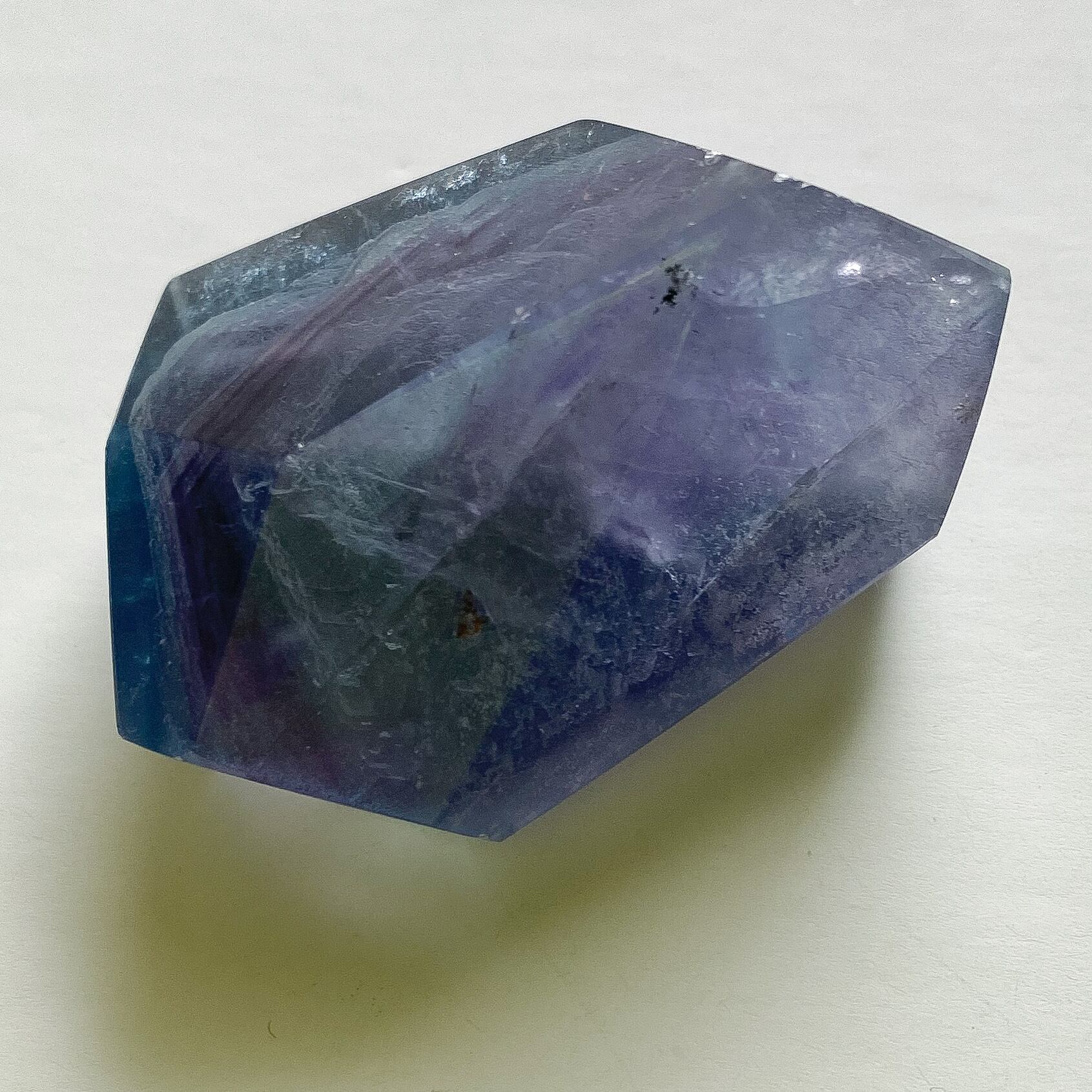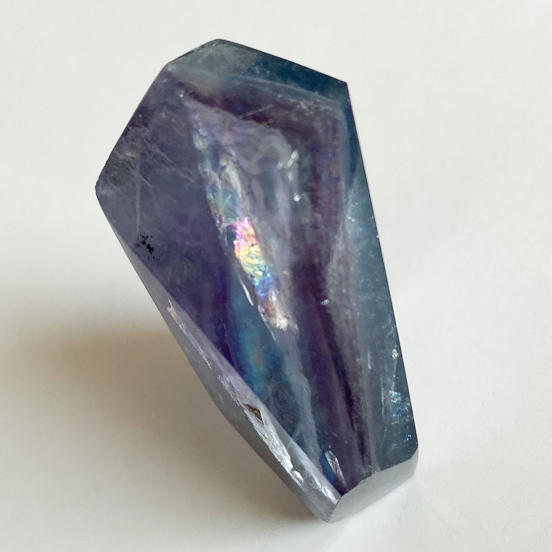 写真のように通常光ですと全体的に深く濃いカラーですが、光に透かすと淡く鮮やかさが増し、見え方にも変化が見られます。光の強さに関わらず数ヶ所、虹とキラキラとした輝きも確認出来、色味の他にも見所のあるブルーフローライトだと思います。