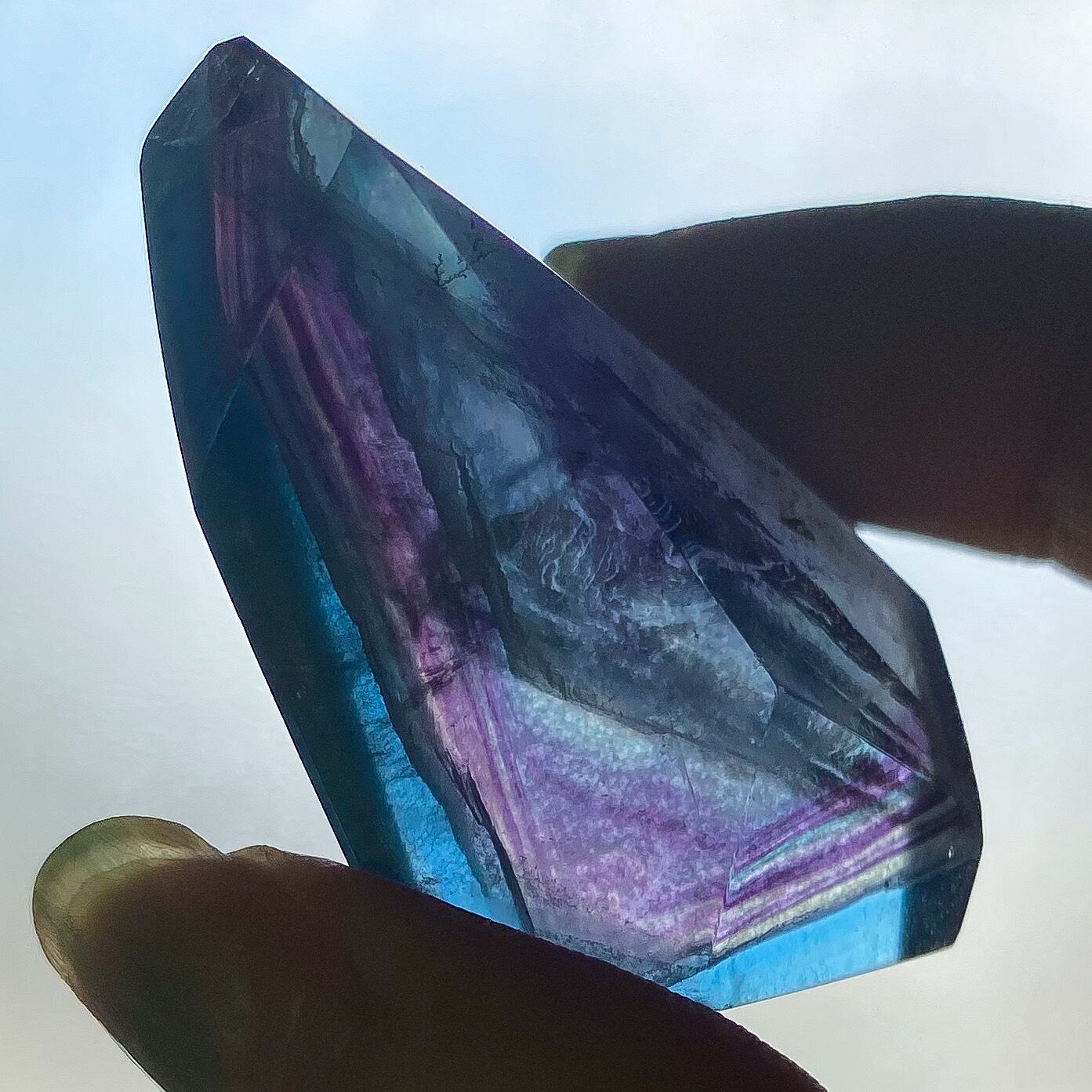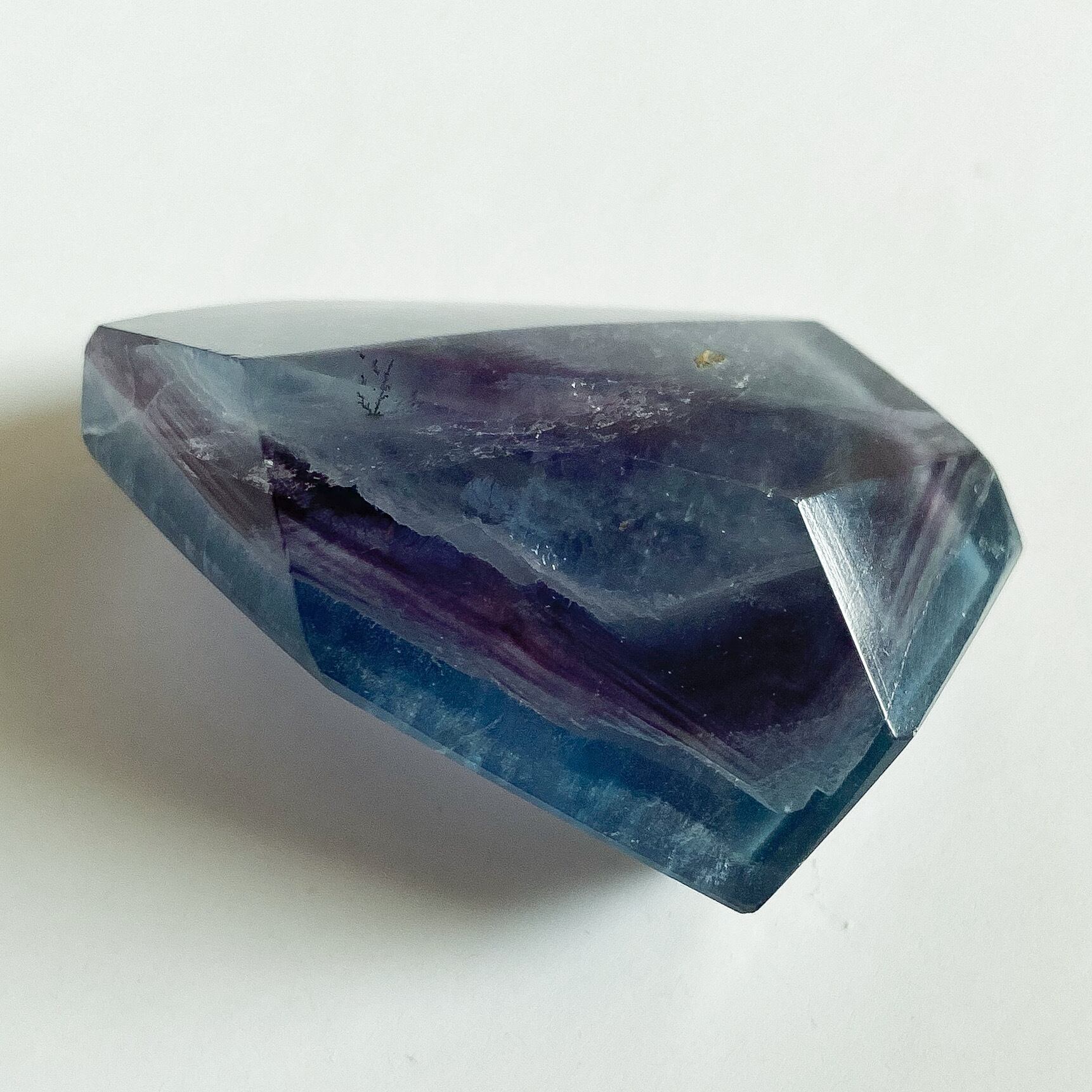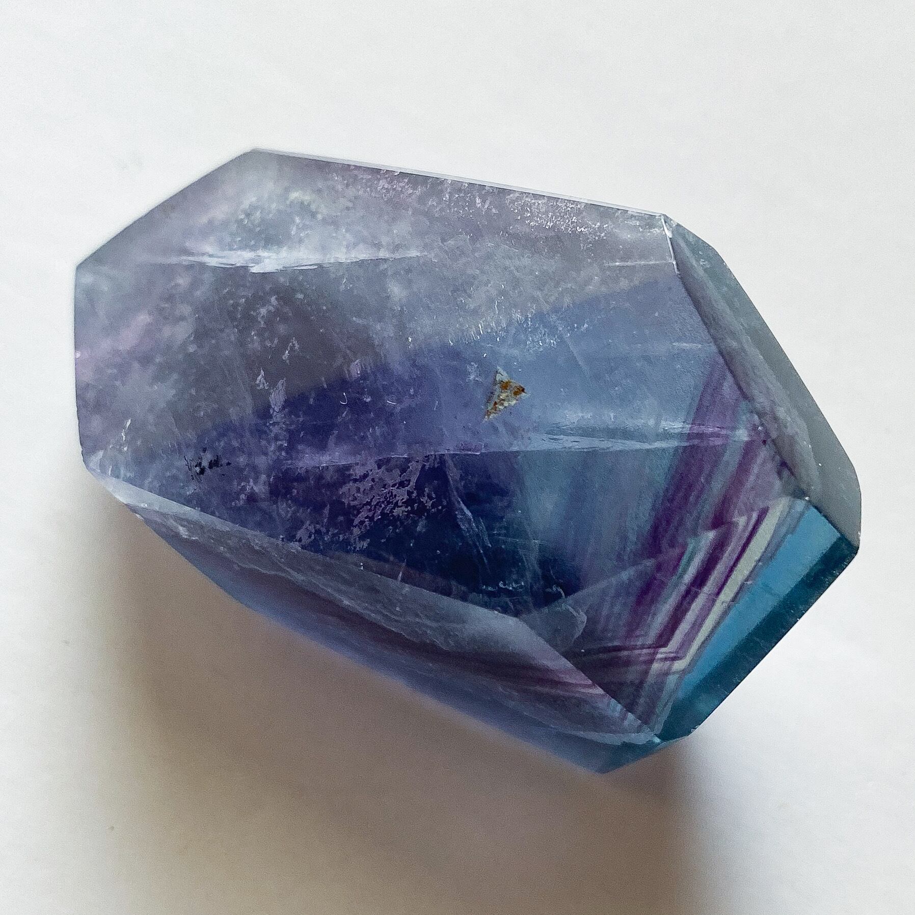 写真のように通常光ですと全体的に深く濃いカラーですが、光に透かすと淡く鮮やかさが増し、見え方にも変化が見られます。光の強さに関わらず数ヶ所、虹とキラキラとした輝きも確認出来、色味の他にも見所のあるブルーフローライトだと思います。