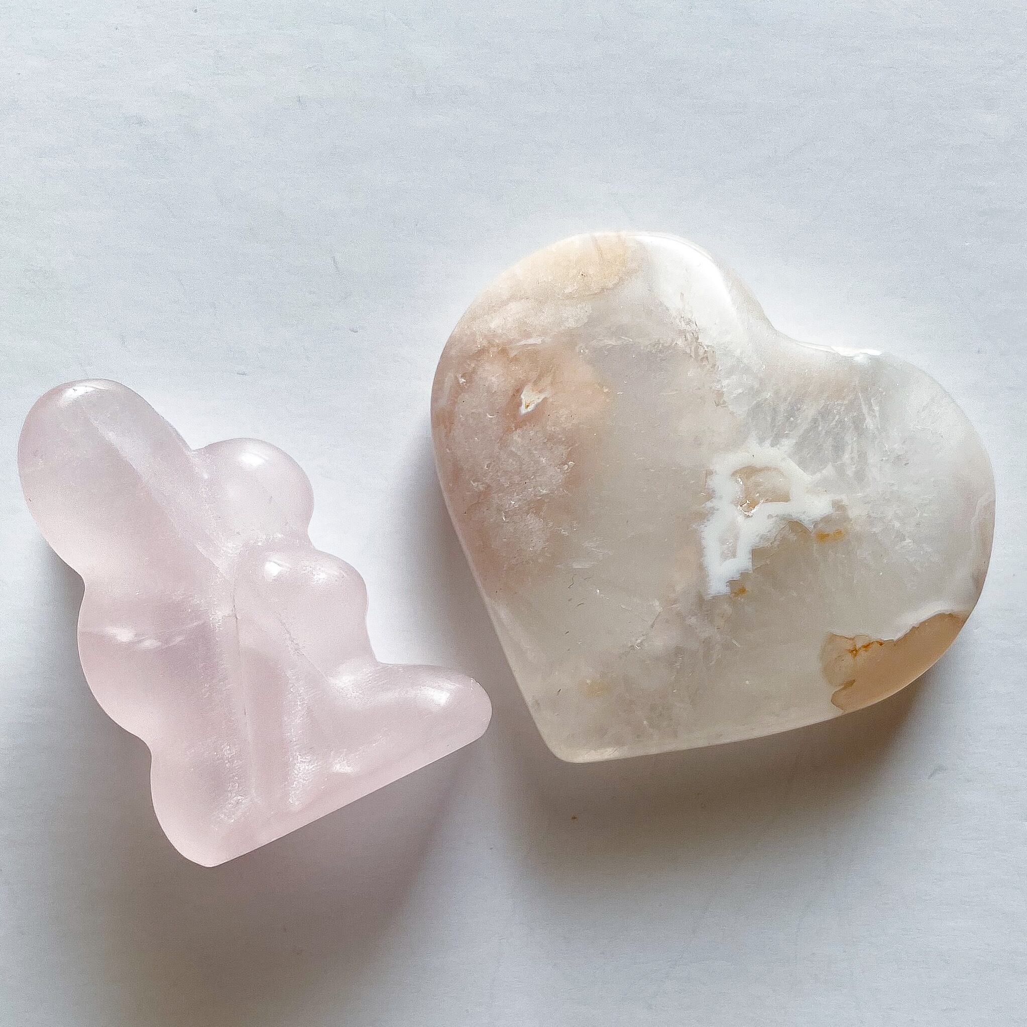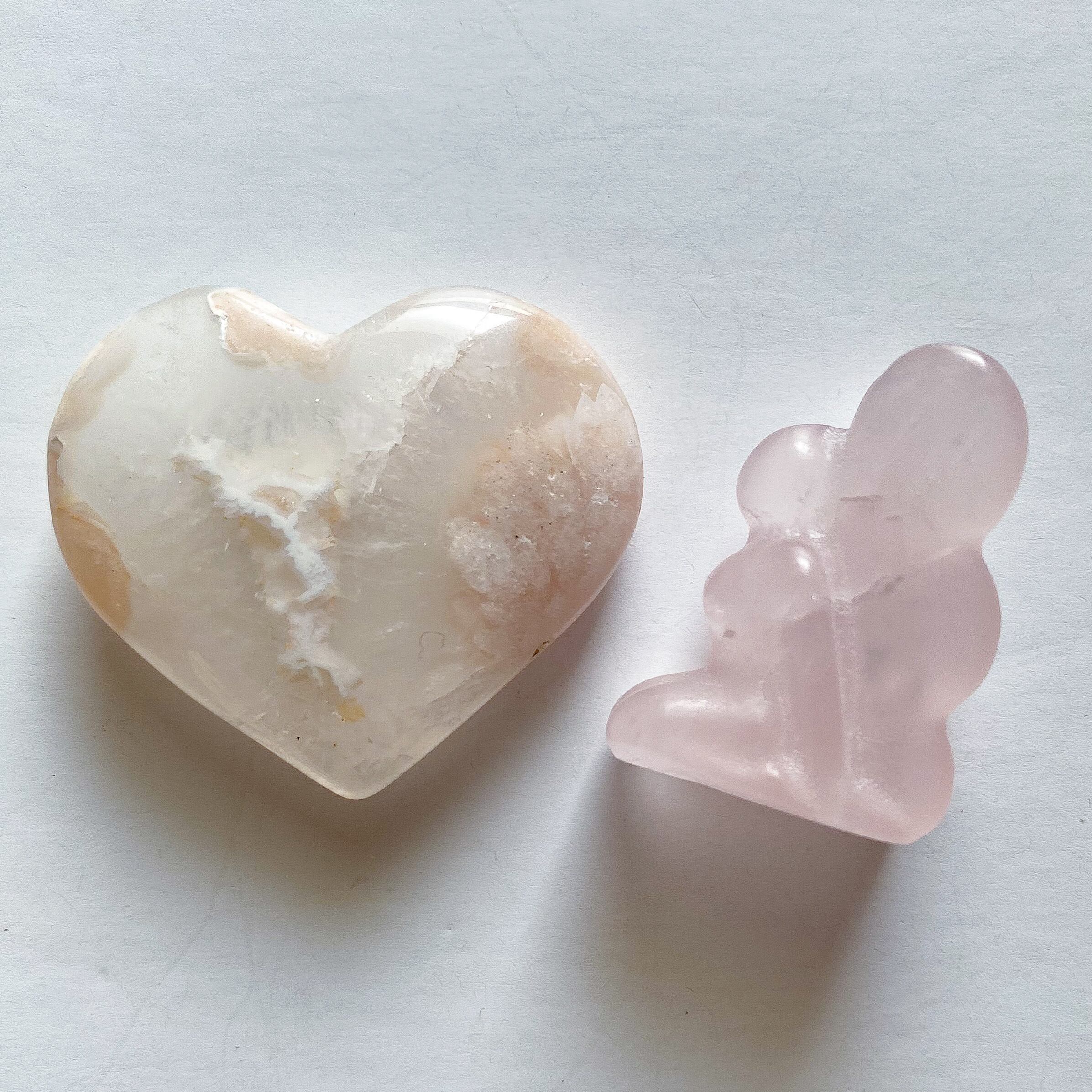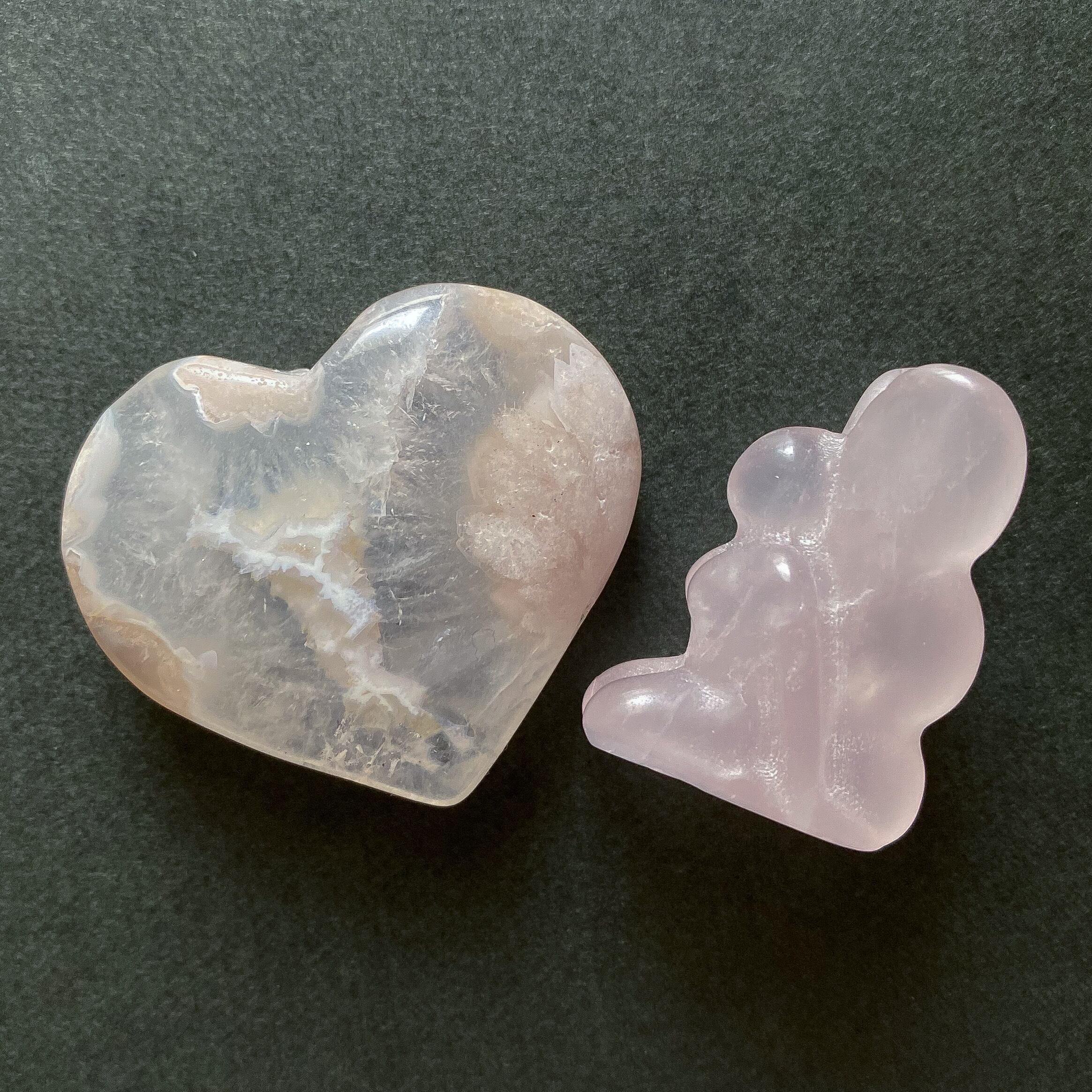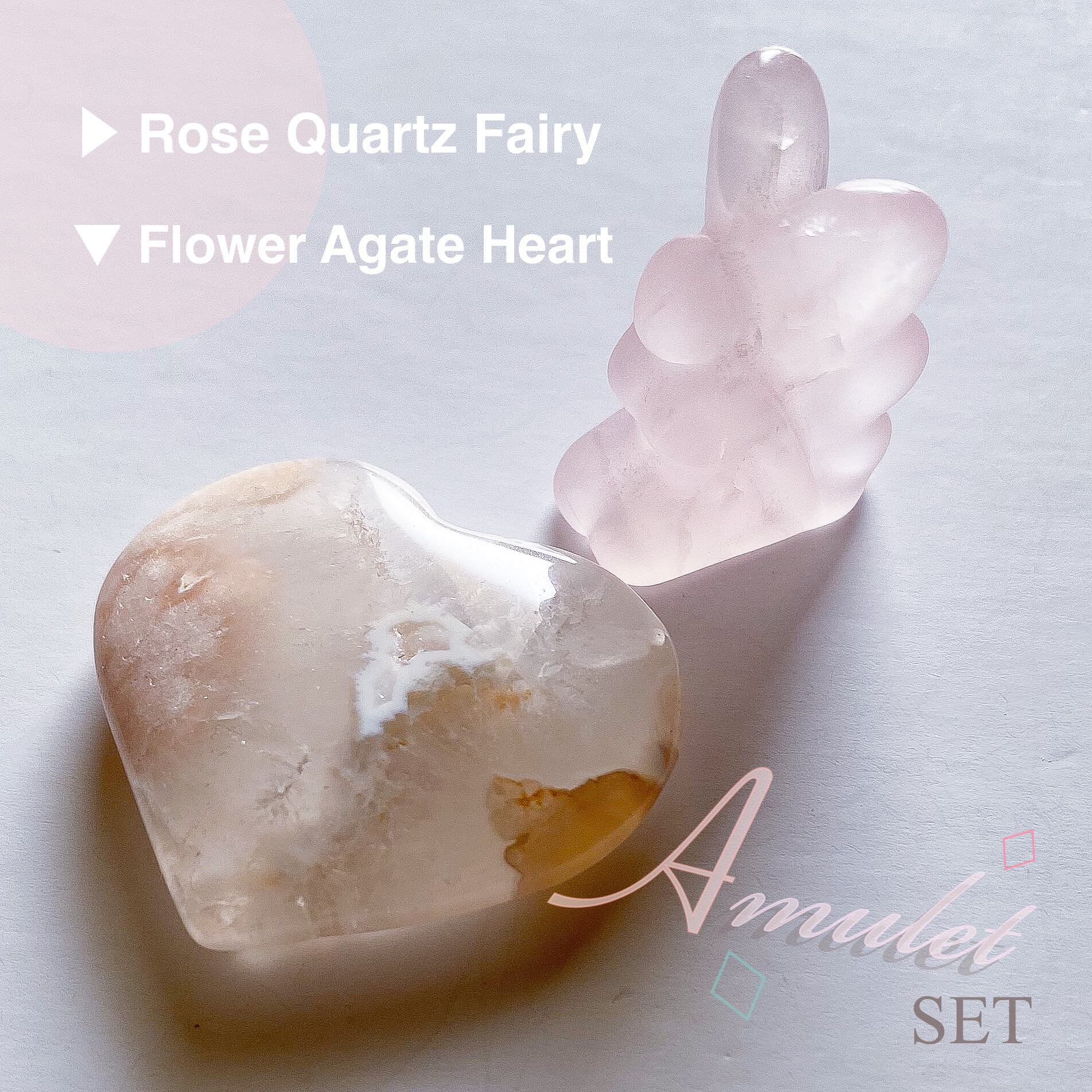 ローズクォーツの妖精とフラワーアゲートのハートシェイプの守り石セットです。