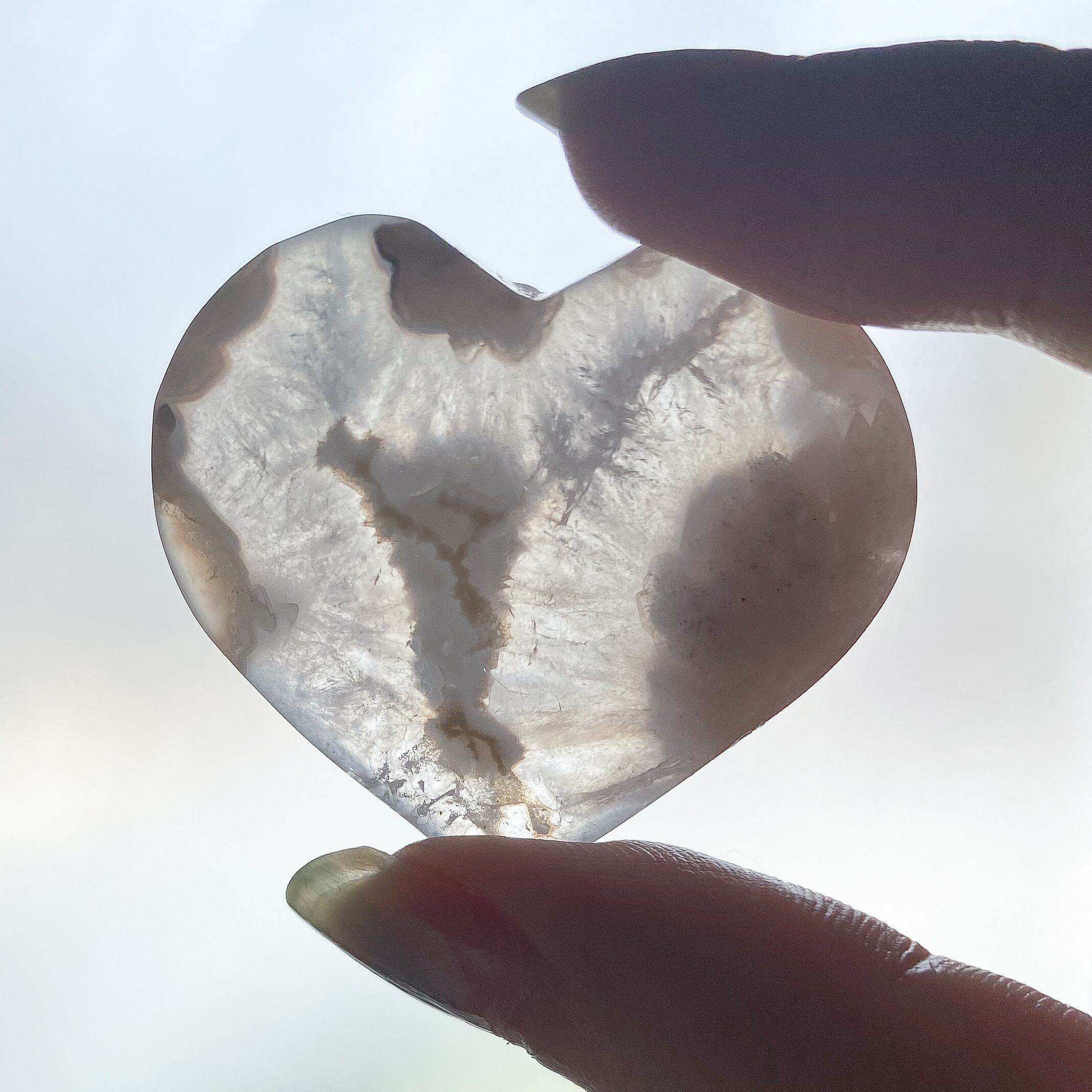 フラワーアゲートはクォーツ結晶がメインでベージュカラーの花が咲いています。透明感があり薄型のハートシェイプです。