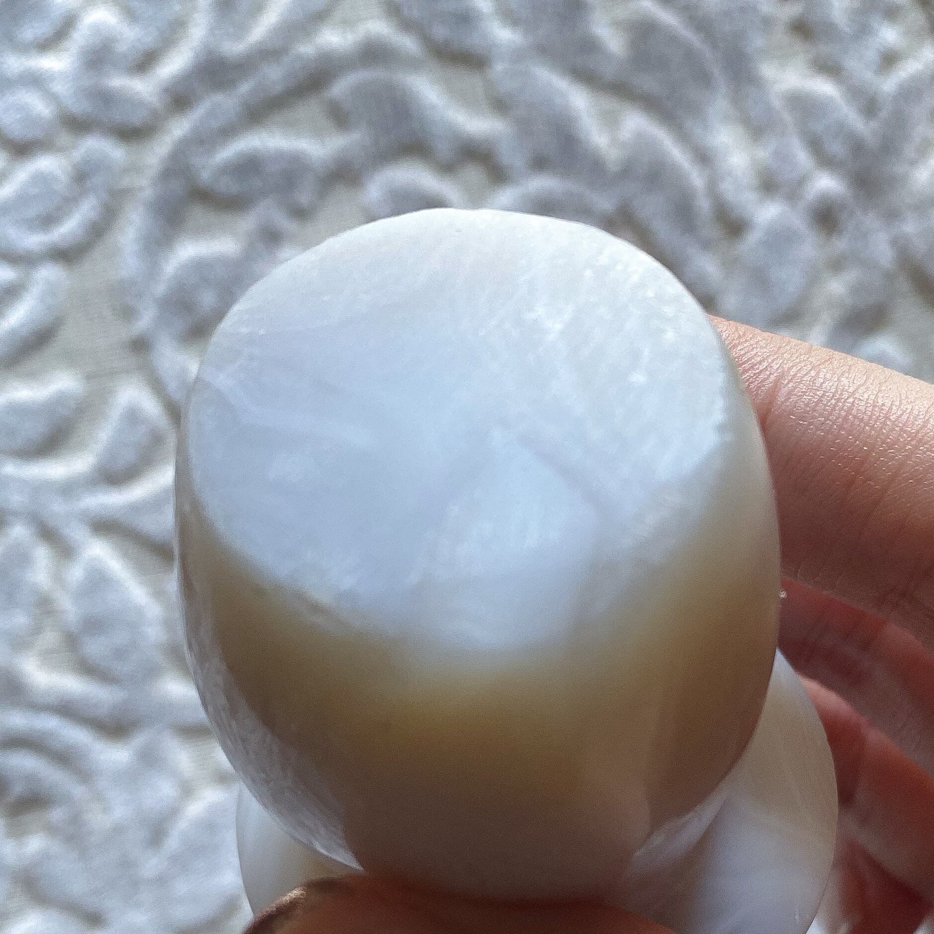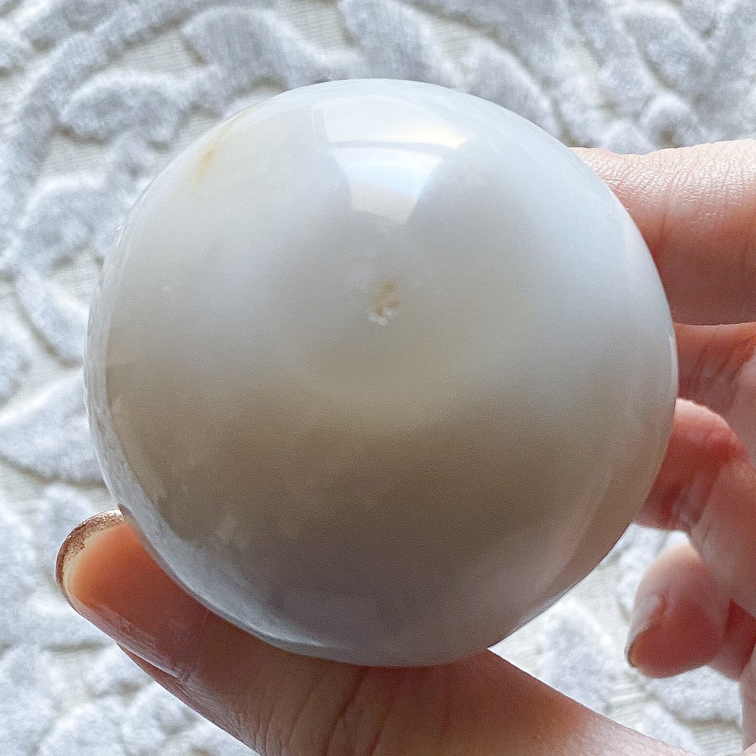 遠目に見ると白一色に見えますが、近くで見ると瑪瑙の縞模様が淡く見えています。