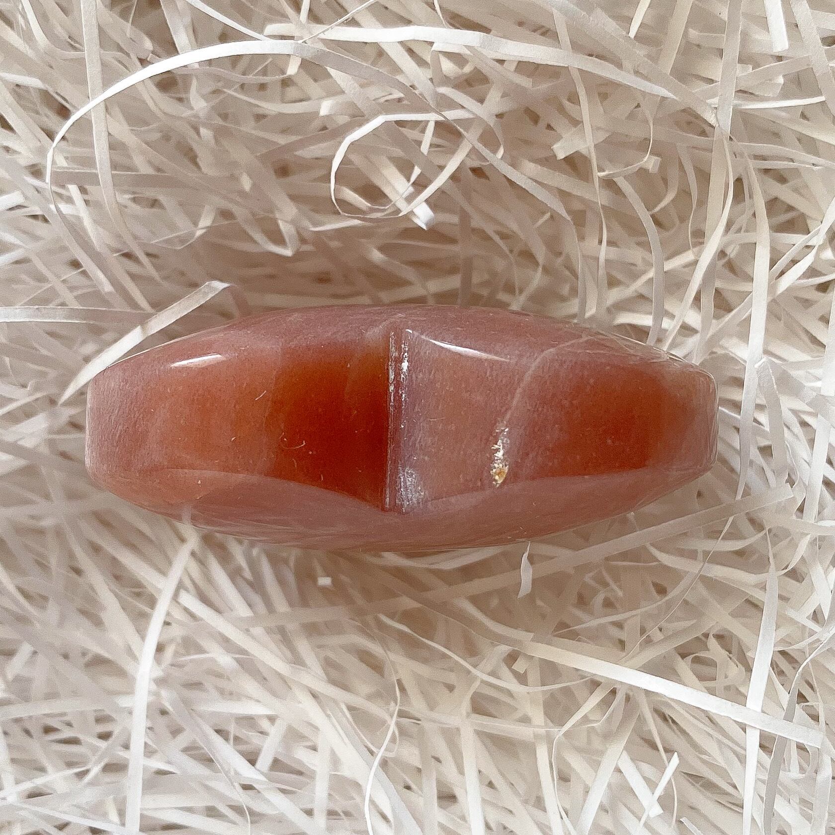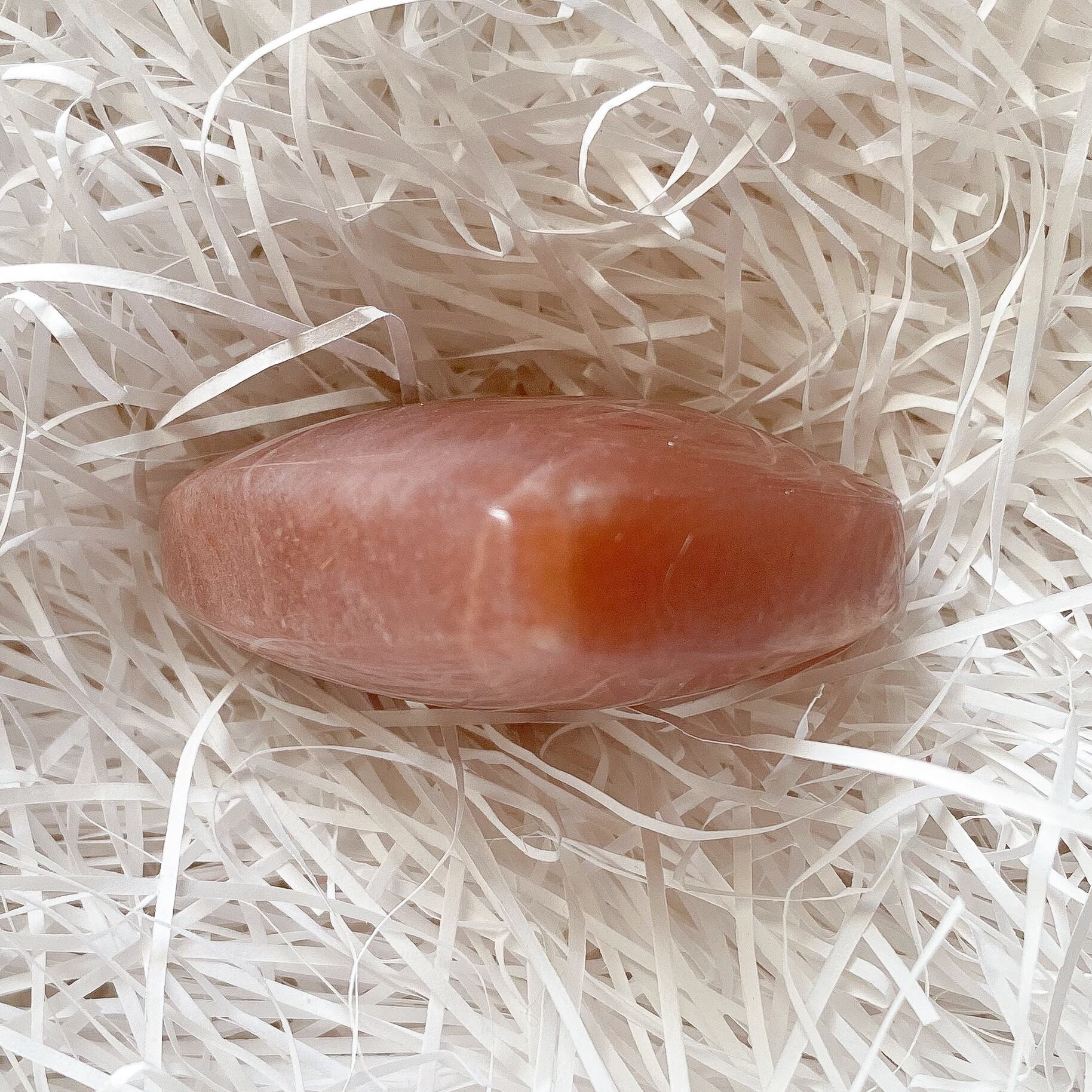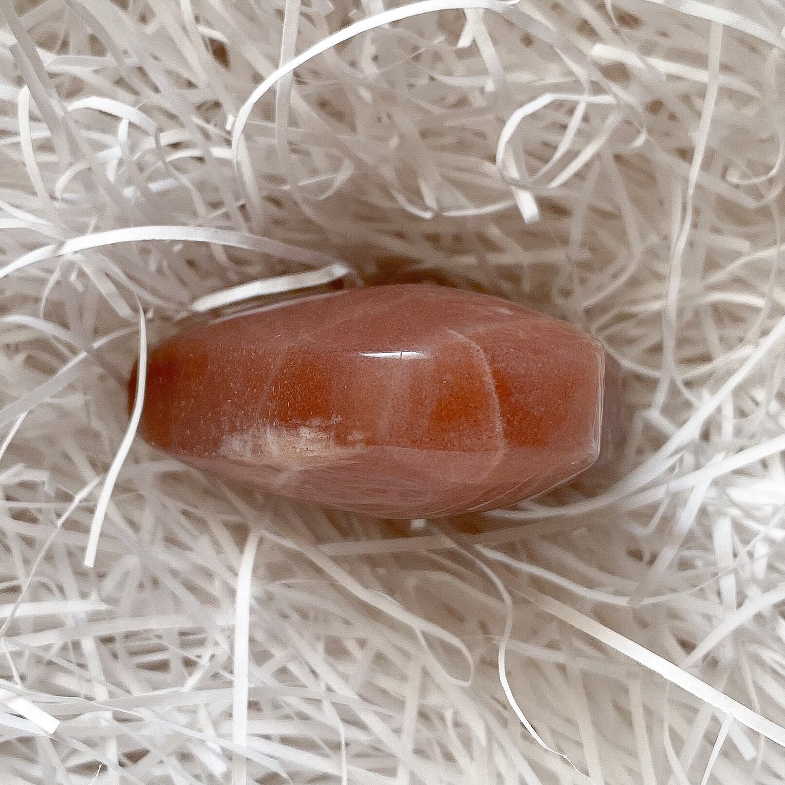 地色は落ち着いた色合いのオレンジカラーで、サンムーンストーンの中でもサンストーンの特徴が強いタイプの個体となります。