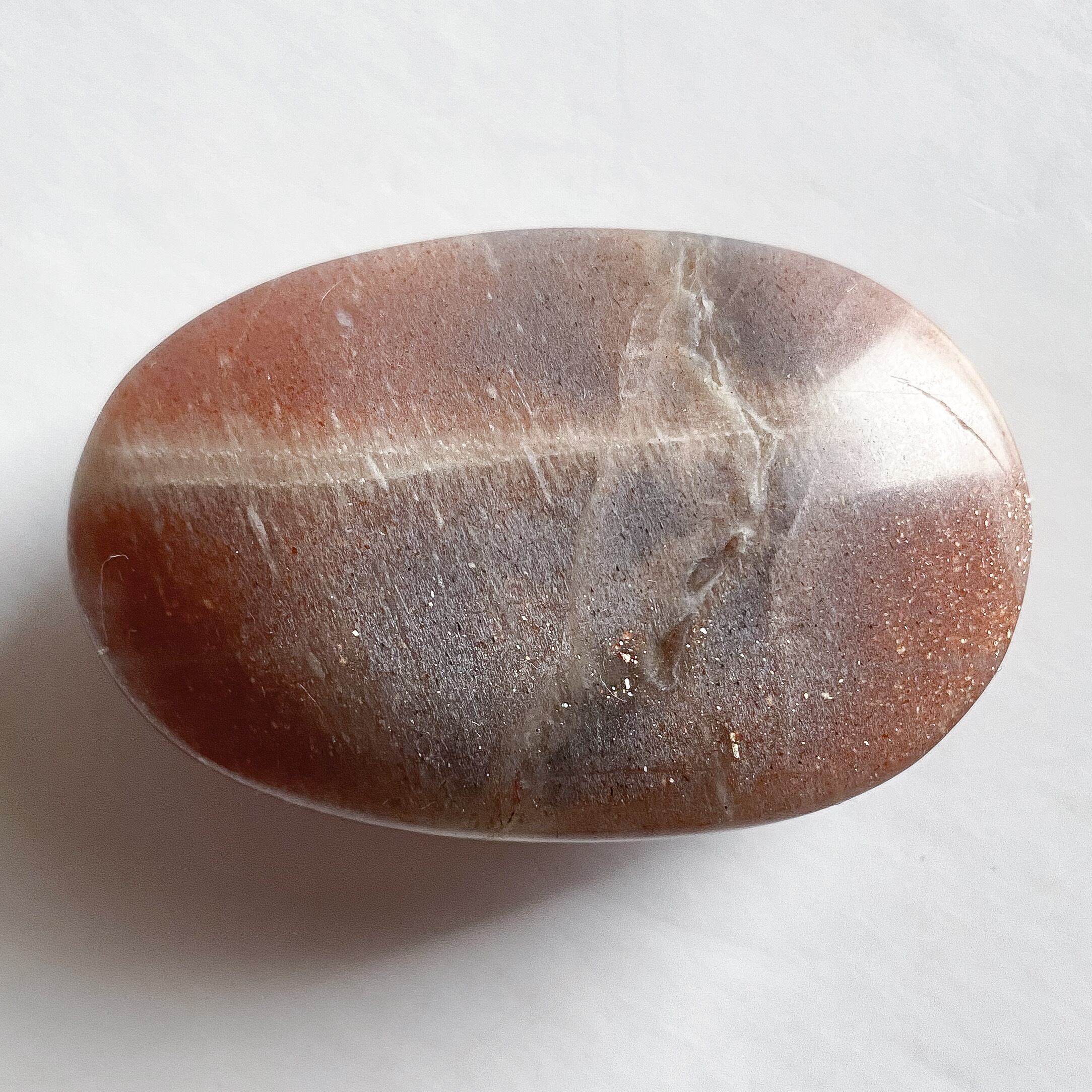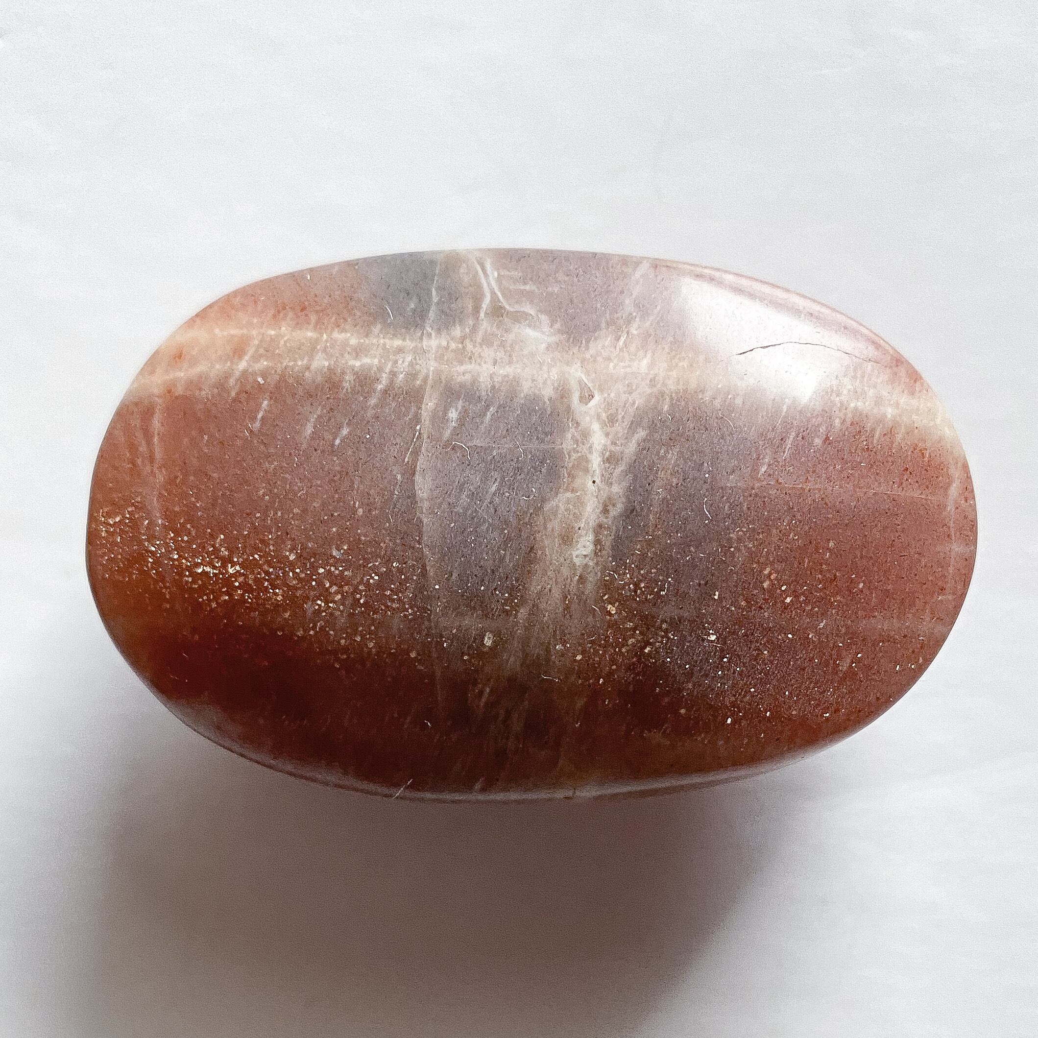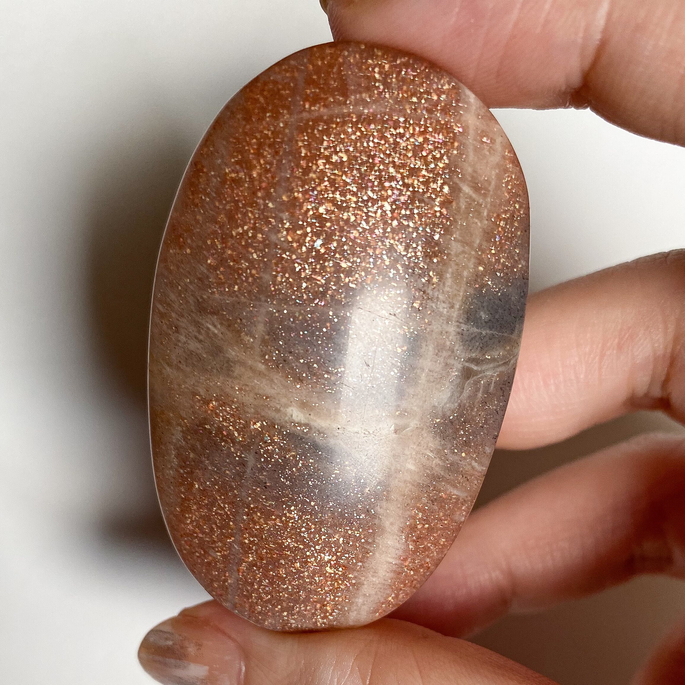 こちらはサンストーンとグレームーンストーンの中間タイプの個体で、中央部分には帯状にグレームーンストーンのカラーの特徴も見られます。