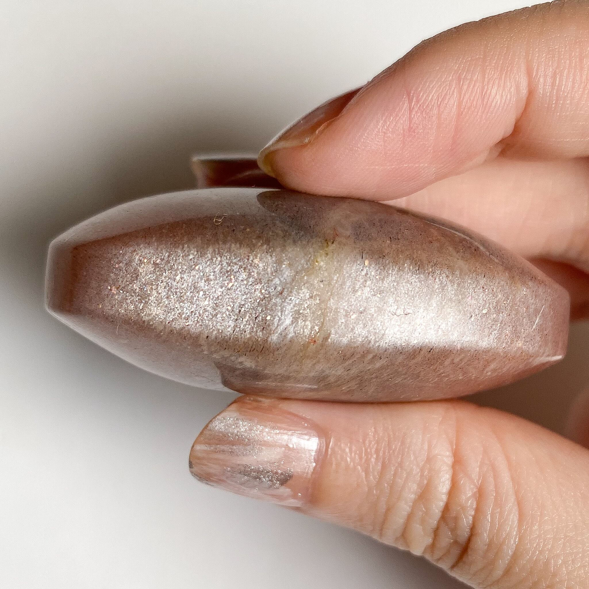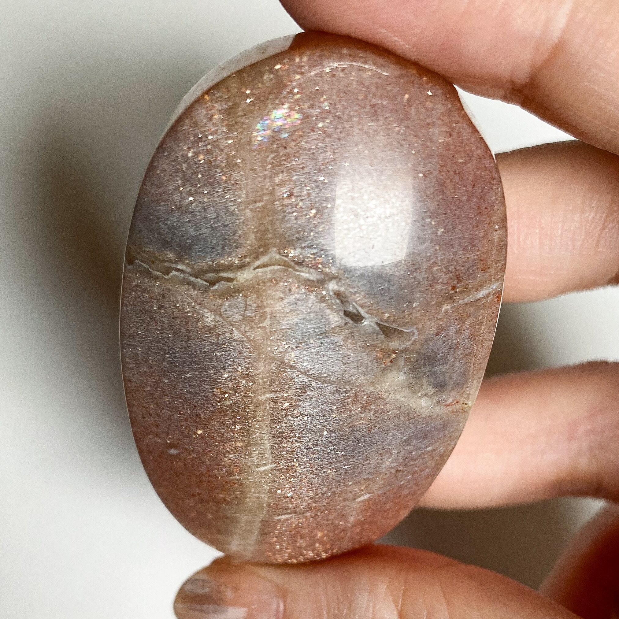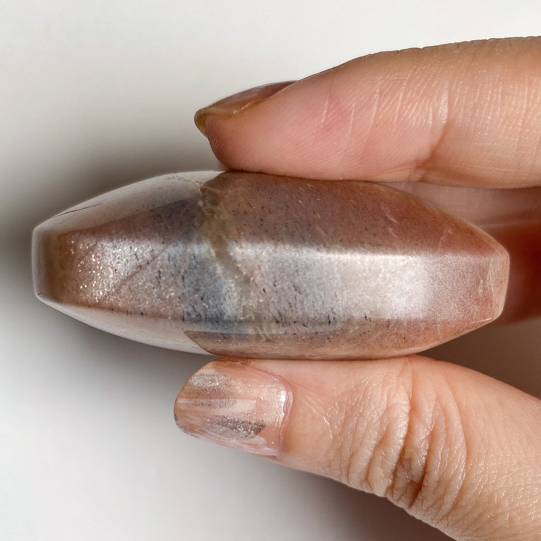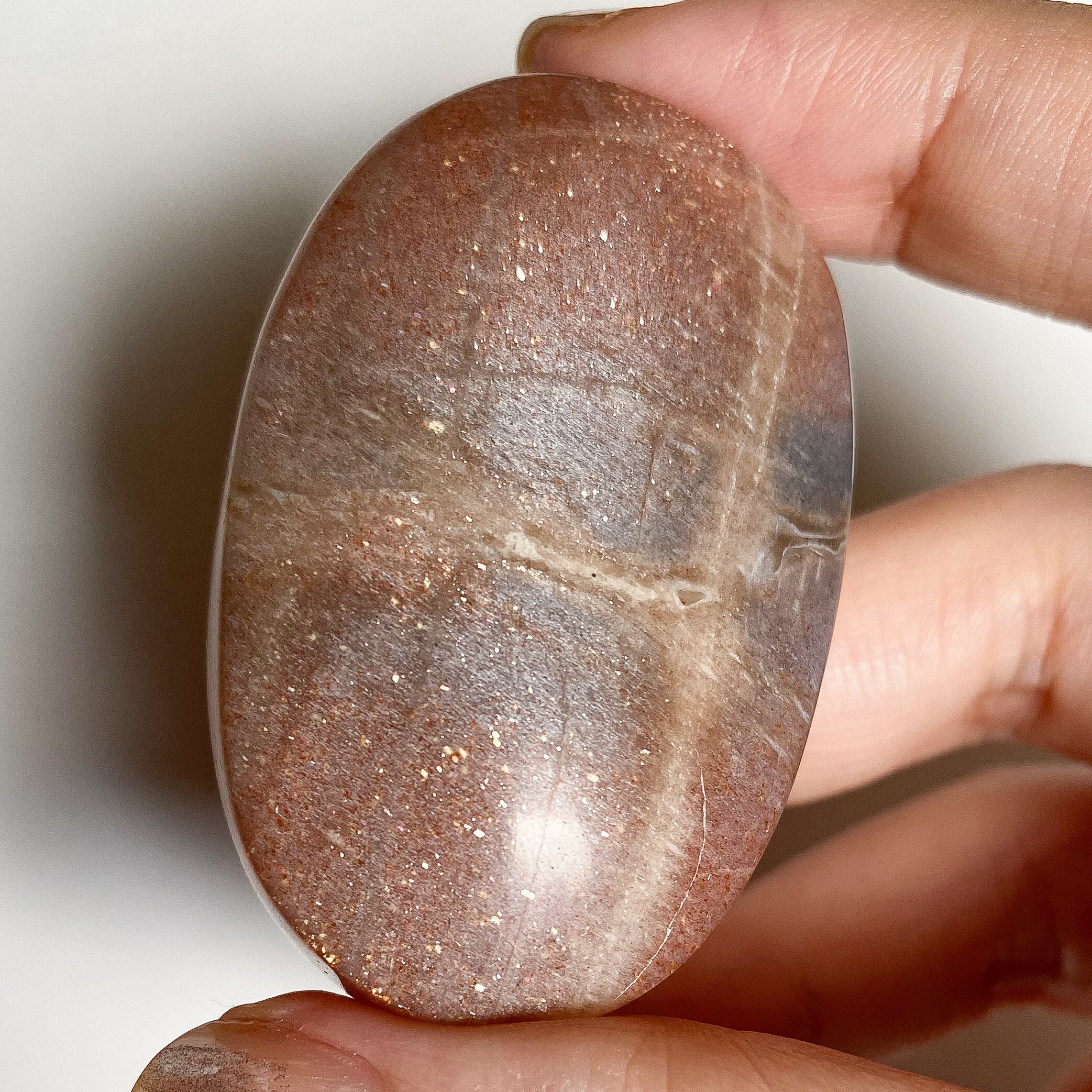 こちらはサンストーンとグレームーンストーンの中間タイプの個体で、中央部分には帯状にグレームーンストーンのカラーの特徴も見られます。