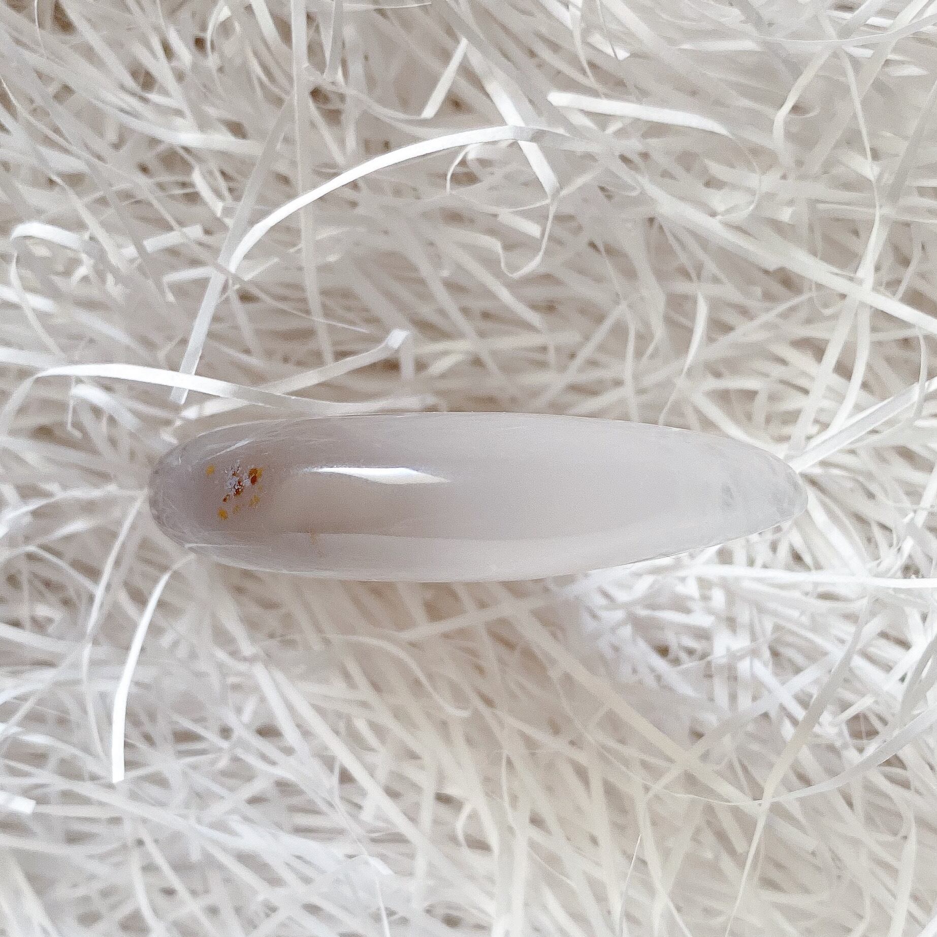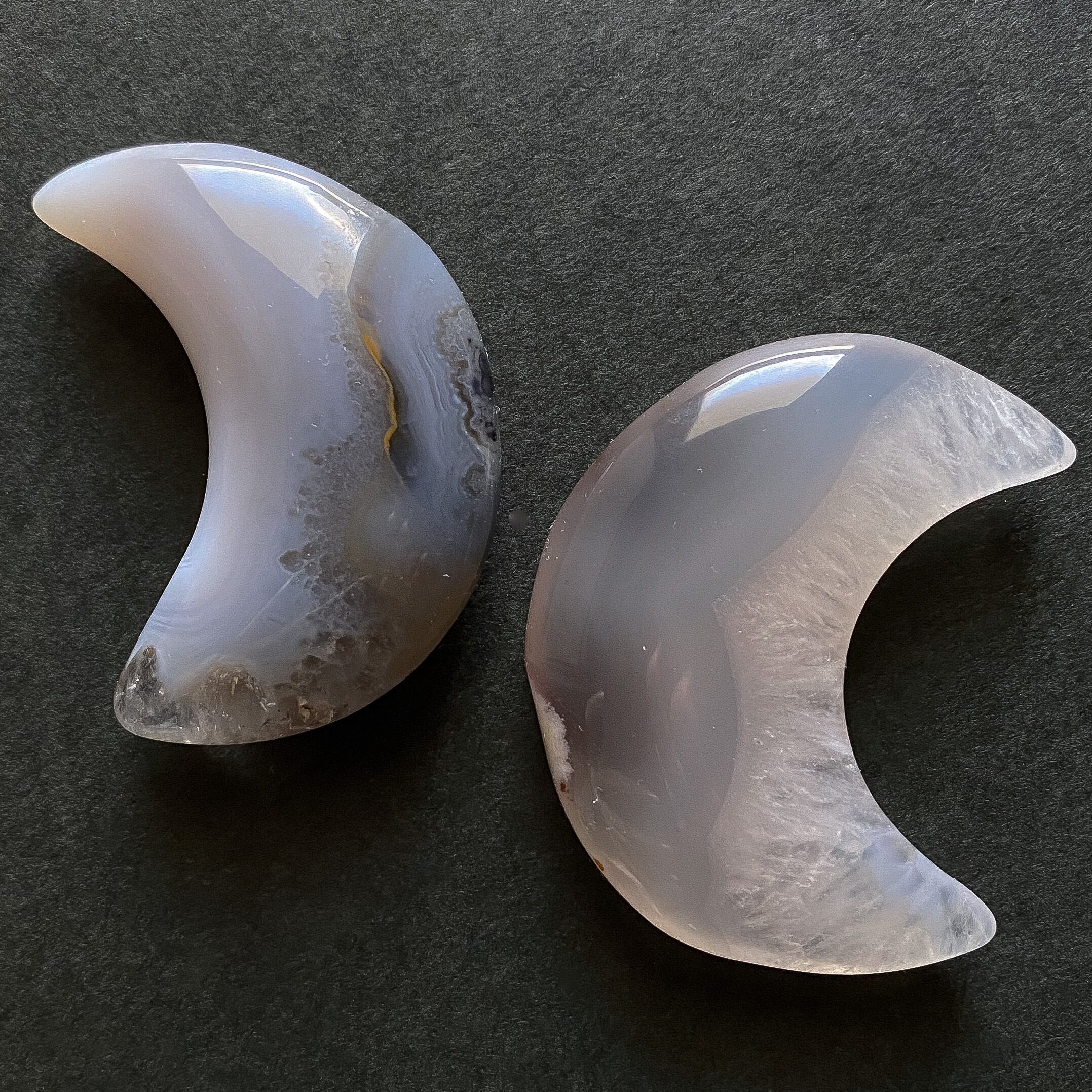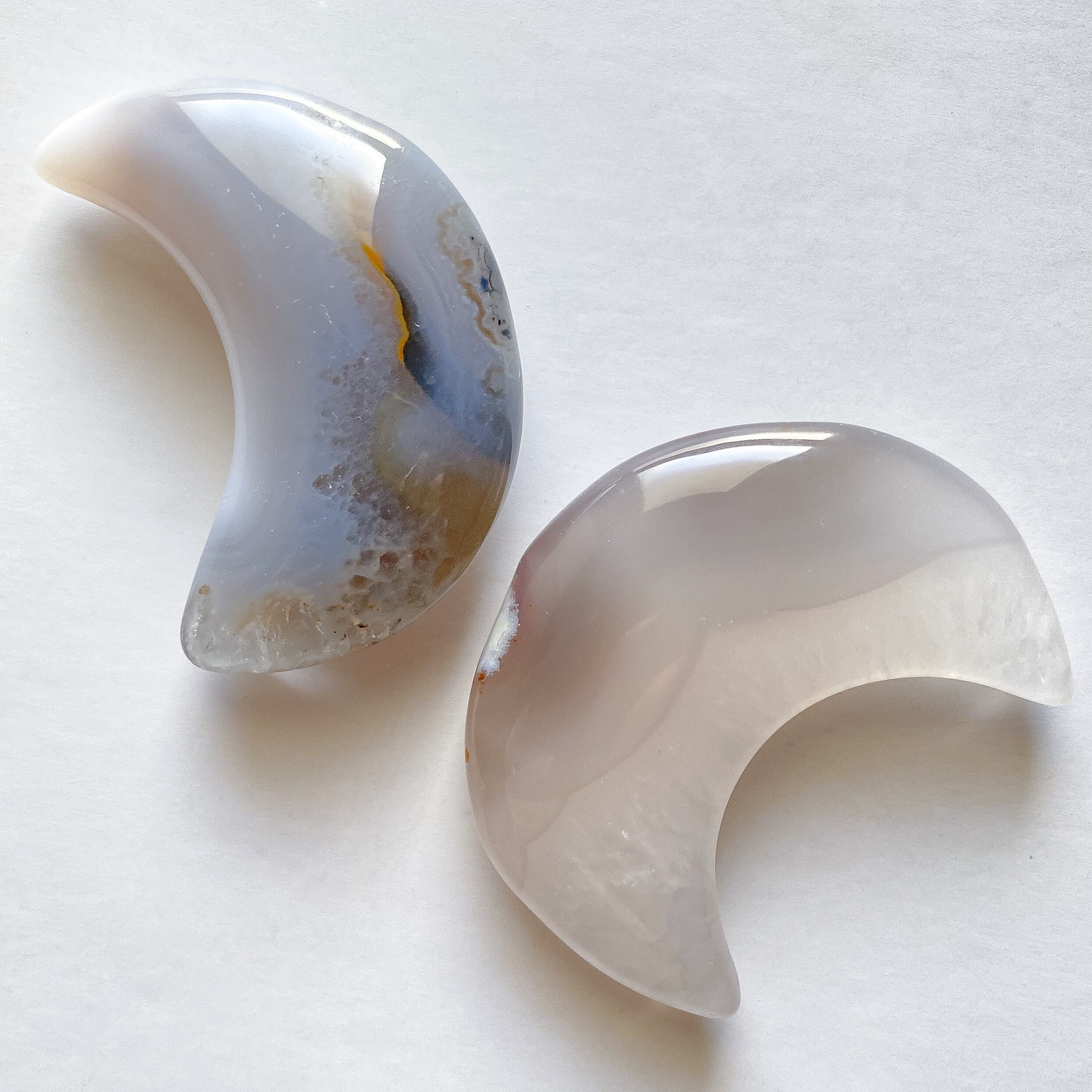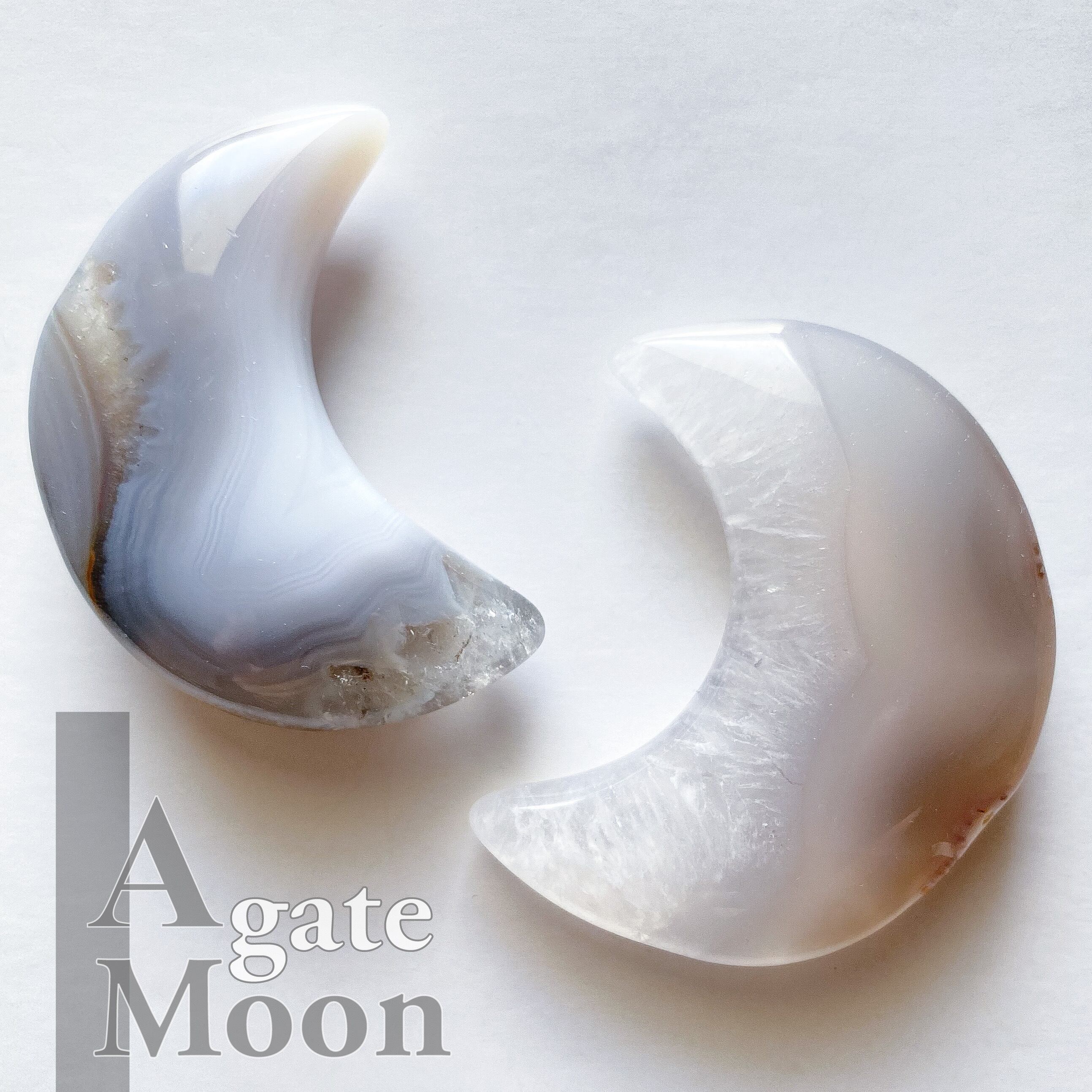 Bもクォーツ部分の入るムーンシェイプです。こちらは瑪瑙部分も含め全体的に半透明で地色は淡いグレーカラーとなります。背中の部分に瑪瑙のお花のような模様が入っているお月様です。
