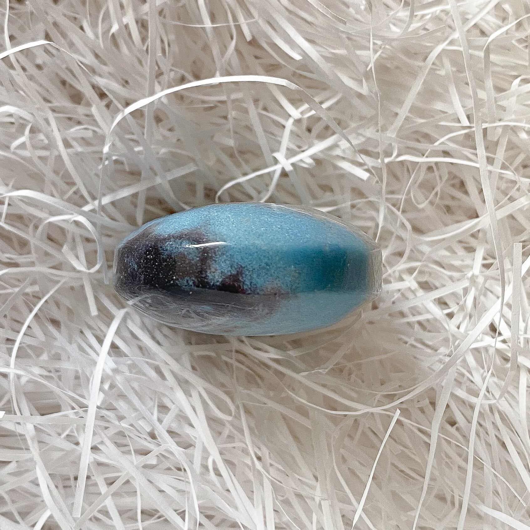 地色はミルキーな水色で、グラデーション状にブラウンやブラックなどの色が混じります。